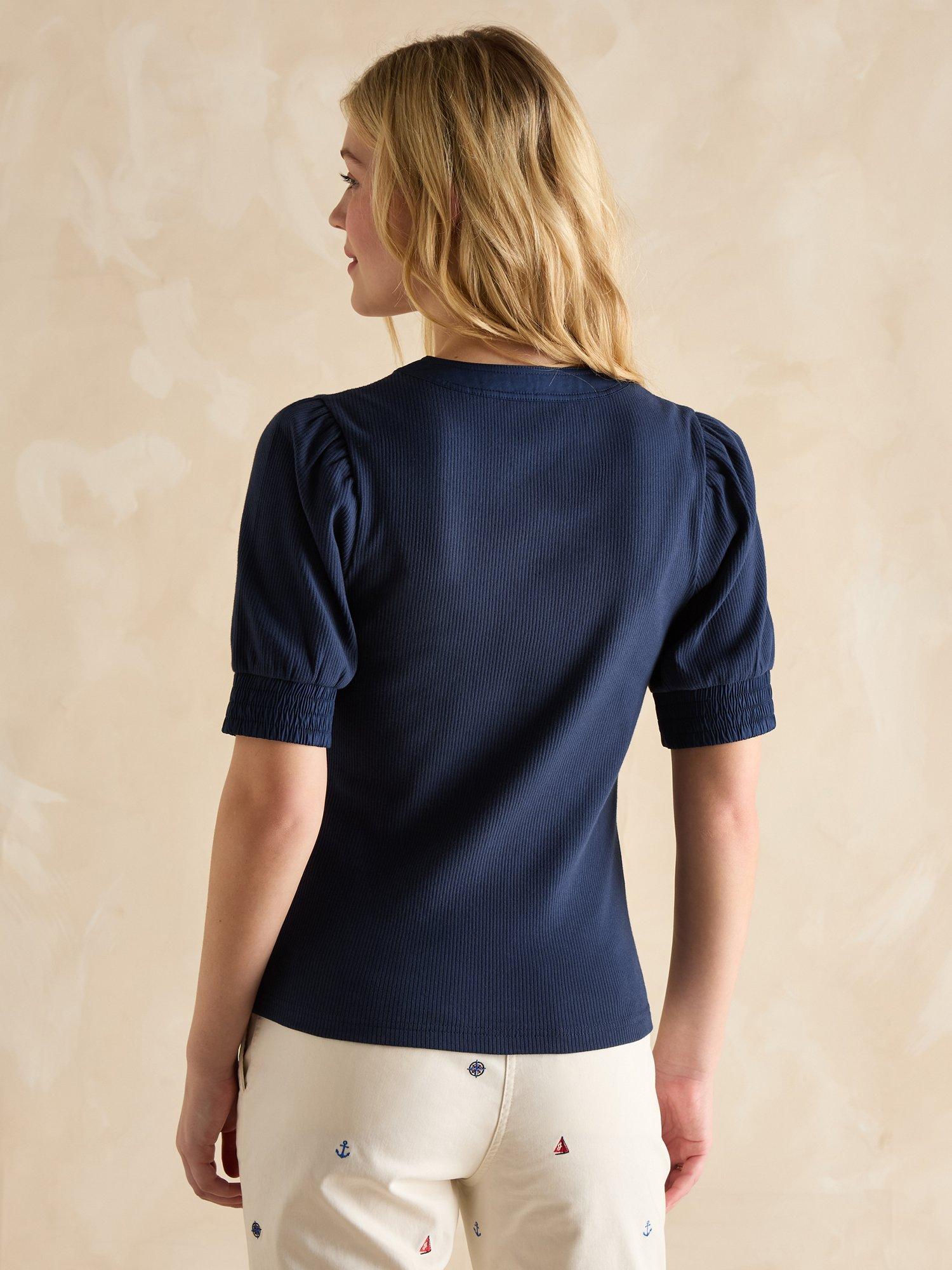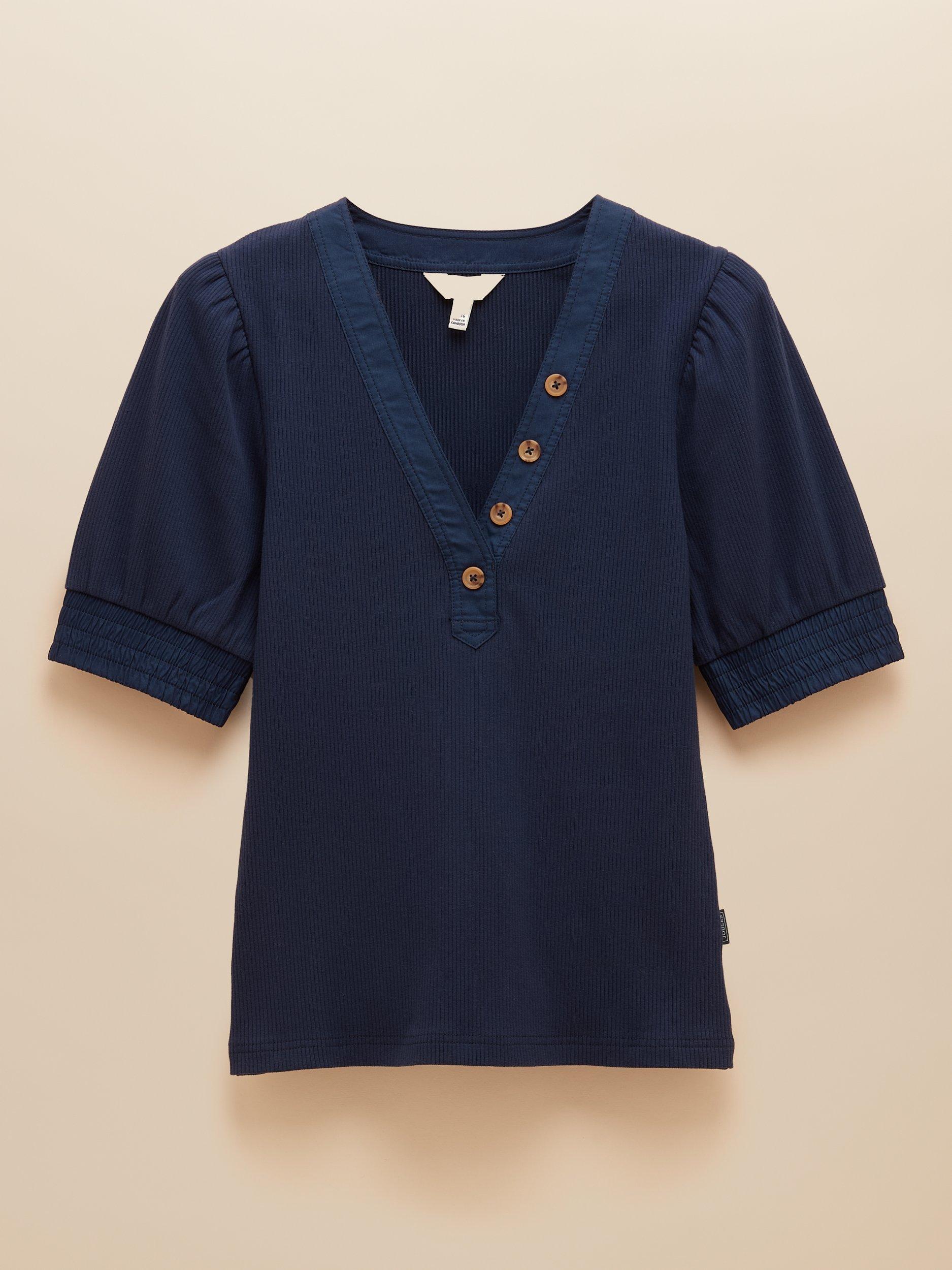 The Tabitha is an everyday style, elevated. It's made from a cotton blend, and the fabric is ribbed, adding stretch through the body and sleeves. The short puff sleeves and a V-Neck with non-functional button detail add a feminine touch. Elasticated ribbed cuffs finish it off and ensure a comfortable fit.