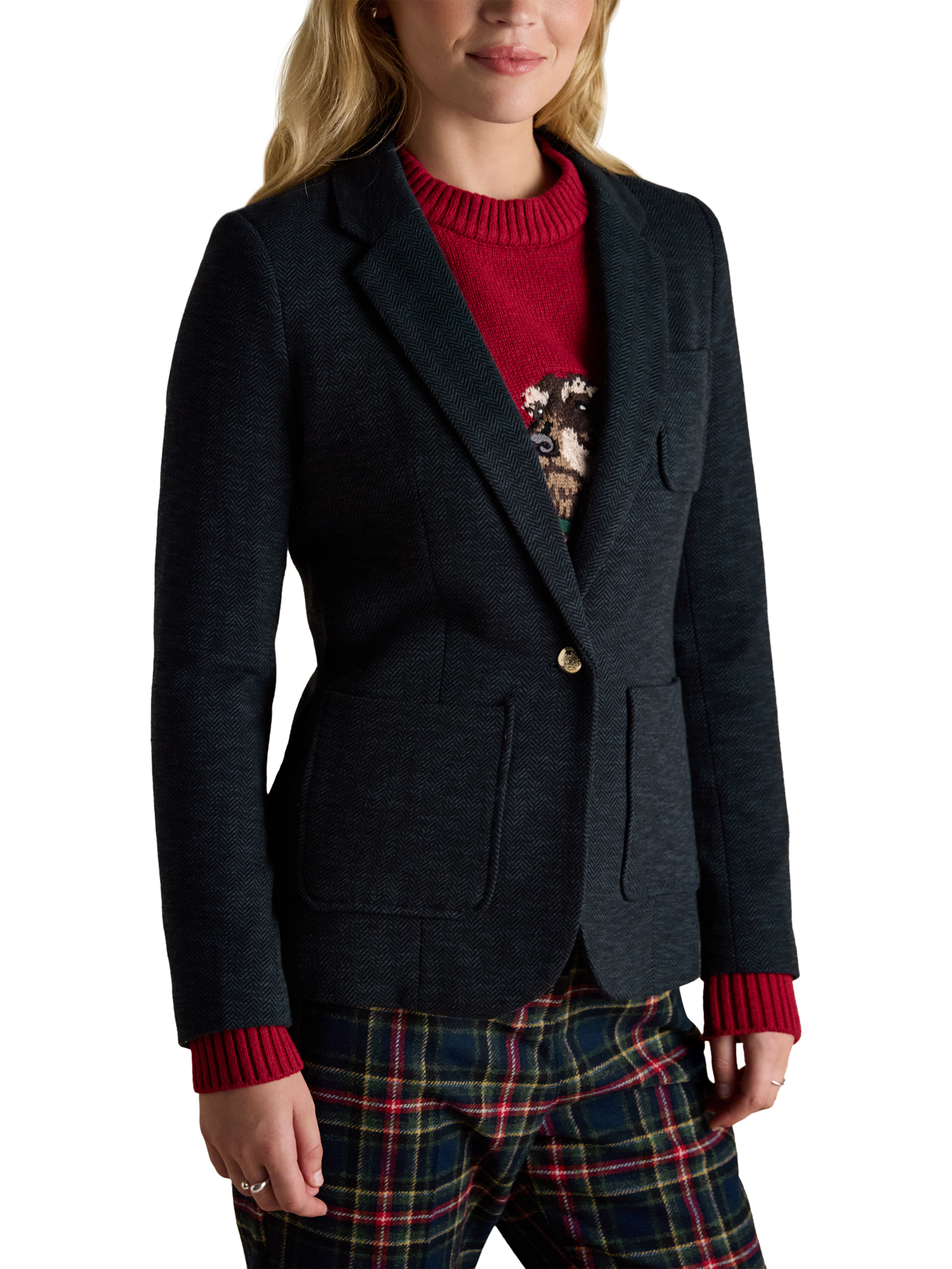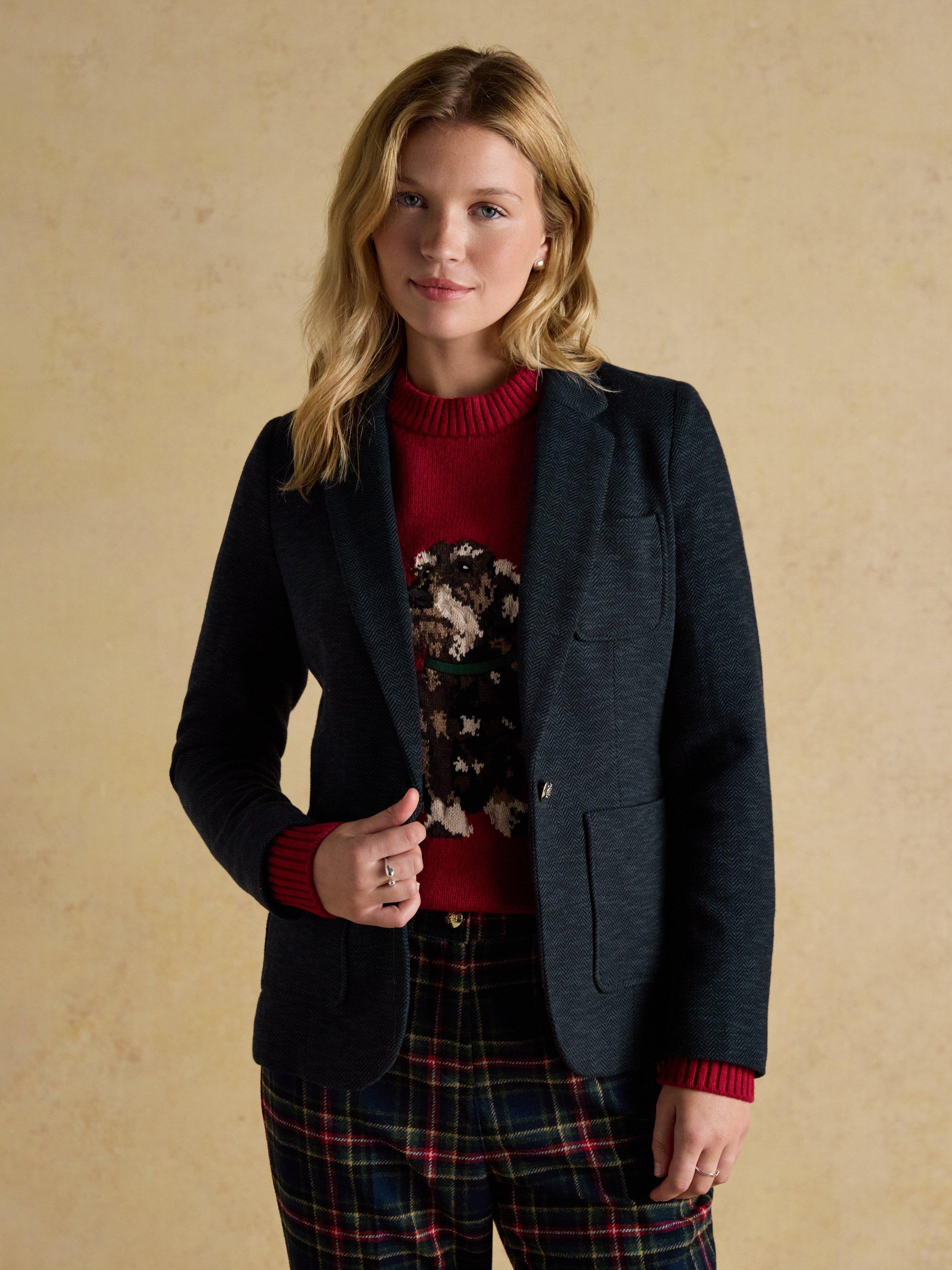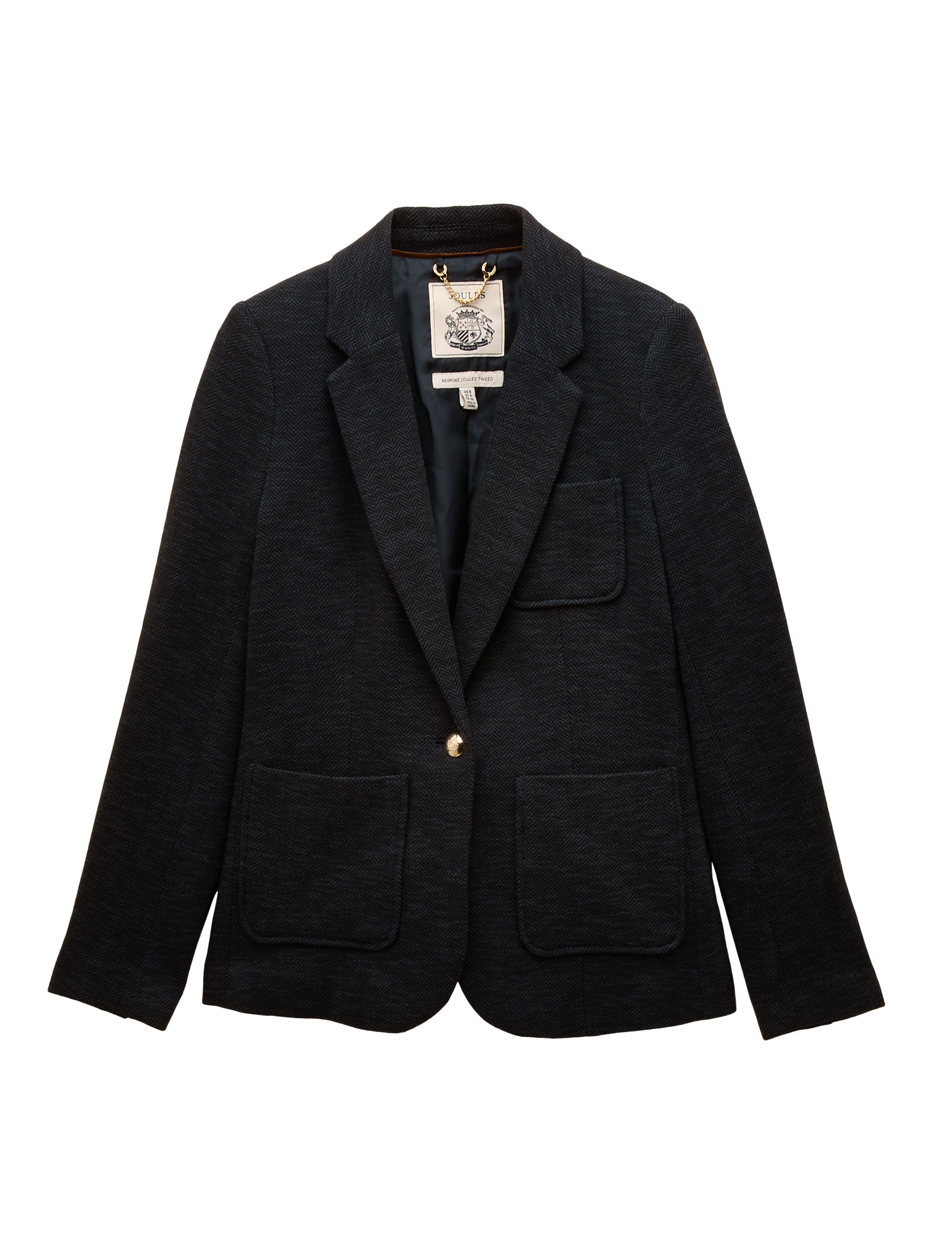 This preppy piece carries a collegiate appearance through its neat, structured fit, soft cotton jersey fabric and single-button fastening. It features two front pockets with a classic single chest pocket, kissing buttons to the cuffs and a lapel collar. The soft colour palette will elevate any outfit, while its subtle padding to the shoulders creates a feminine shape. It's finished with a chain hanging loop to the back neck and Joules branded undercollar embroidery, which is revealed when you pop the collar.