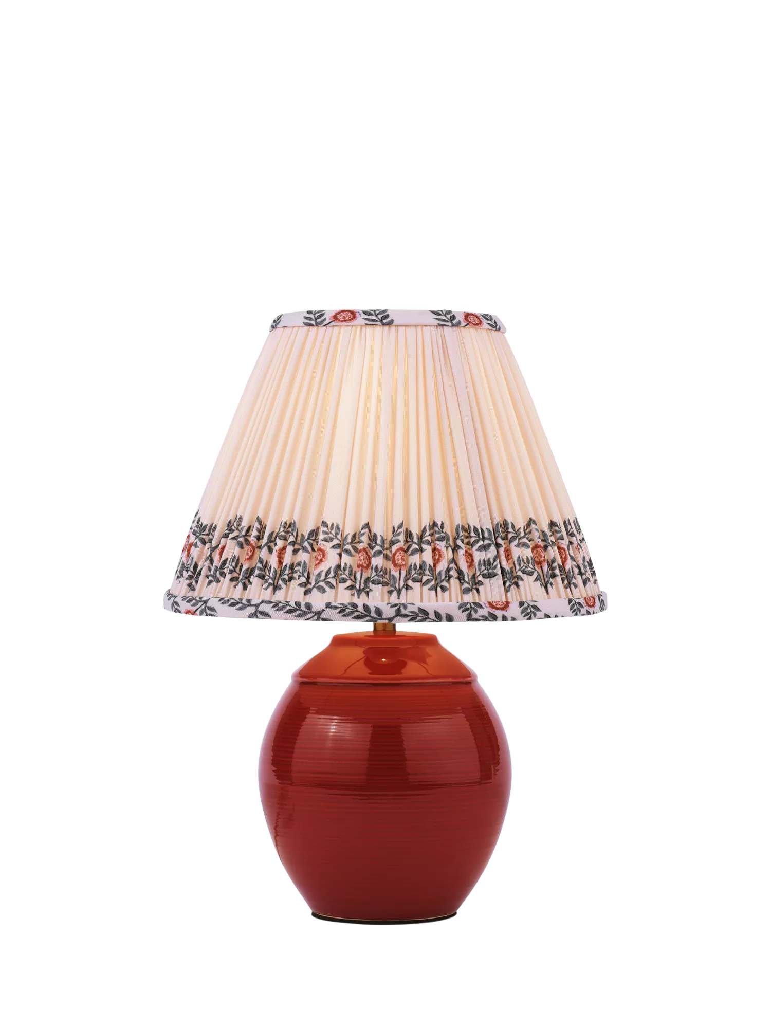 The lampshade features neat pleated detailing with a floral border for a vintage nod and creates an alluring glow in a room.