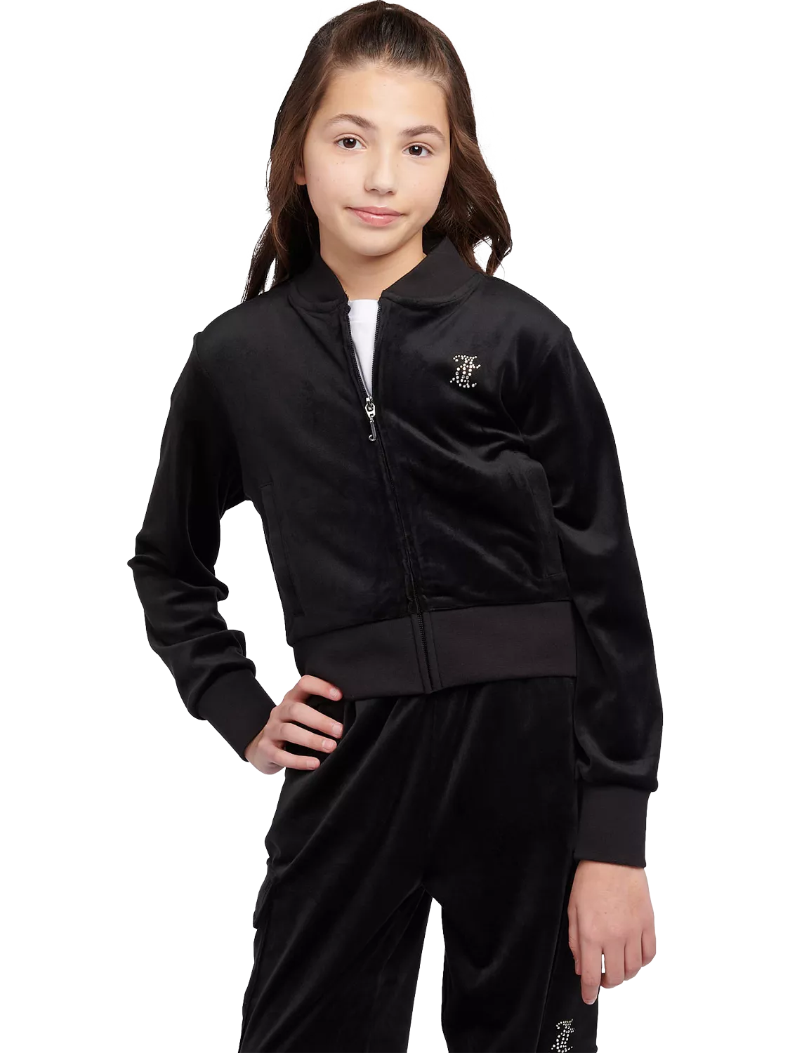 Elevate their casual wardrobe with this Juicy Couture Cropped Zip-Through Sweat. Crafted from soft velour, it offers a flattering cropped fit with a deep ribbed waistband. The sparkling diamante logo adds a touch of glamour, perfect for pairing with joggers or jeans for a chic and comfortable off-duty style.