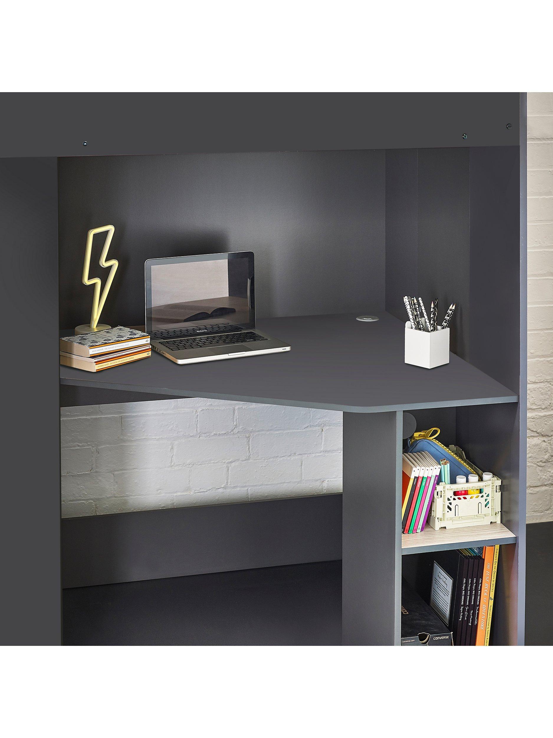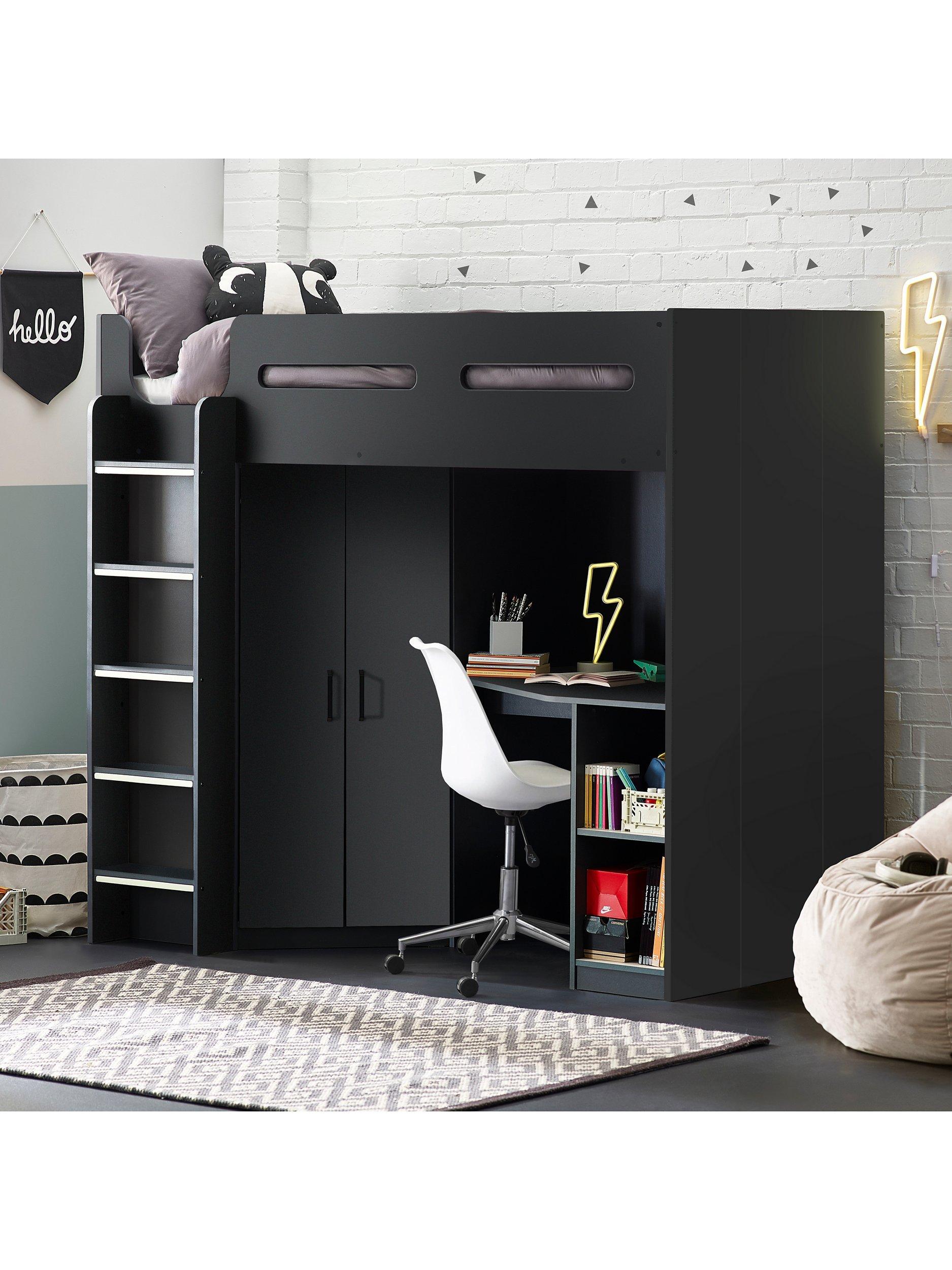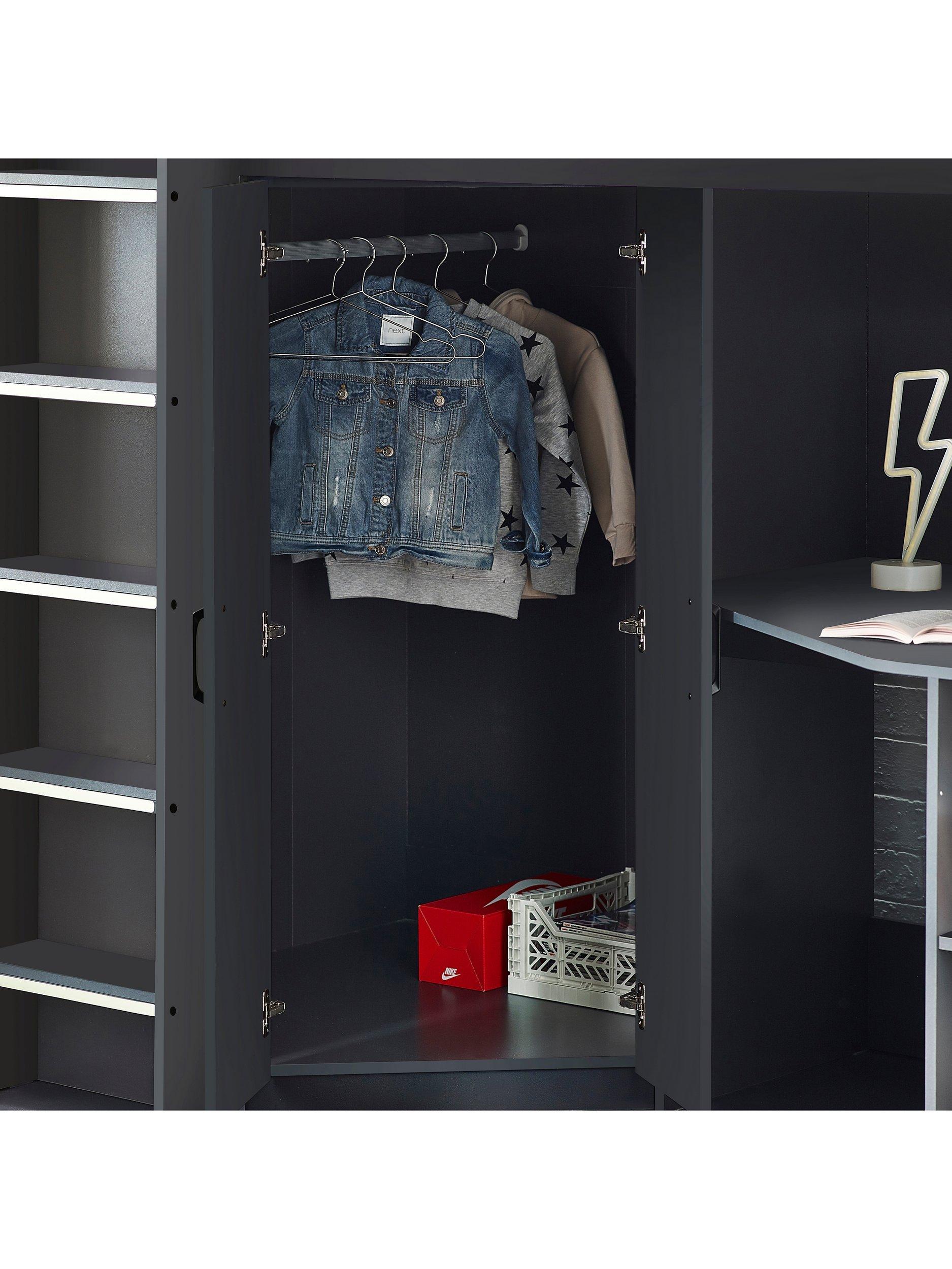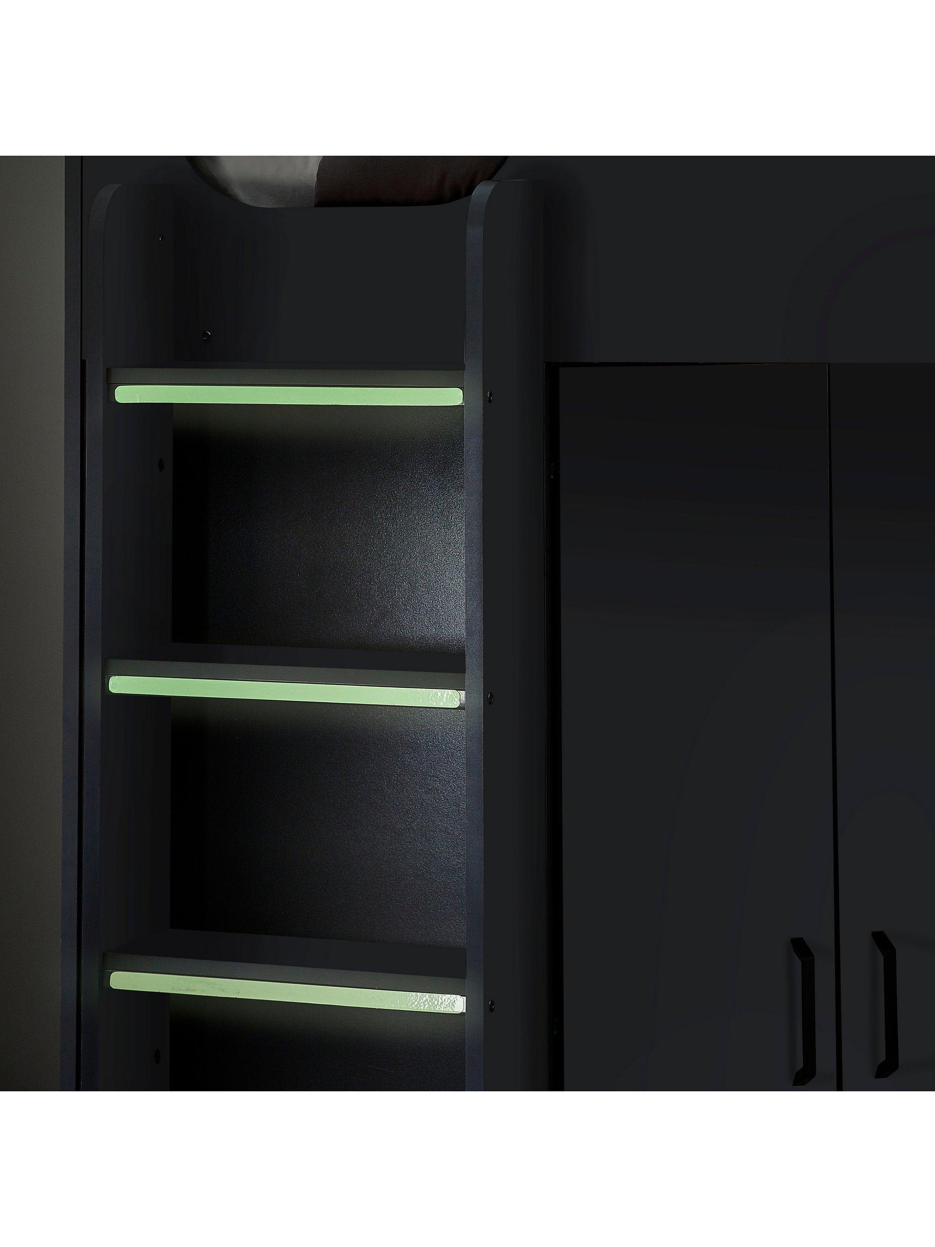 The angled wardrobe provides ample space for clothing, whilst the built-in shelving is great for all their files, folders, trainers, or games to stay organised. With glow-in-the-dark steps to help avoid accidents in the dark and a choice of colours, there is an option for any interior style.