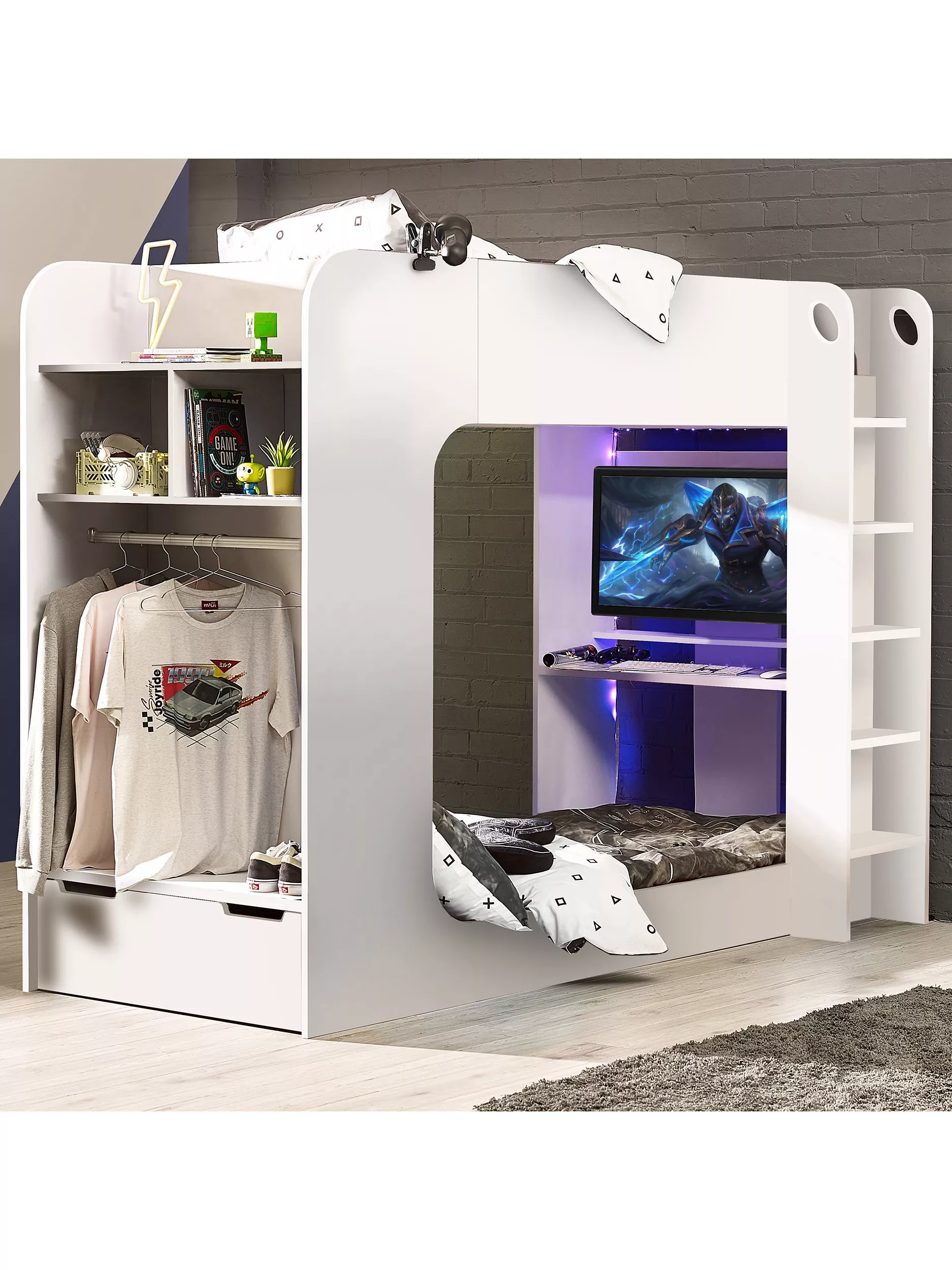 The Impact Gaming Bunk provides the perfect set-up for gamers, with a large underbed space and desk for a monitor. Featuring a hanging rail and multiple storage areas, this modern gaming bed provides the ideal space to sleep, play and stream.