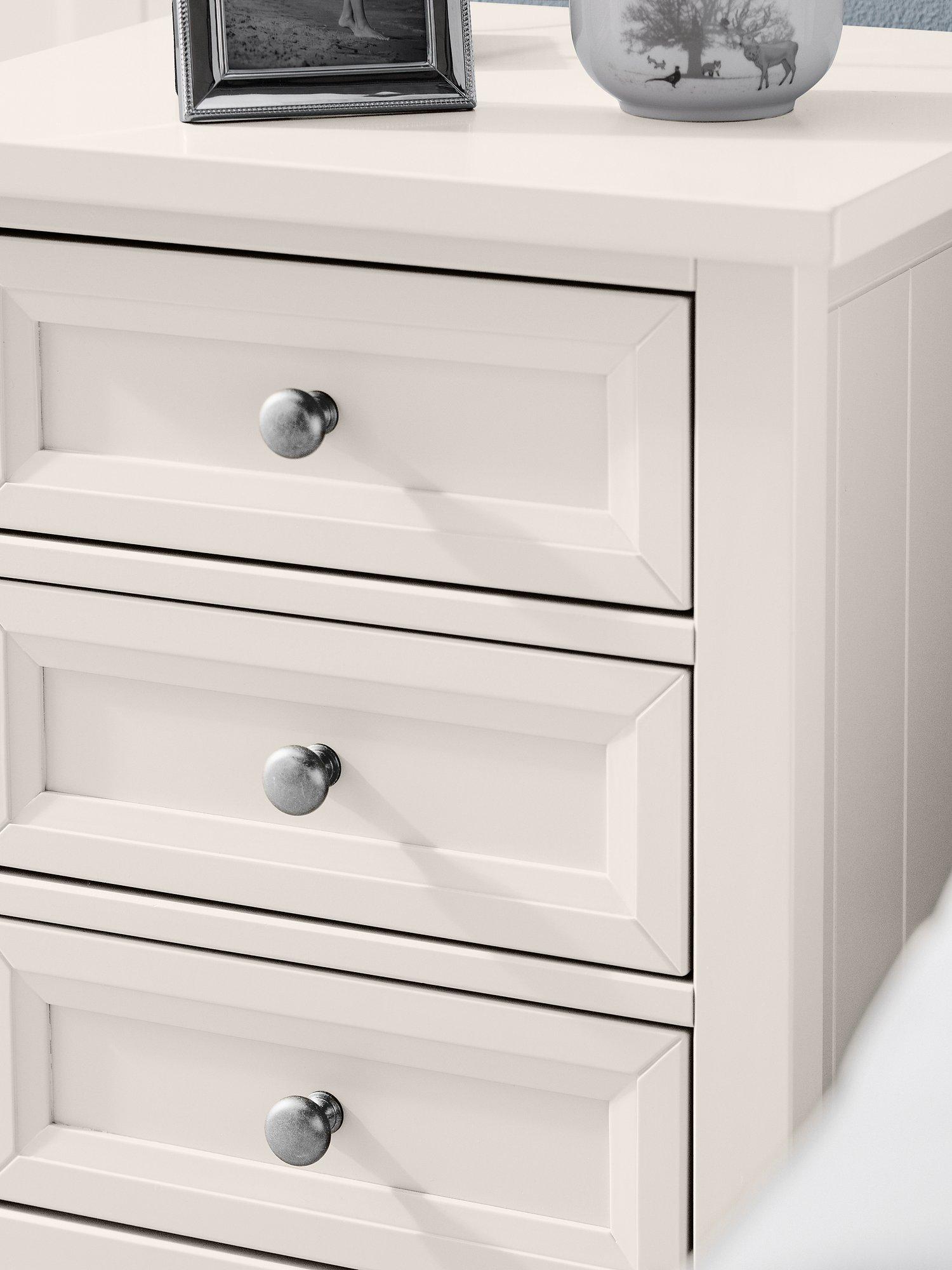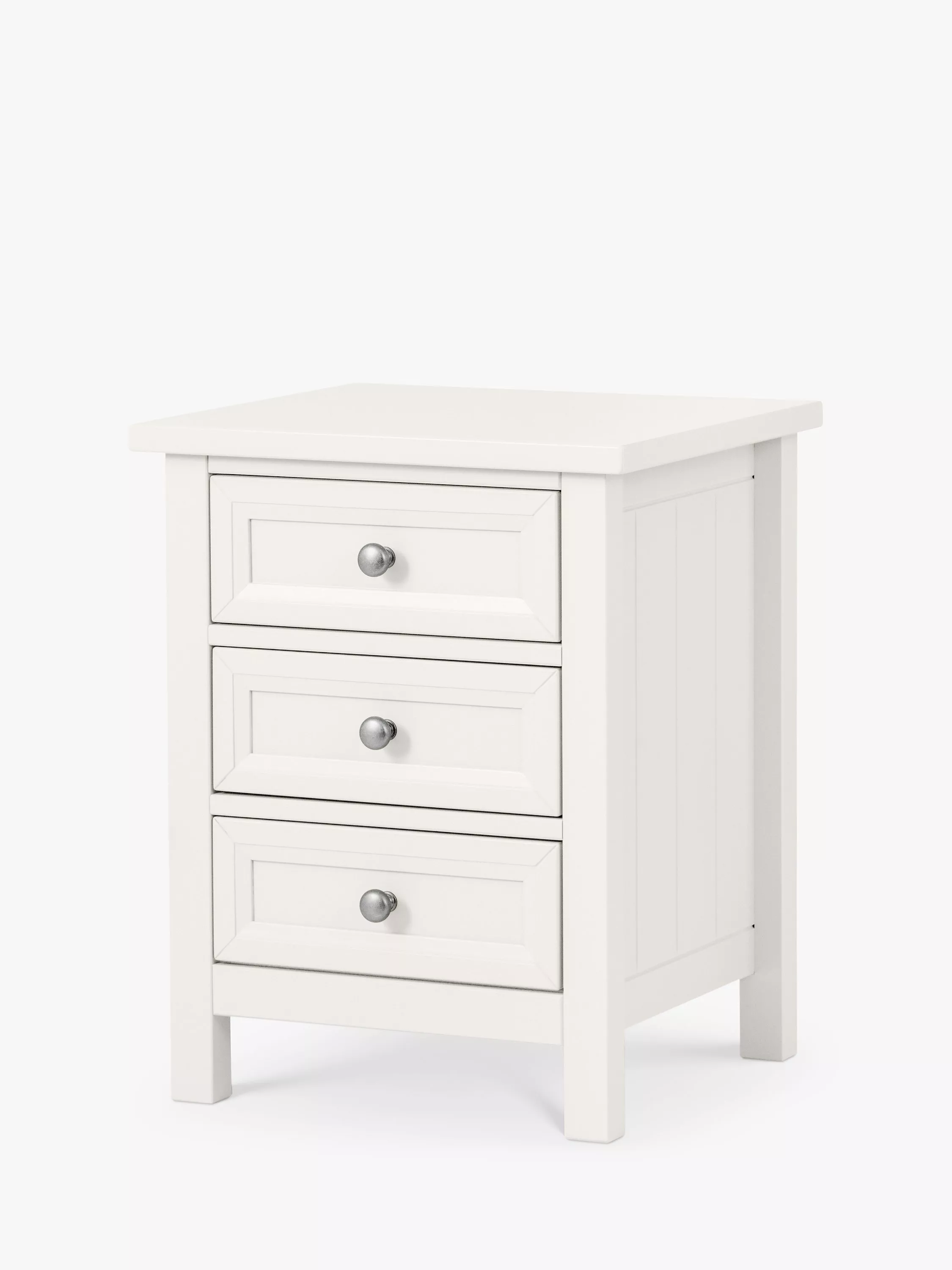 Maine is an elegant New England style range of bedroom furniture. The combination of exquisite surf white painted finish with characteristic side panelling and detailed chamfered cabinetry makes for a soothing and refined aesthetic with timeless appeal, while delicate pewter handles add the perfect finishing touch. The Maine 3 drawer bedside table provides ample space for your bedside essentials.
