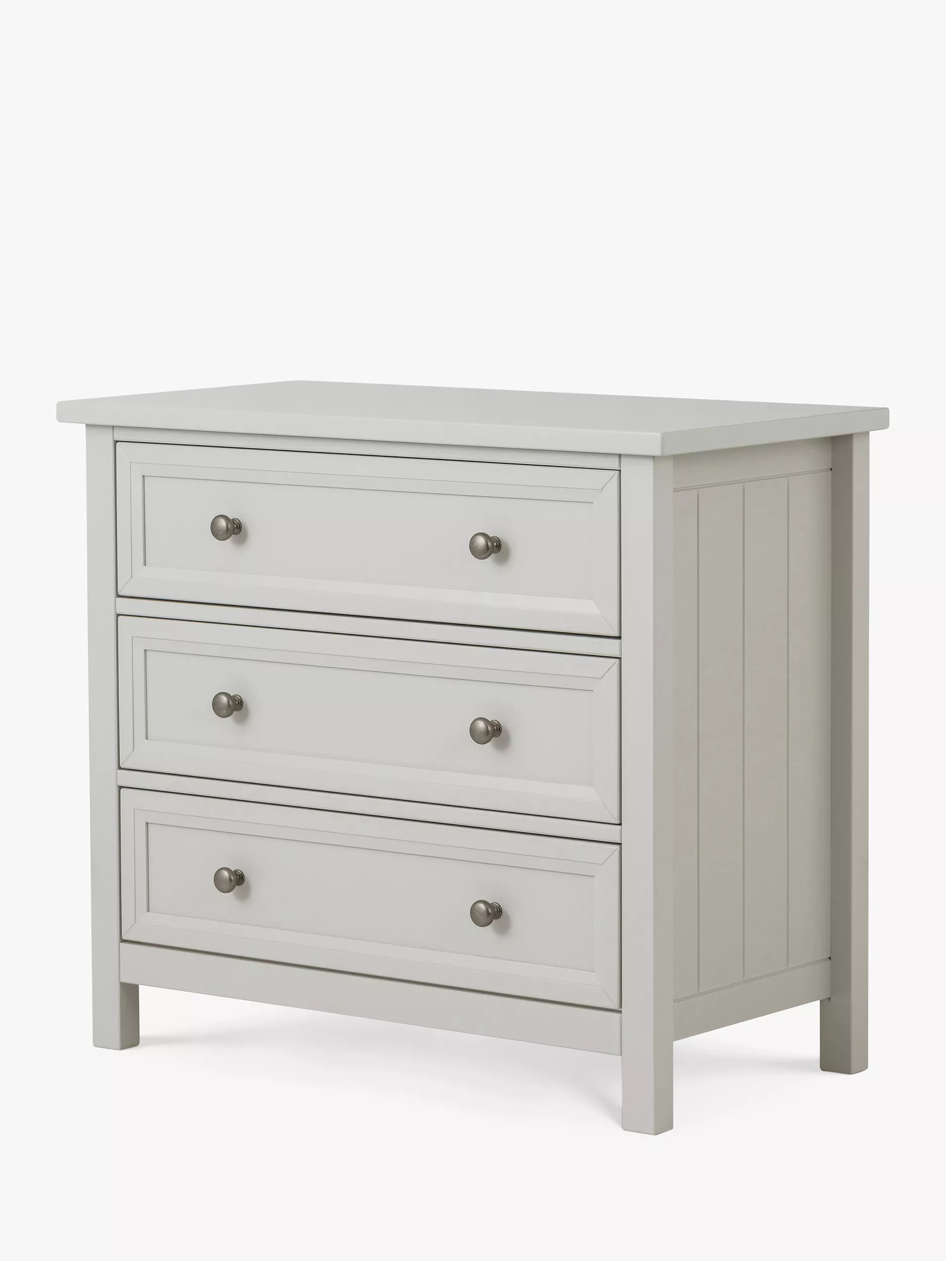 Maine is an elegant New England style range of bedroom furniture. The combination of exquisite dove grey painted finish with characteristic side panelling and detailed chamfered cabinetry makes for a soothing and refined aesthetic with timeless appeal, while delicate pewter handles add the perfect finishing touch. The Maine 3 drawer chest offers three large storage drawers.
