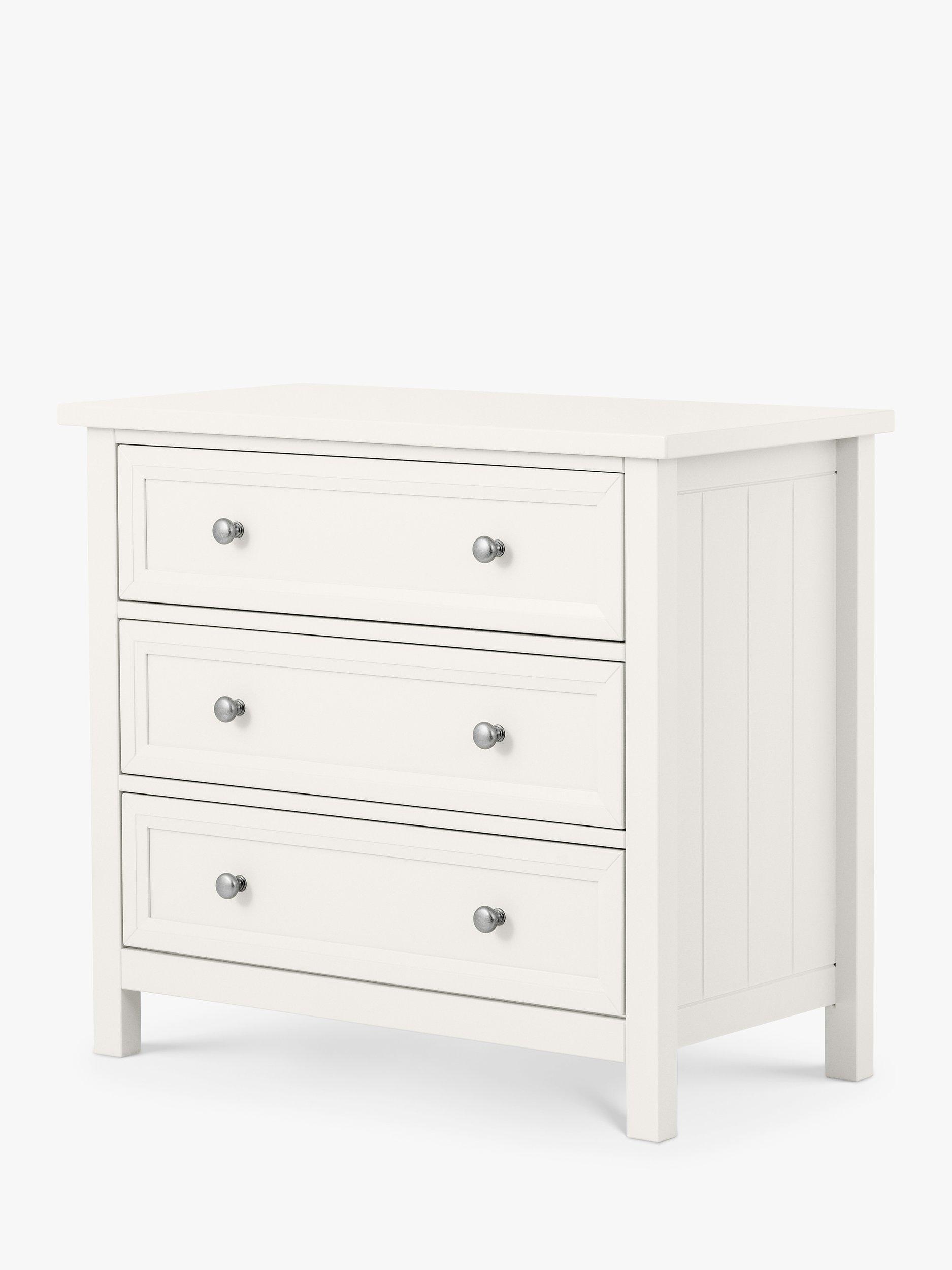 Maine is an elegant New England style range of bedroom furniture. The combination of exquisite surf white painted finish with characteristic side panelling and detailed chamfered cabinetry makes for a soothing and refined aesthetic with timeless appeal, while delicate pewter handles add the perfect finishing touch. The Maine 3 drawer chest offers three large storage drawers.