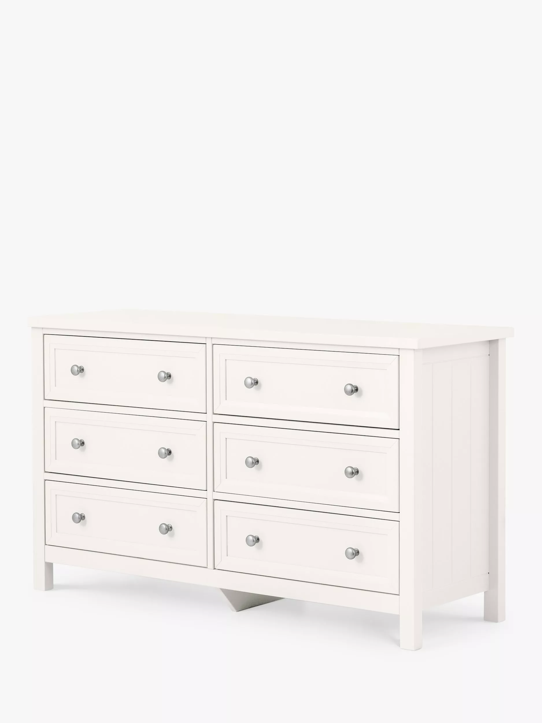 Maine is an elegant New England style range of bedroom furniture. The combination of exquisite surf white painted finish with characteristic side panelling and detailed chamfered cabinetry makes for a soothing and refined aesthetic with timeless appeal, while delicate pewter handles add the perfect finishing touch. The Maine 6 drawer wide chest offers copious amounts of storage and can also be used as a dressing table.