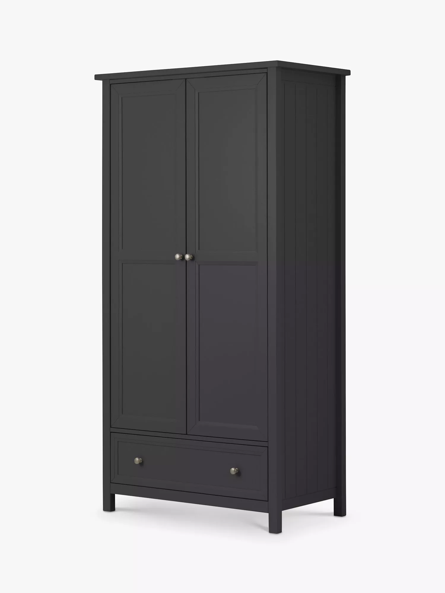 Maine is an elegant New England style range of bedroom furniture. The combination of exquisite dove grey painted finish with characteristic side panelling and detailed chamfered cabinetry makes for a soothing and refined aesthetic with timeless appeal, while delicate pewter handles add the perfect finishing touch. The Maine double wardrobe has a storage drawer underneath so there's plenty of space for your clothes.