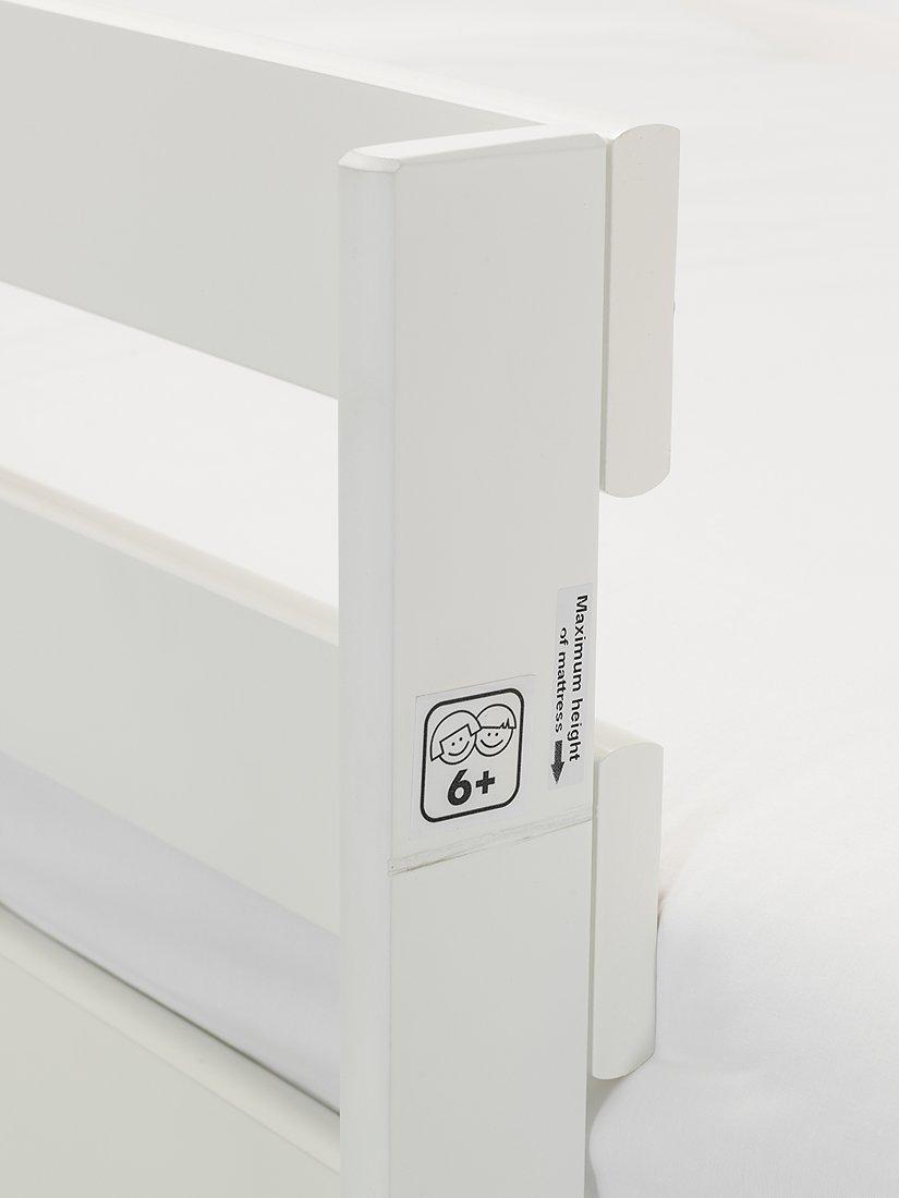 This bed has been tested to British Standards BS EN: 747. It's suitable for children 6 years+. The solid slats in this bed frame provide a firm and more supportive base for their mattress. The compatible single mattress (L190 x W90cm) should have a maximum height of 15cm and is sold separately.