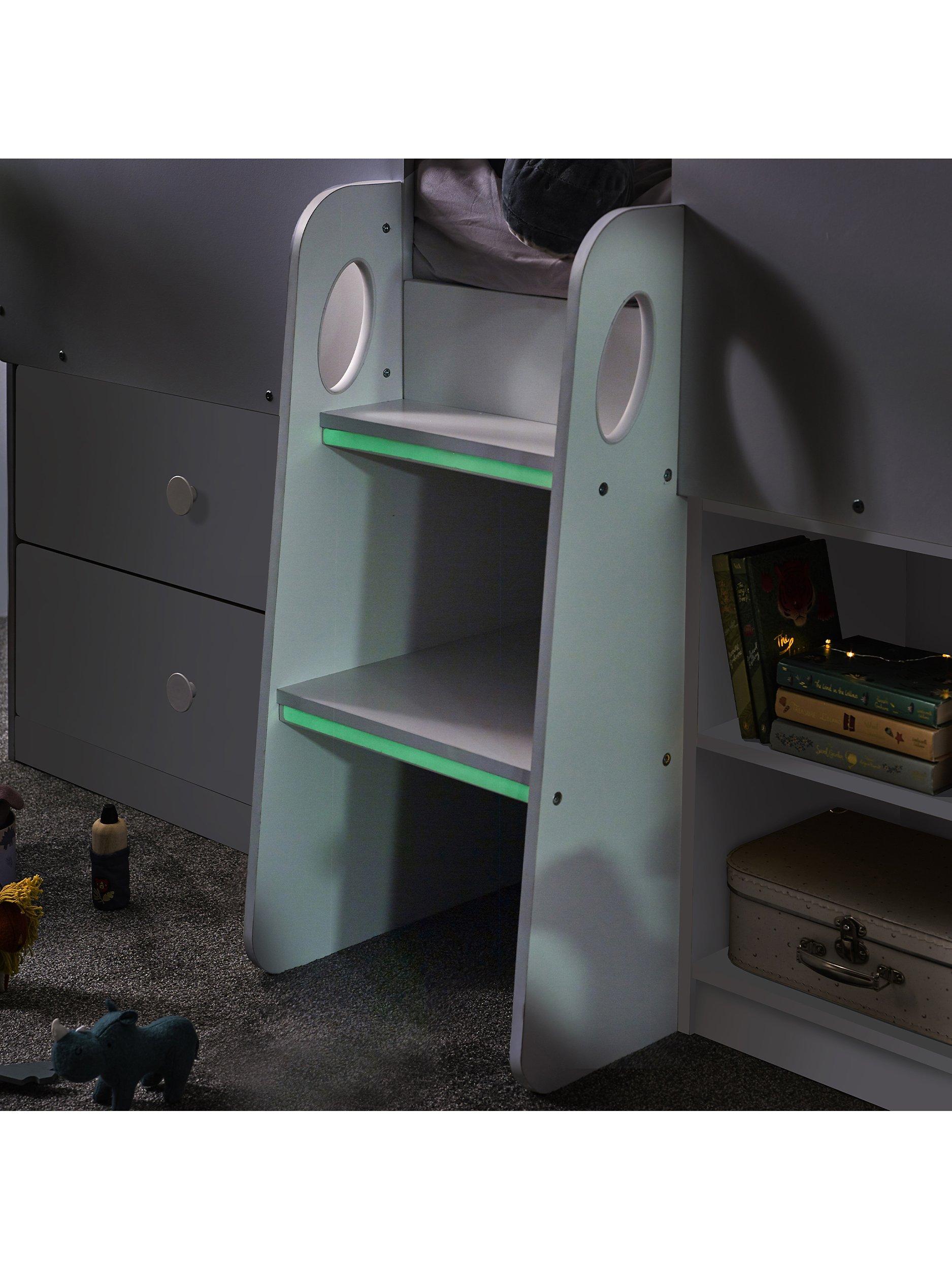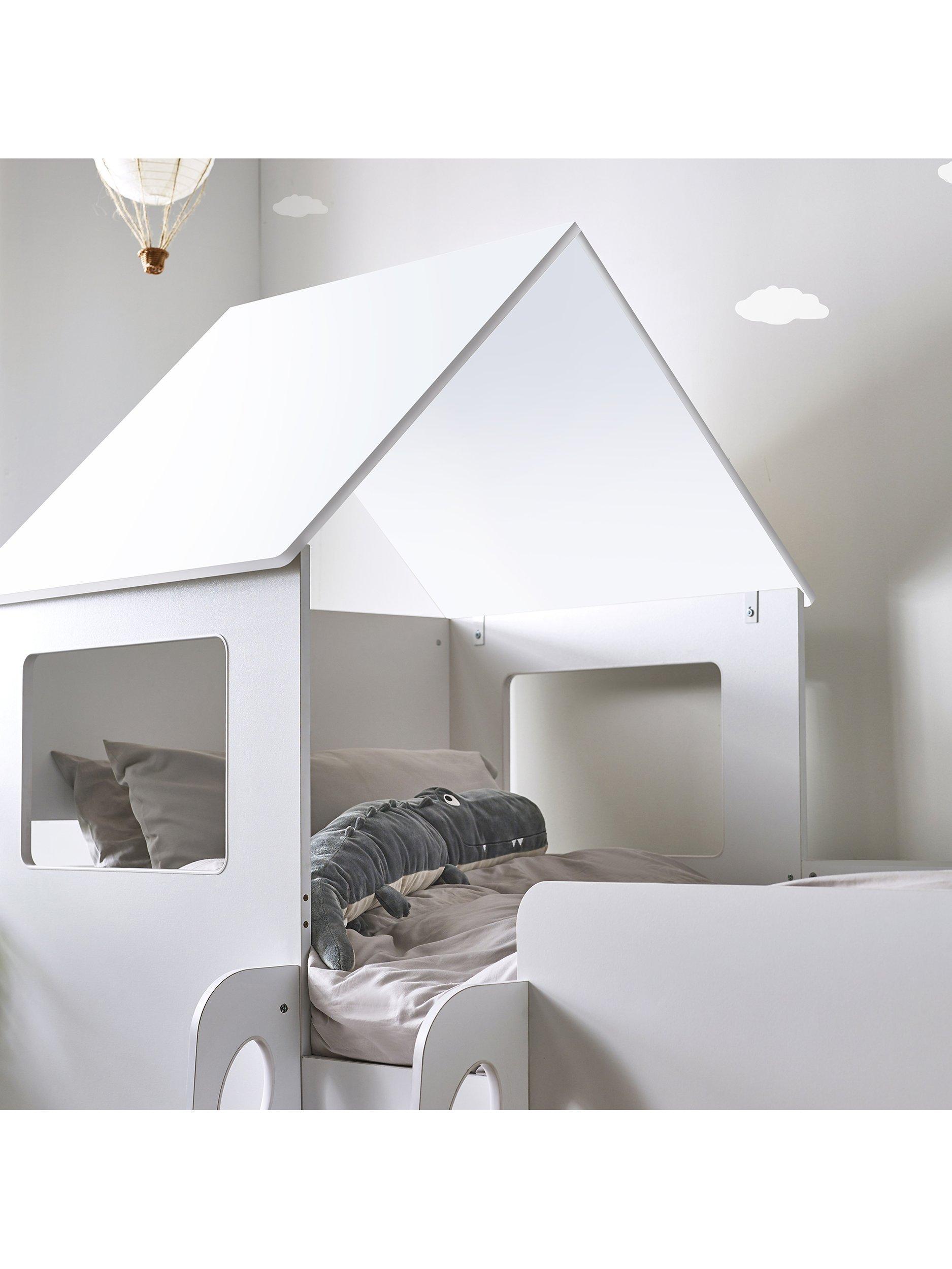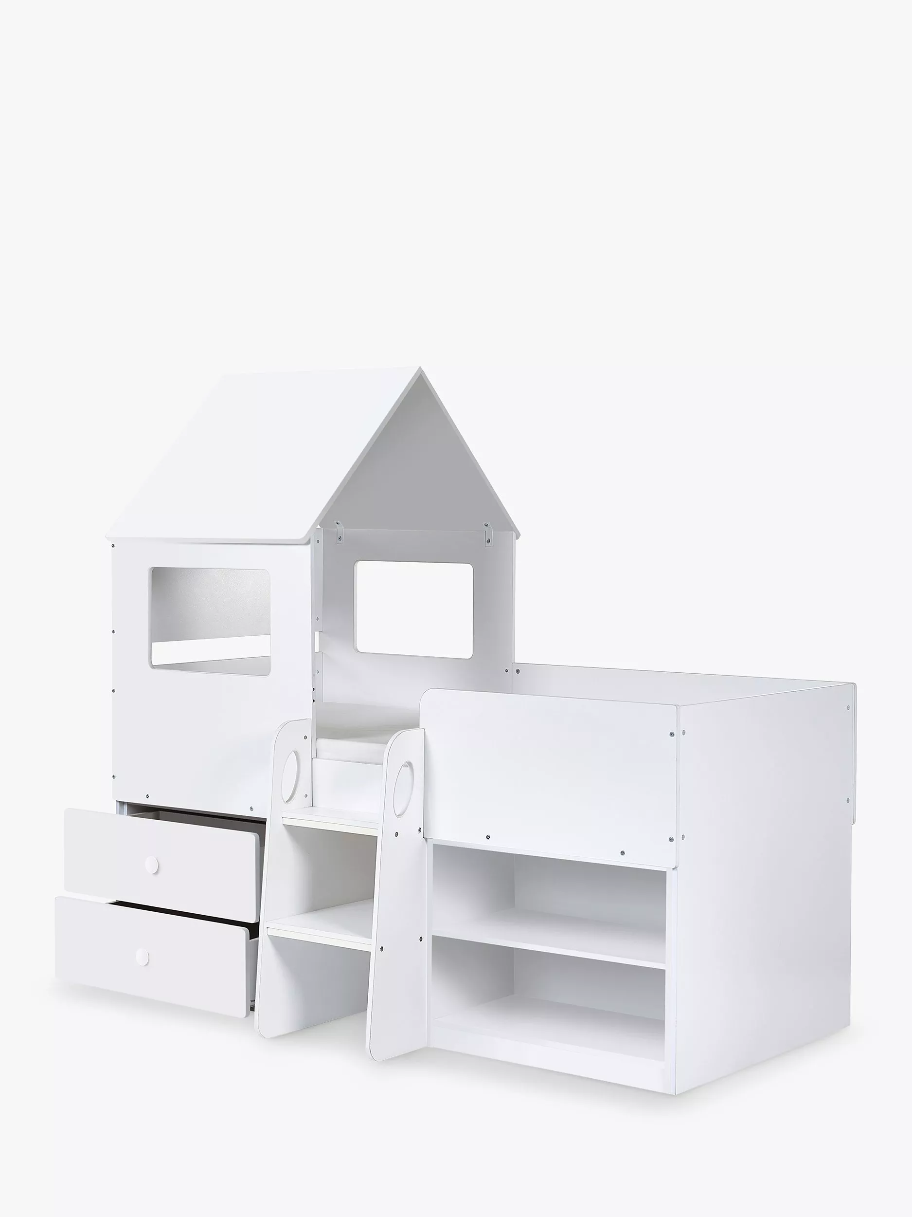 The bed offers two pull-out drawers and opened shelving creating perfect ample space for toys and other necessities, plus a two-step study glow-in-the-dark ladder. Then on top a wonderful roof with two opened windows on each side providing the perfect cosy bed that your little one has always dreamed of.