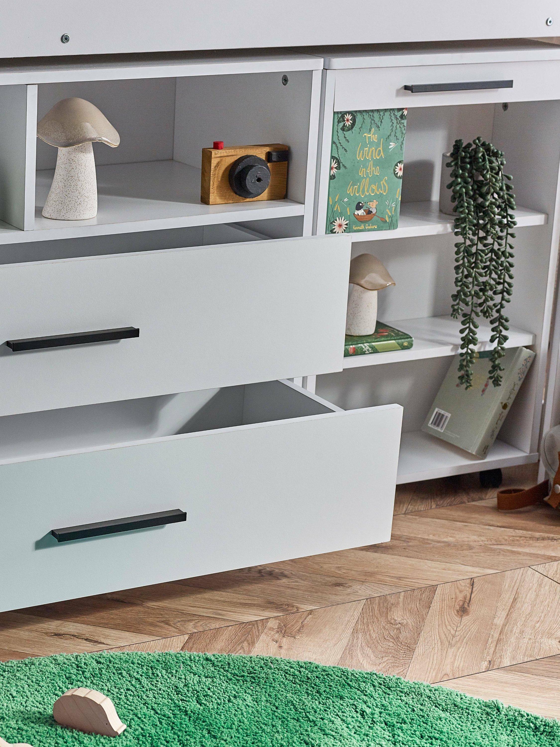 The crisp all-white finish sets a clean and modern tone, plus it features 2 pull-out drawers with handles for convenient storage and shelving underneath for toys and essentials.