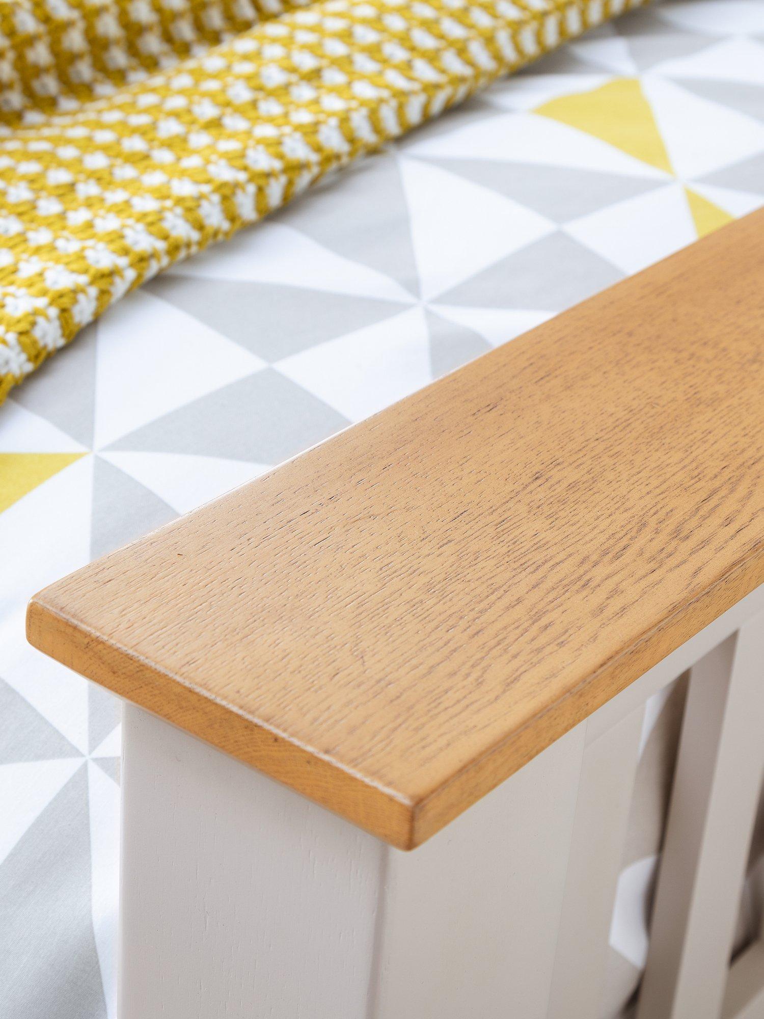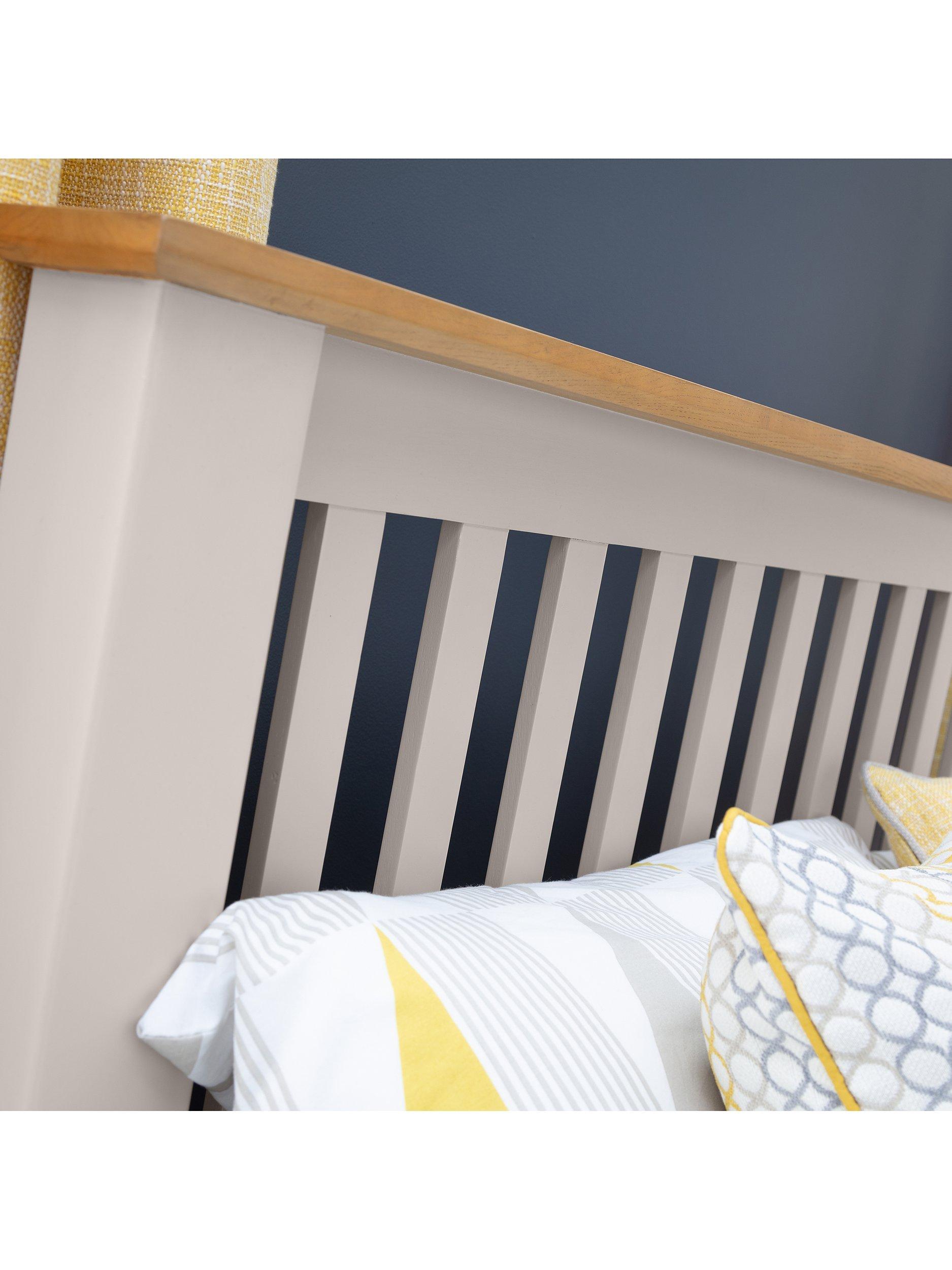 Finished in elephant grey paint, the Richmond bedroom range is a timeless, elegant design suitable for a wide range of décor. Constructed from white oak and oak veneers, this painted bedroom range brings a modern twist on a traditional construction. The Richmond double bed features a sprung slatted base to ensure supreme comfort.