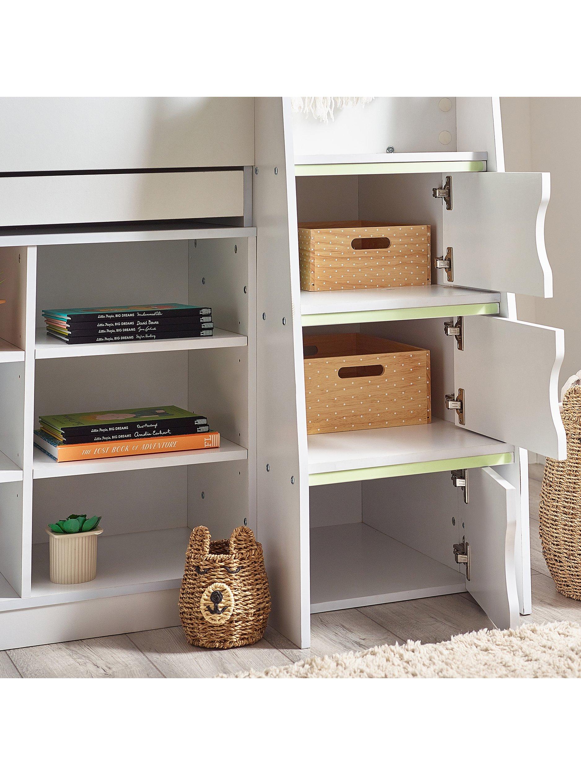 The Vespa Midsleeper is the perfect space saver for kids' and teenagers' bedrooms. With a neutral-painted finish, the mid-sleeper features cupboards, multiple shelves and a pull-out desk. The robust ladder contains beautiful handles, with glow-in-the-dark strips added for safety.