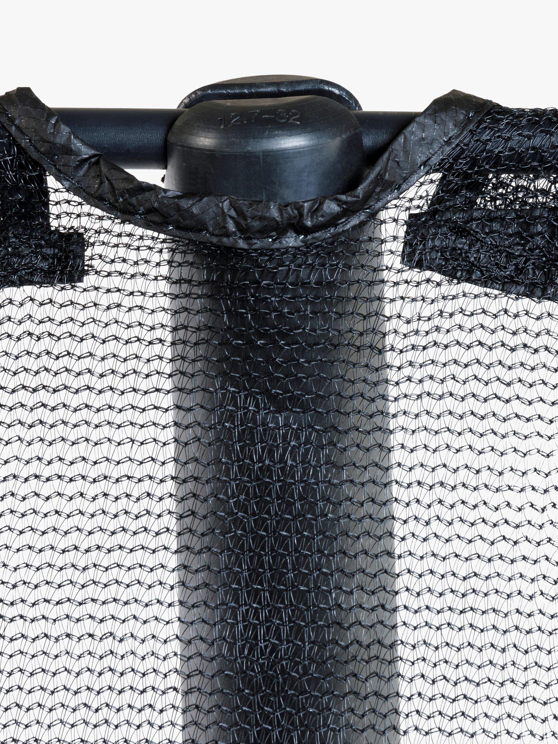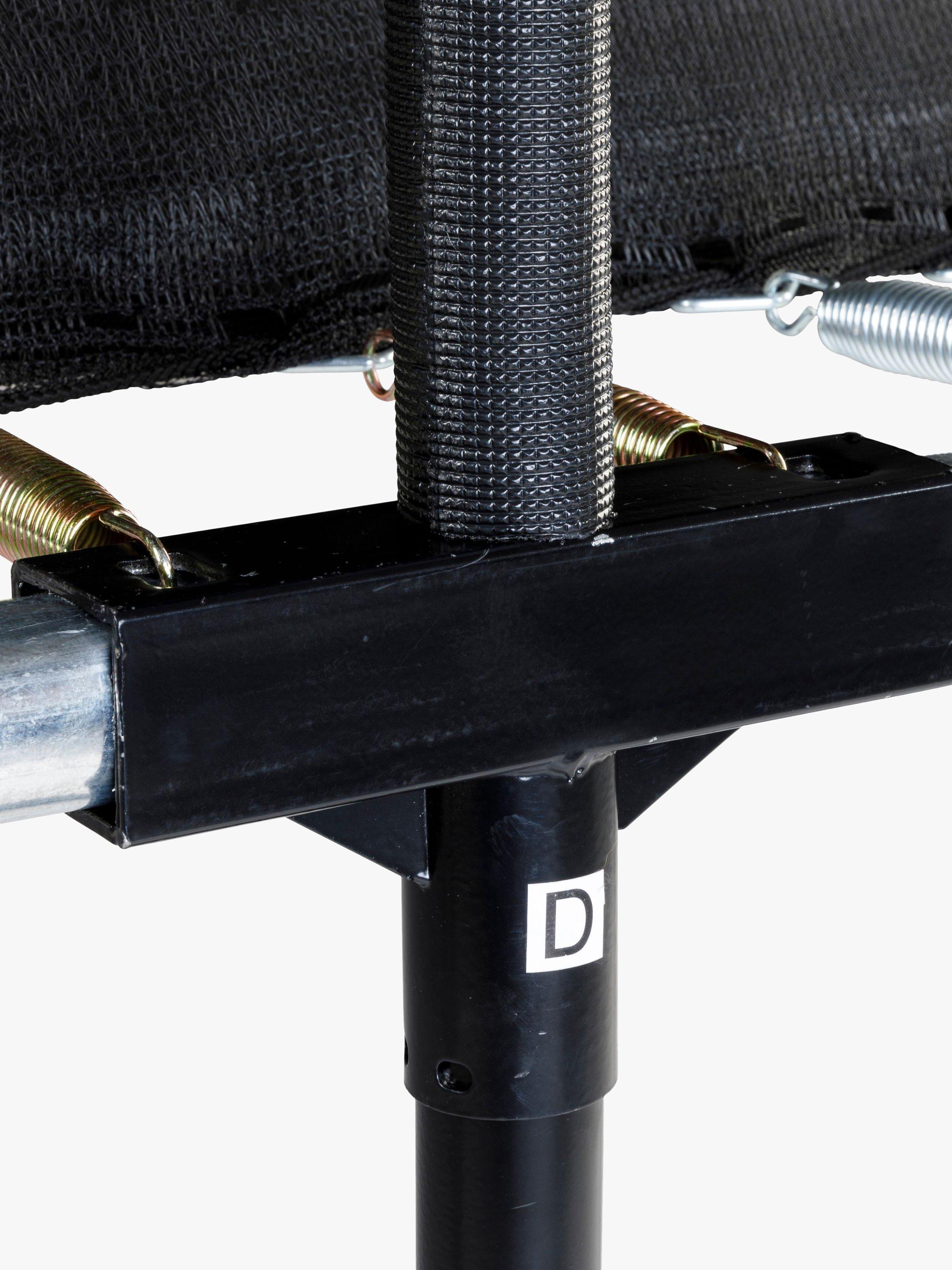 The POD connector connects the enclosure pole, black powder coated leg and galvanised steel top rails all directly into one socket, so no bolts are needed. A shatter proof patented G3 rod at the top of the netting creates a neat and sturdy enclosure. XPE foams around the enclosure poles have a long lasting UV rating and are more resilient to moisture. The EuropSpring design attaches to the top and under side of the frame and provides a better, bigger bounce. Springs are covered by the hard wearing laminated vinyl padding in black with 20mm thick foam for added protection.