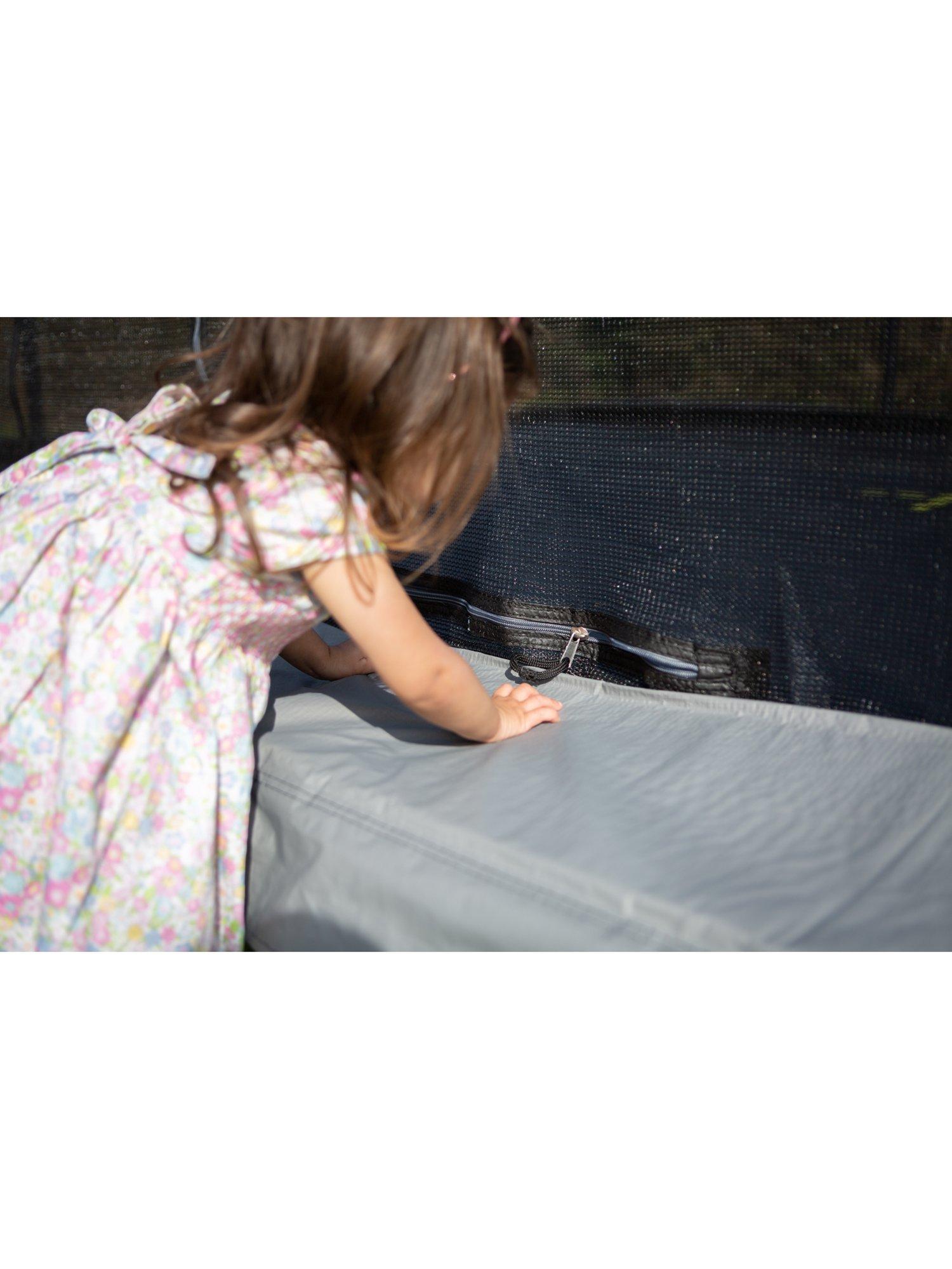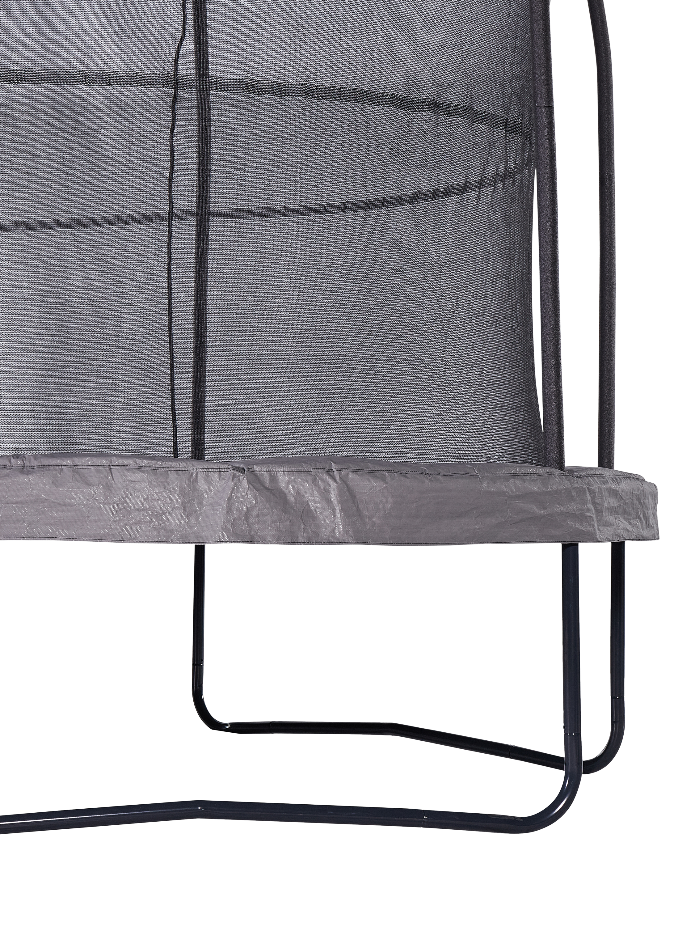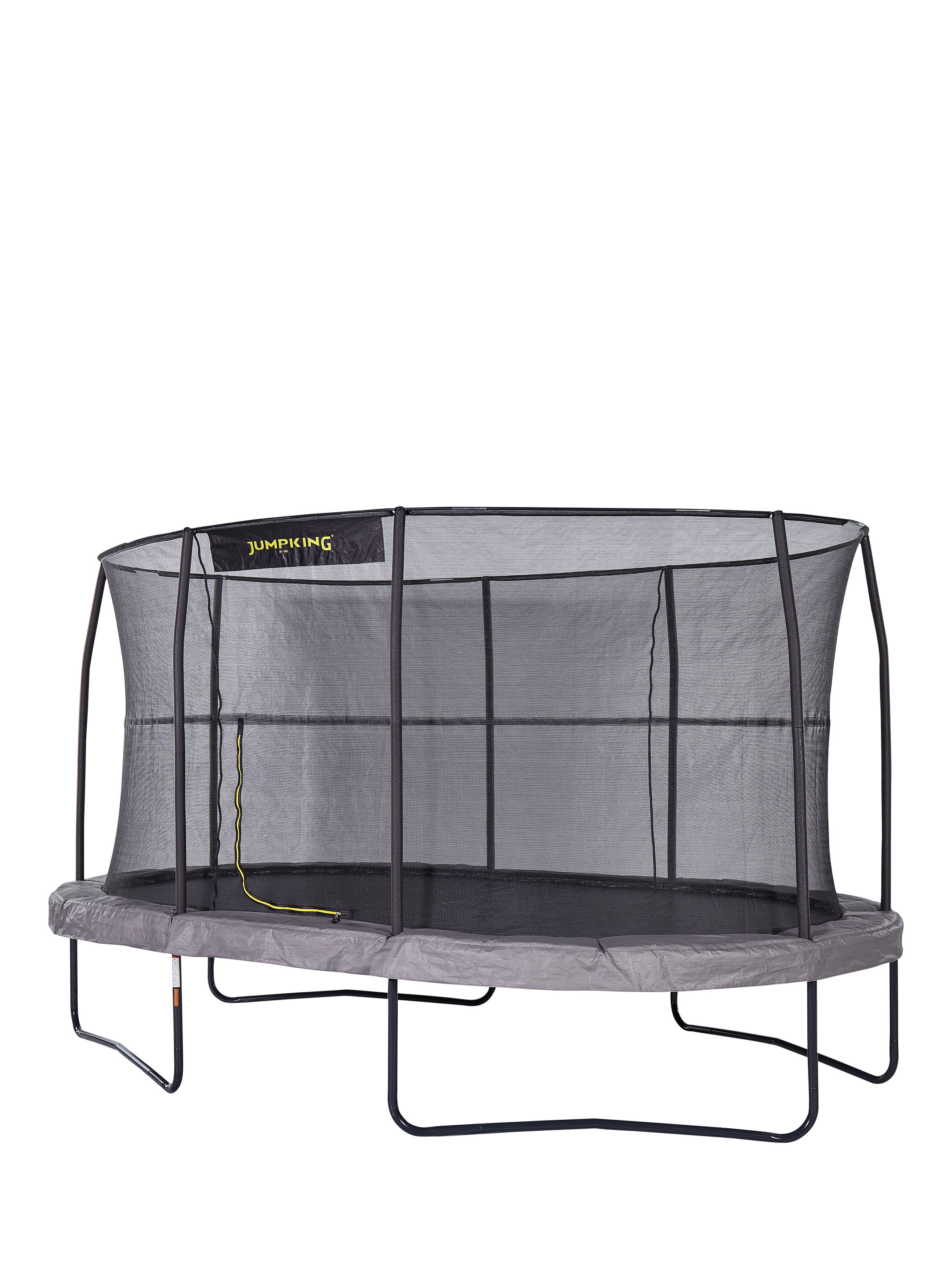 The largest oval of this range comes with a ladder and anchor kit accessories, a grey powder-coated frame, a JumpKing logo on the netting and foams to protect the enclosure poles, making this range more durable to the outside weather.