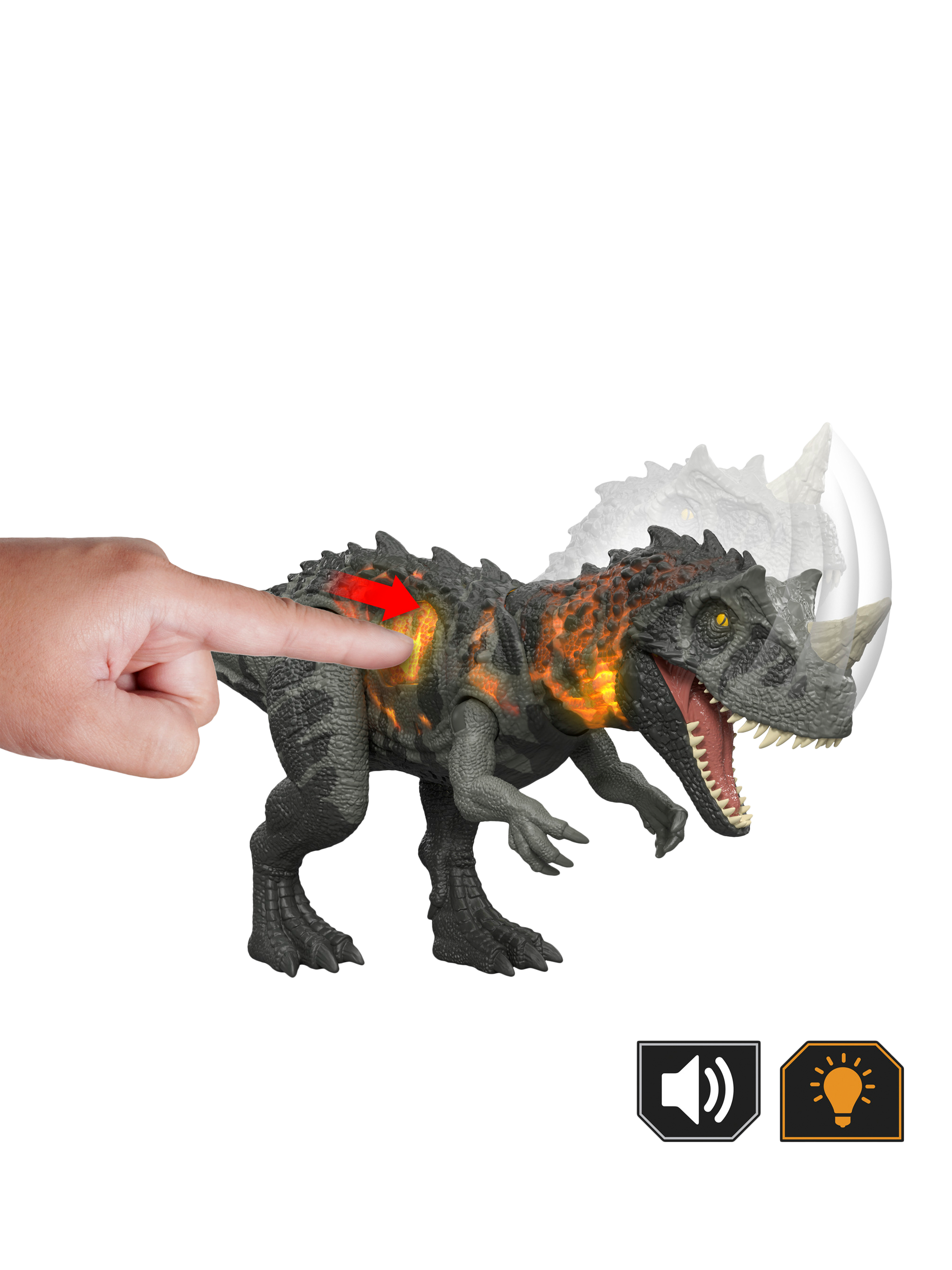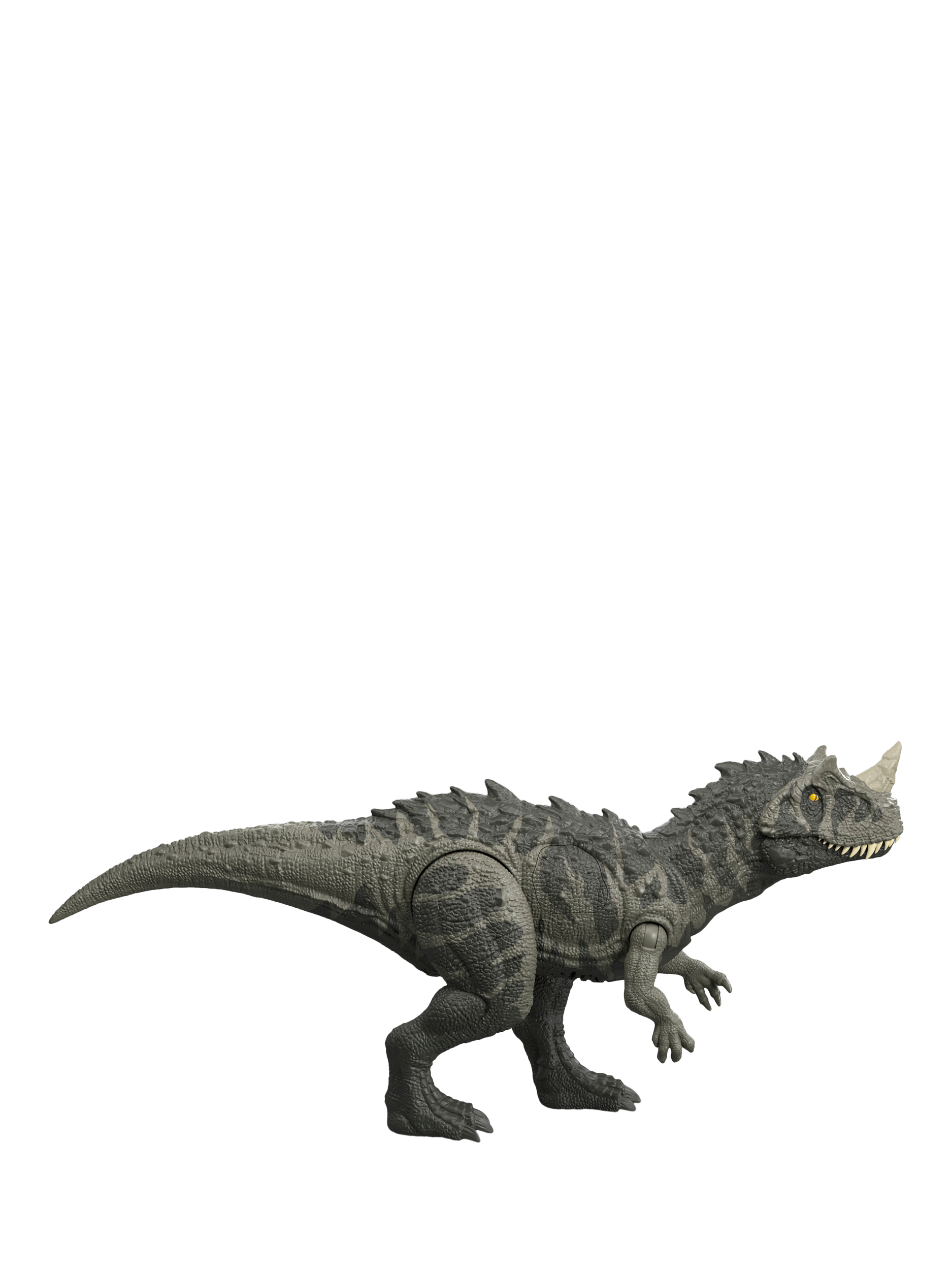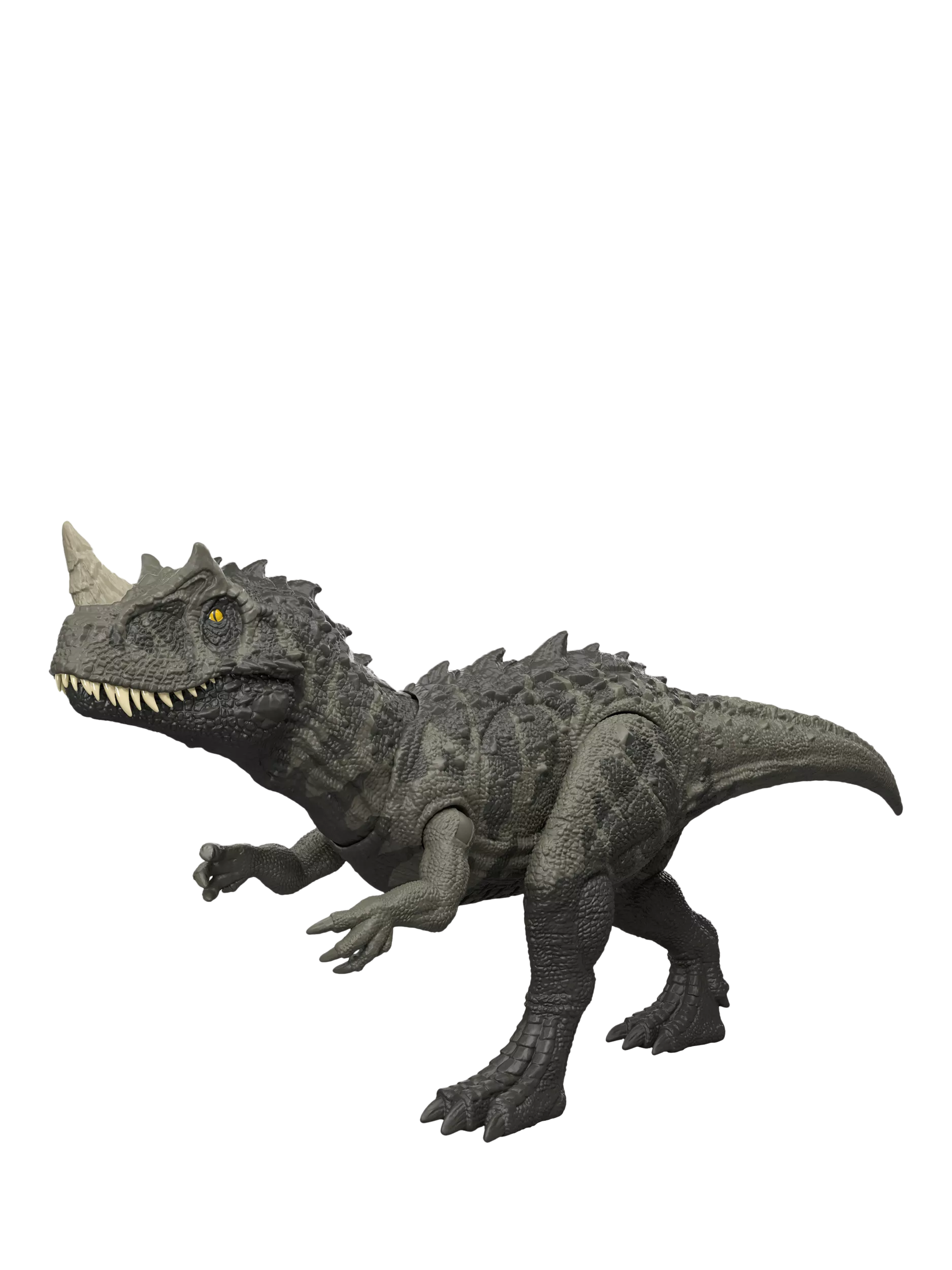 This Jurassic World Wild Roar Ceratosaurus dinosaur toy has dramatic lights as well as sounds! Press the button to activate a vertical mega chomp attack, accompanied by a ferocious roar, with light-up effects to add to the excitement. This 12.4-inch (31.5cm) long dinosaur, inspired by the Jurassic World franchise, has movable joints, ready for exciting dinosaur play and display.