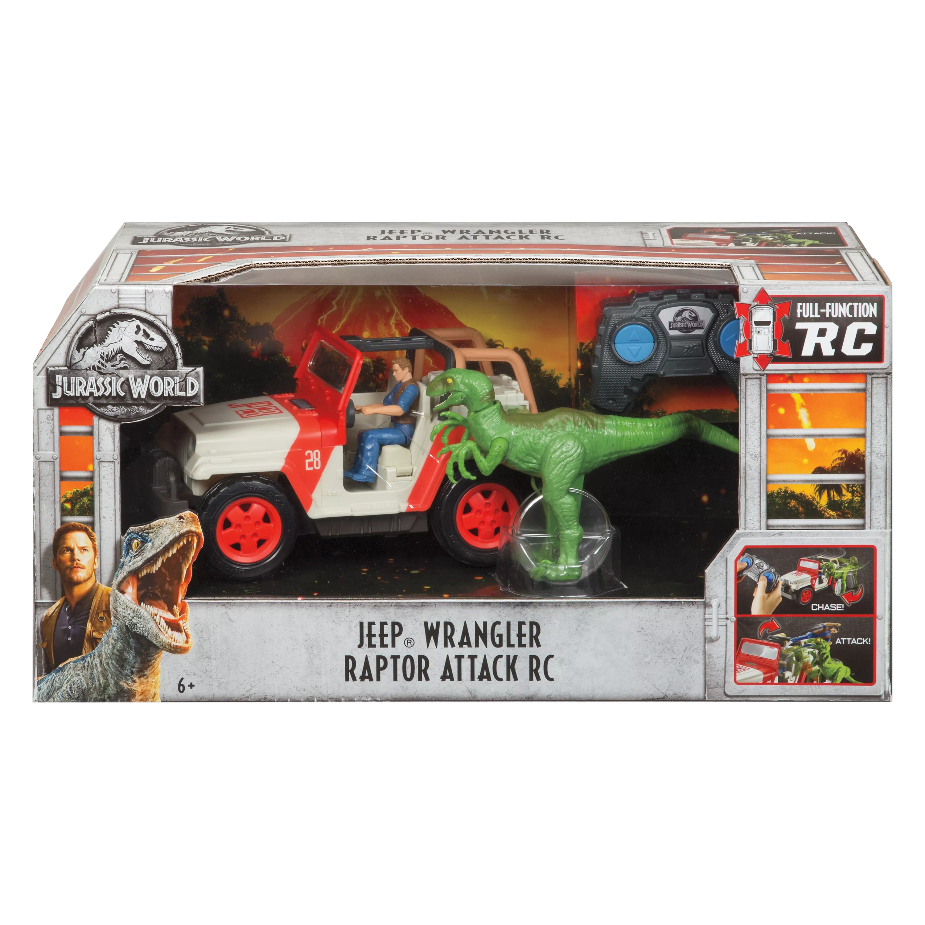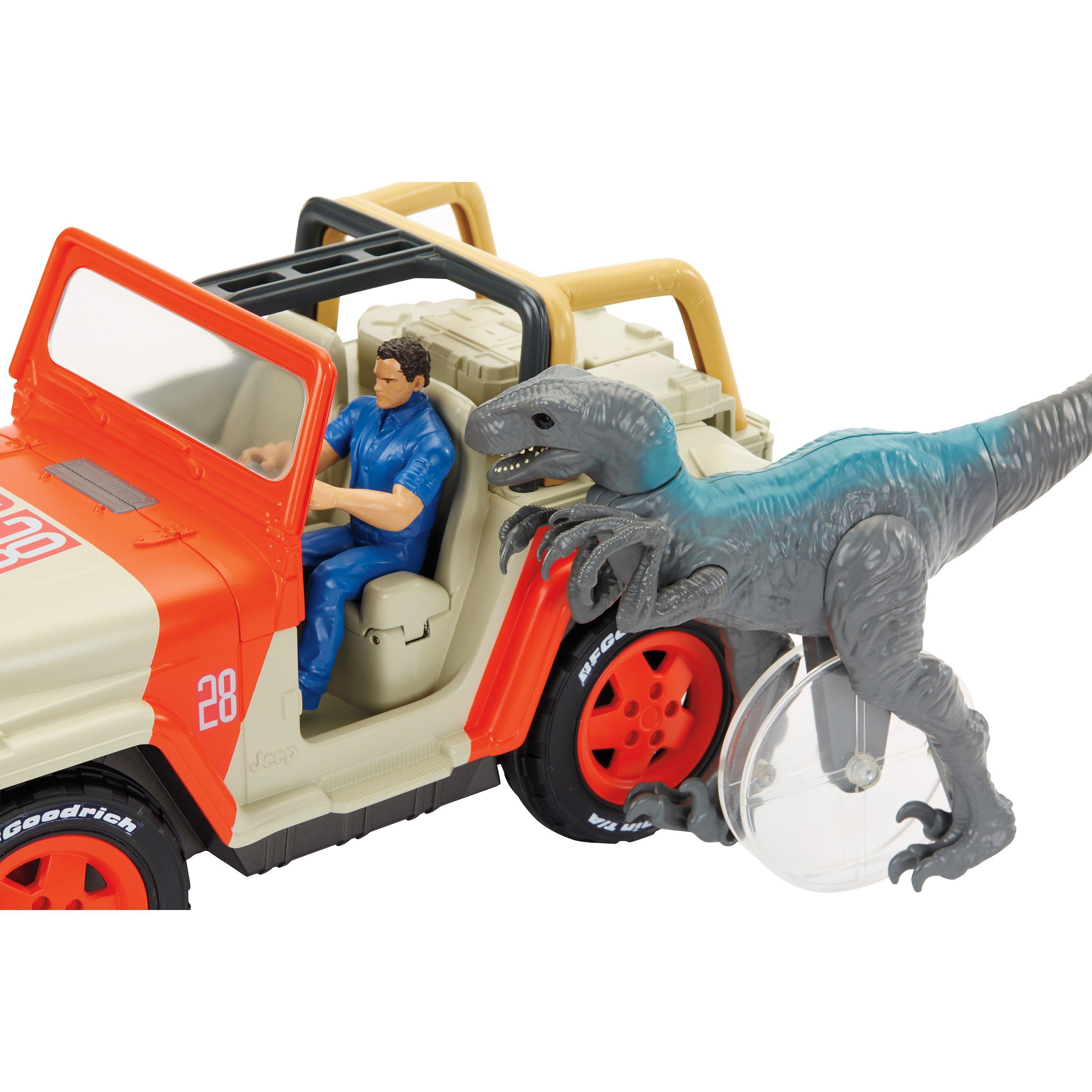 Inspired by the Jurassic World movies, this large-scale replica Jeep Wrangler comes with a fully functional remote control and awesome game-like action! One of the standard staff vehicles at Jurassic World, this remote vehicle includes realistic features, authentic deco, a 3.75” Owen action figure - and a Velociraptor Blue action figure! Blue is on the attack, chasing the vehicle as it drives! The Blue figure plugs into a mechanism on the driver's side near the rear tire and moves as the Jeep moves.