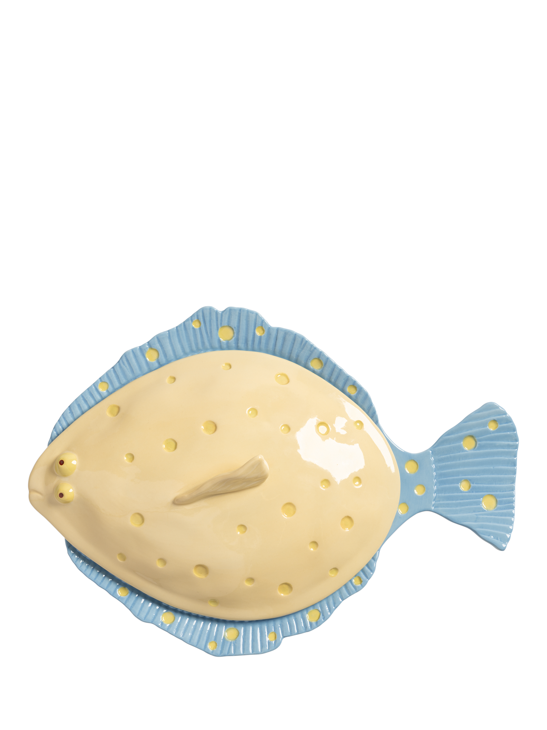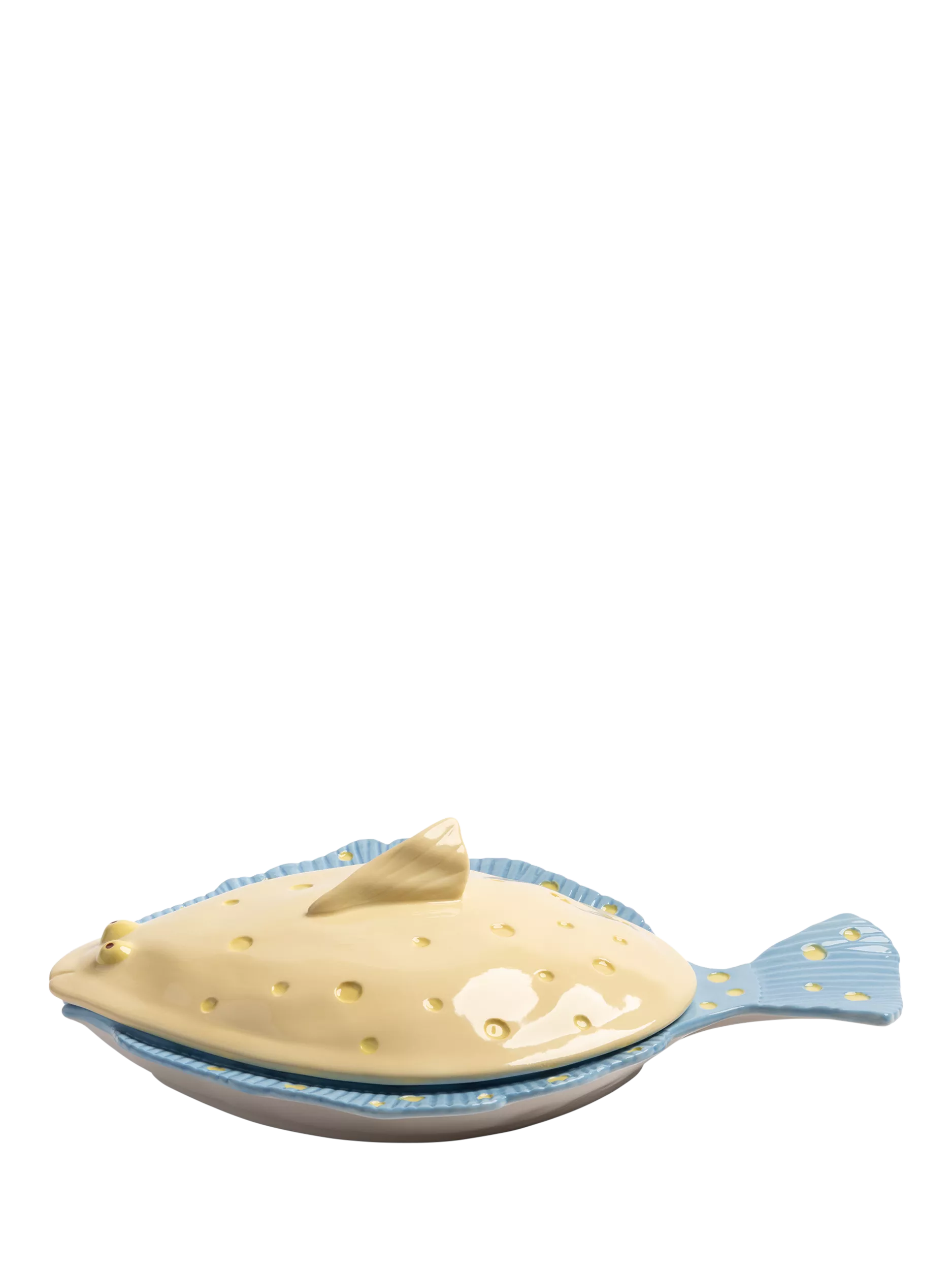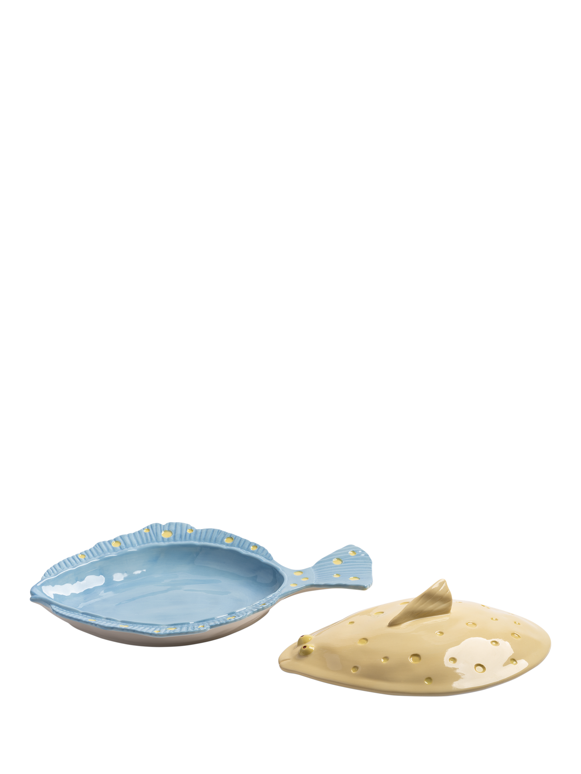 Serve your dishes in a fresh way with these fish-shaped platters, with a matching lid. Each piece features summery colours and a subtle relief pattern, making every dinner feel a little more special. &k Amsterdam's in-house team hand-shaped both the forms and the relief, giving each platter a unique, handcrafted look. Ideal for serving appetizers, and of course, seafood.