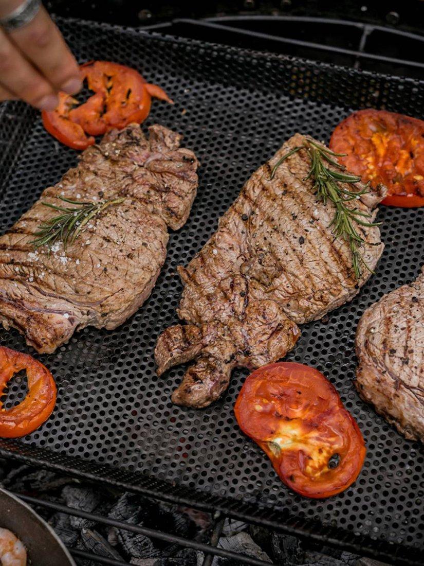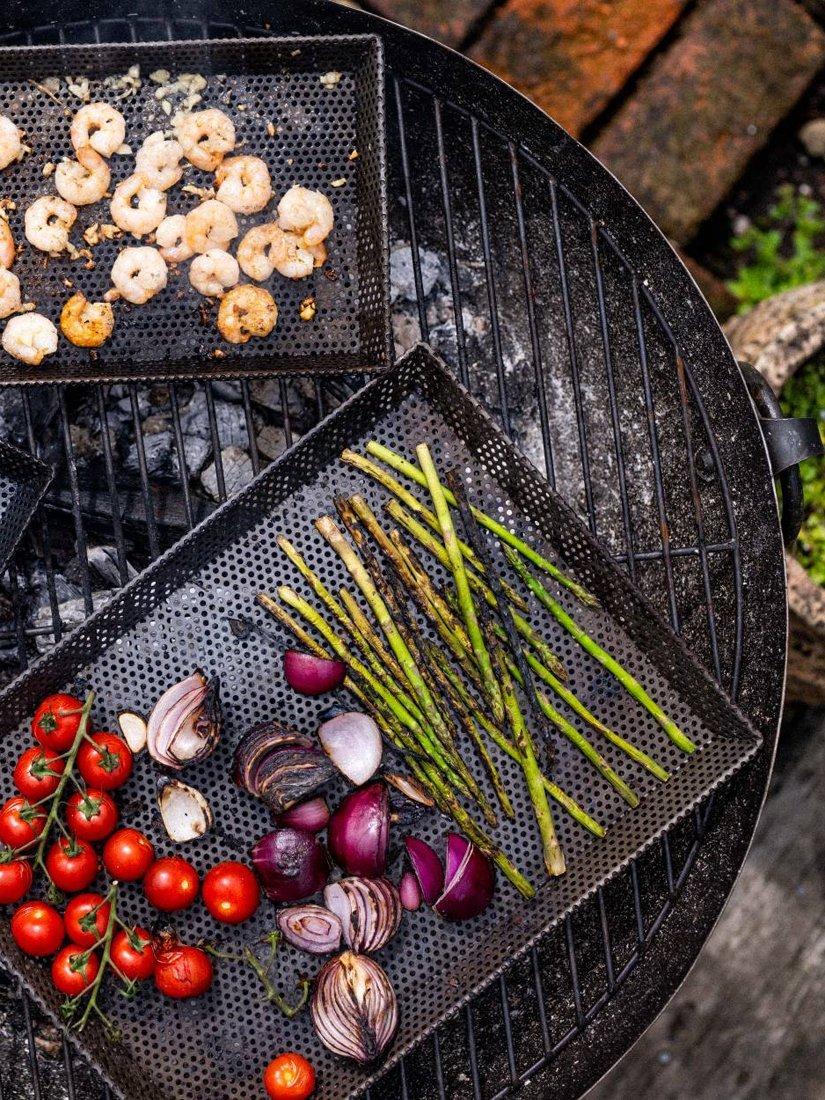 Easily repositioned for direct or indirect heat, they are ideal for searing meat, grilling vegetables or cooking delicate fish, while the perforated design allows heat and smoke to enhance flavour. Always use barbecue tools and gloves when handling hot cookware.
