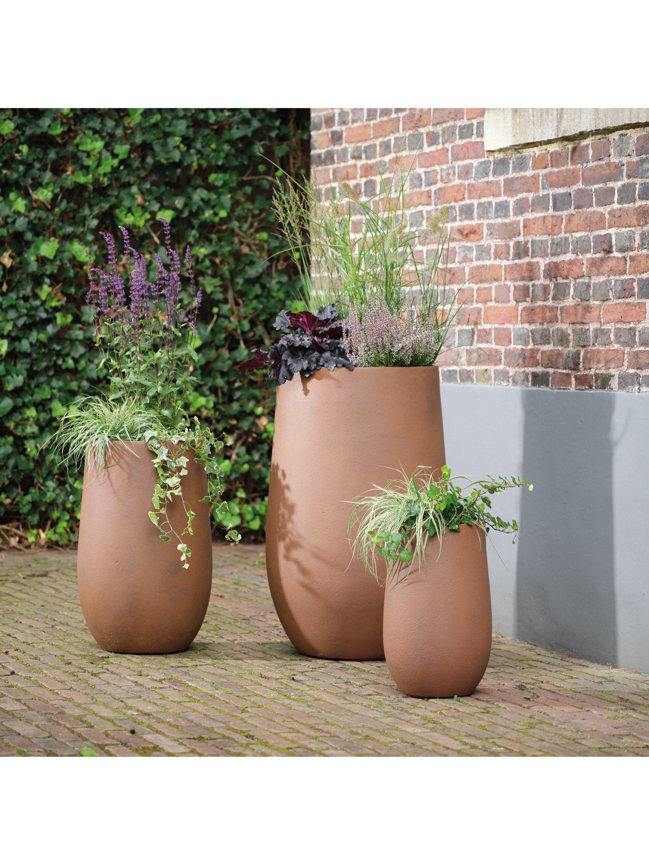 Frost-resistant, weather-resistant and suitable for both indoor and outdoor use, each one has a drainage hole and plug for optimal water management. Easy to clean and low-maintenance, they're crafted from durable fibre clay board in a rich brown colour. The three different sizes look great displayed together.