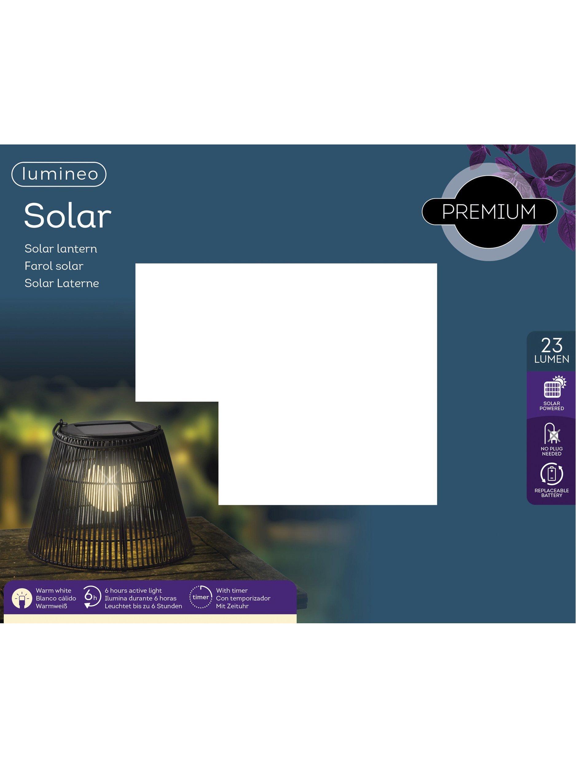 An enchanting addition to any garden or patio design, this lantern combines atmospheric warm white LED light with high-quality, durable and weather-resistant wicker work. Thanks to its solar-powered system, the lantern operates completely wirelessly, and the integrated battery recharges itself during the day, providing up to six hours of soft illumination for long summer evenings.