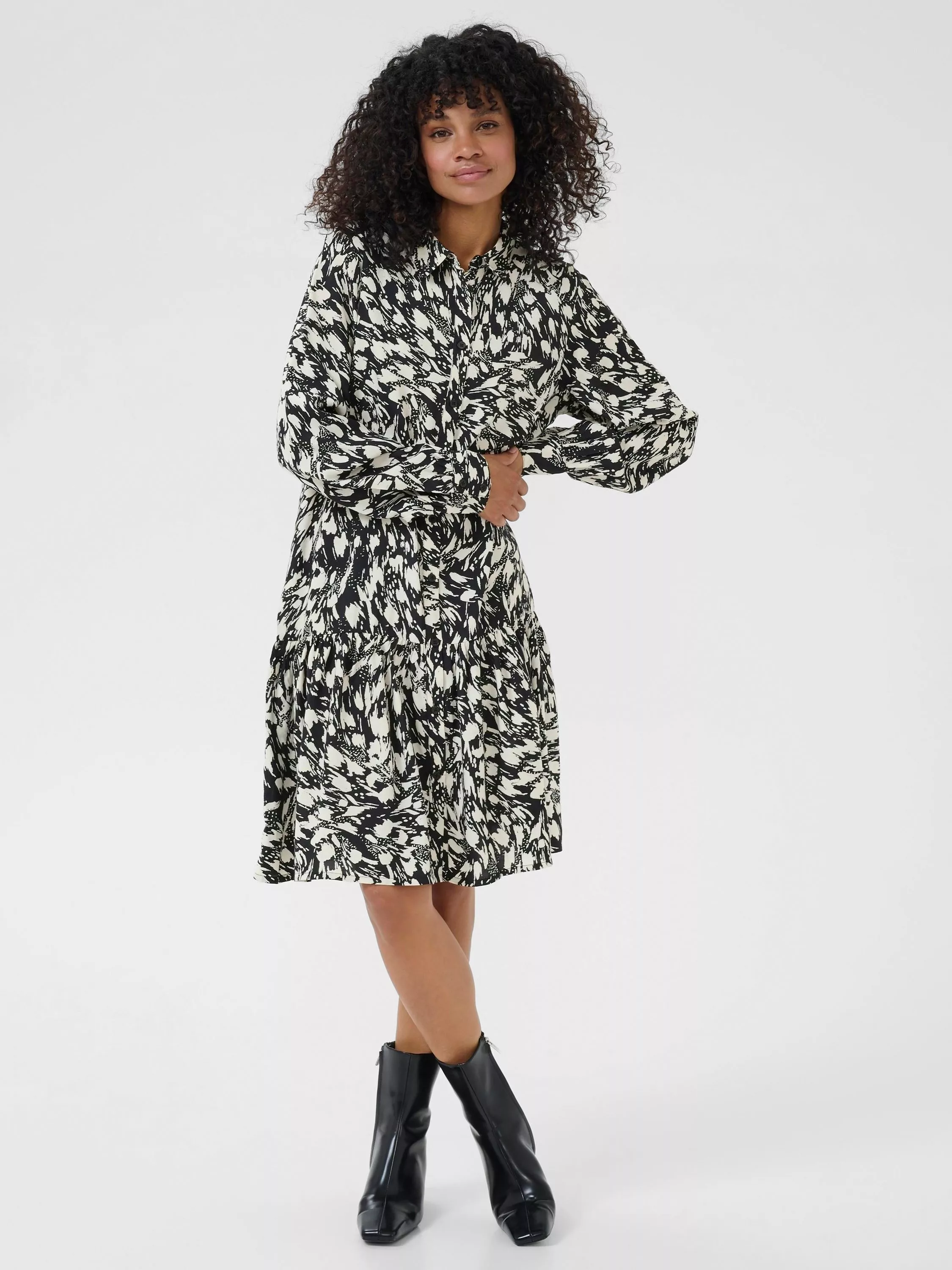 Button up in style. This long sleeve knee length dress by KAFFE has a smart collar neckline and intriguing, abstract print.