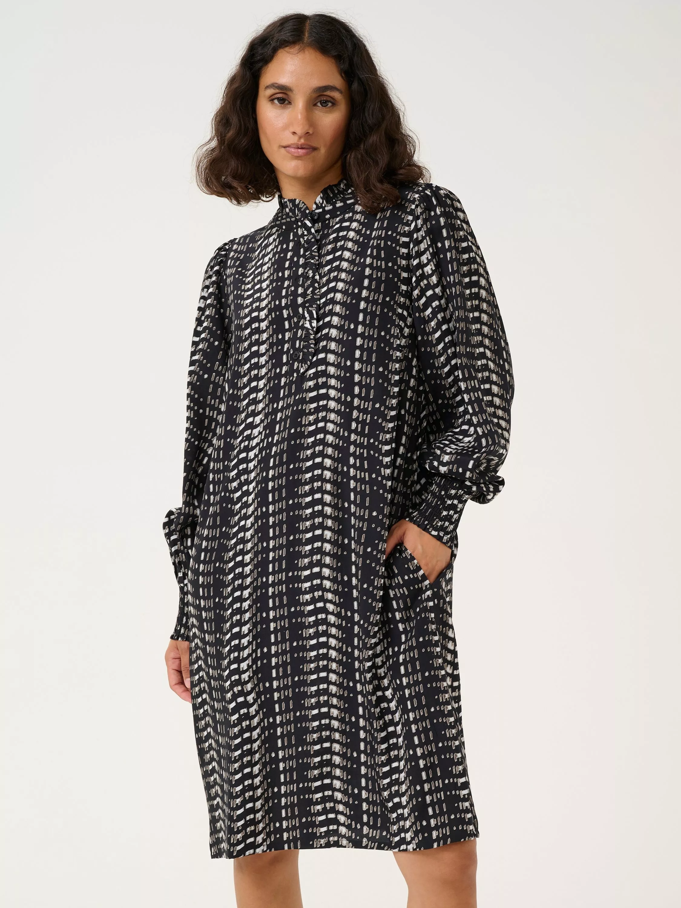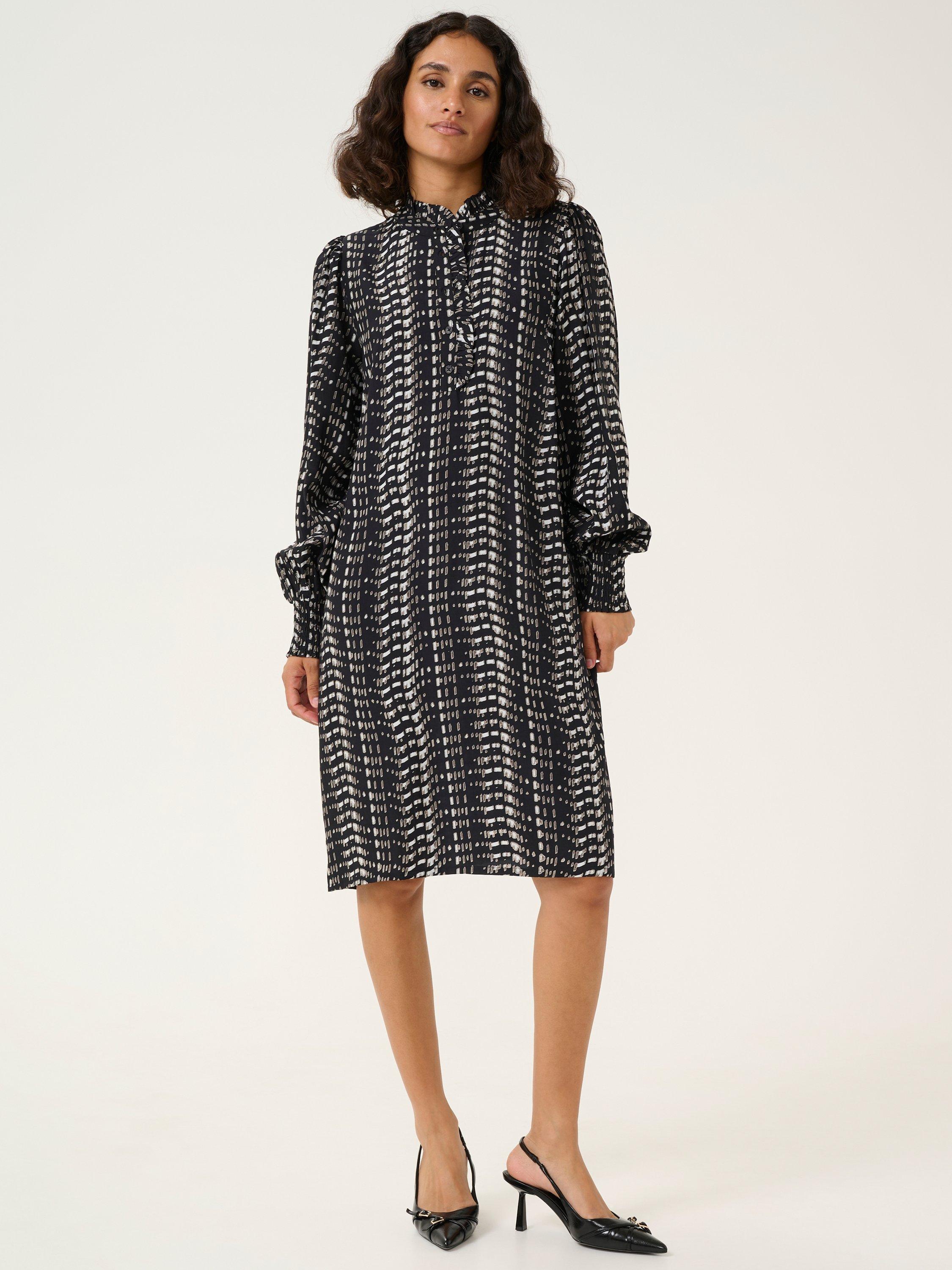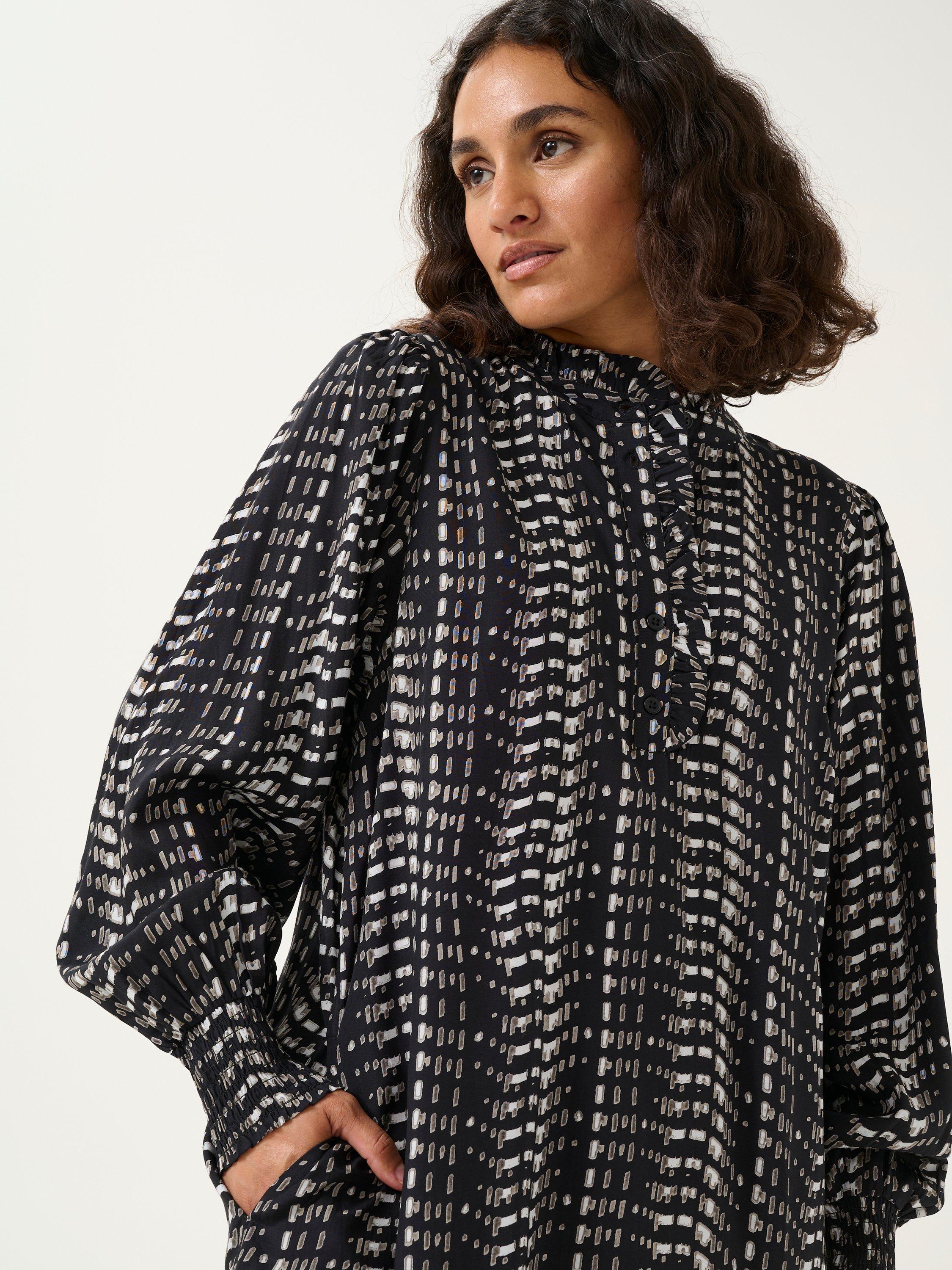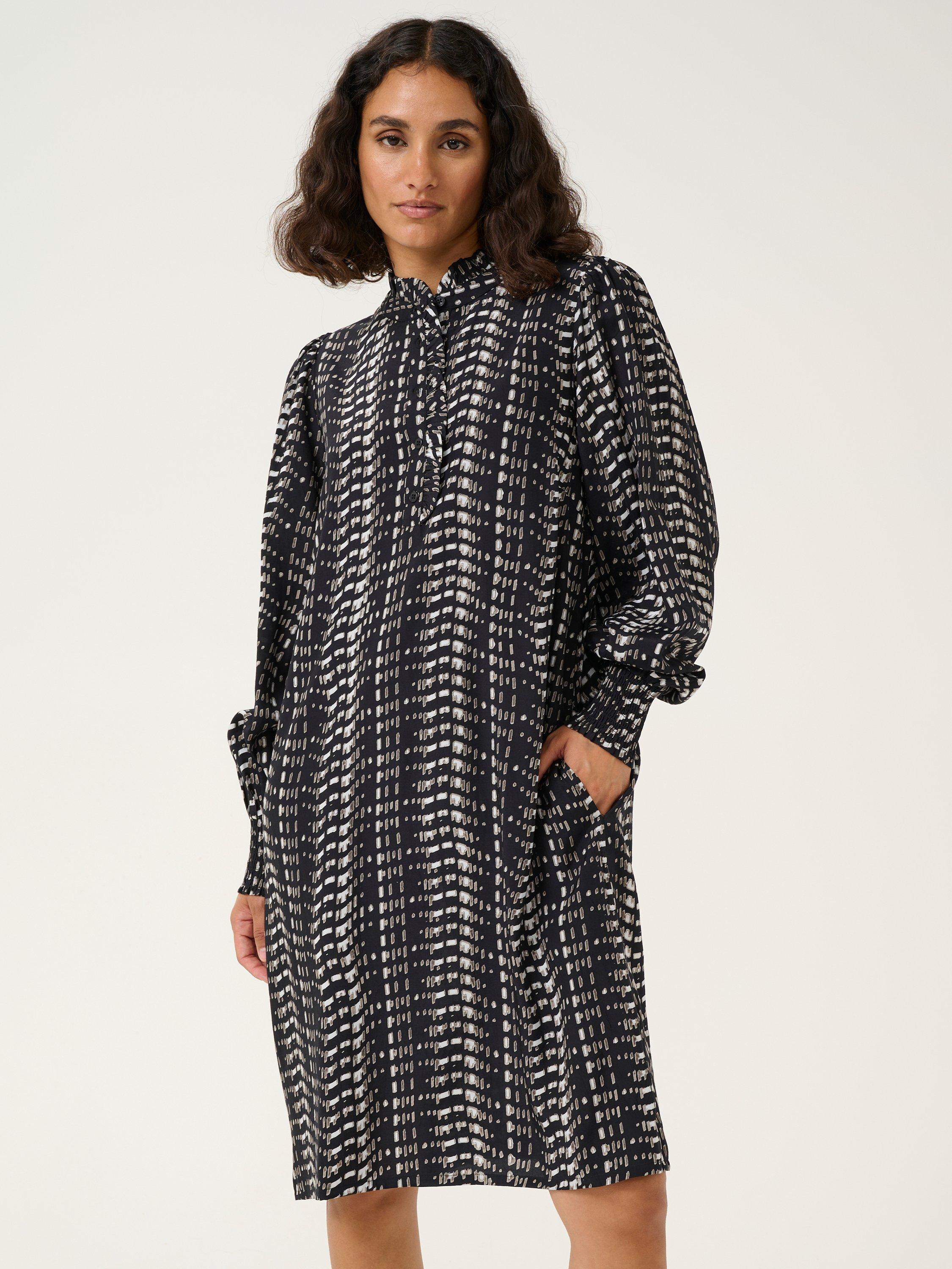The alice dress is a casual and feminine style - perfect for lots of occasions. It has a henley neck with buttons and a frilled collar, and it has a casual fit with an A-line silhouette. The sleeves are long and voluminous with wide smock cuffs, and the dress has seamed side pockets and is cut above the knees.