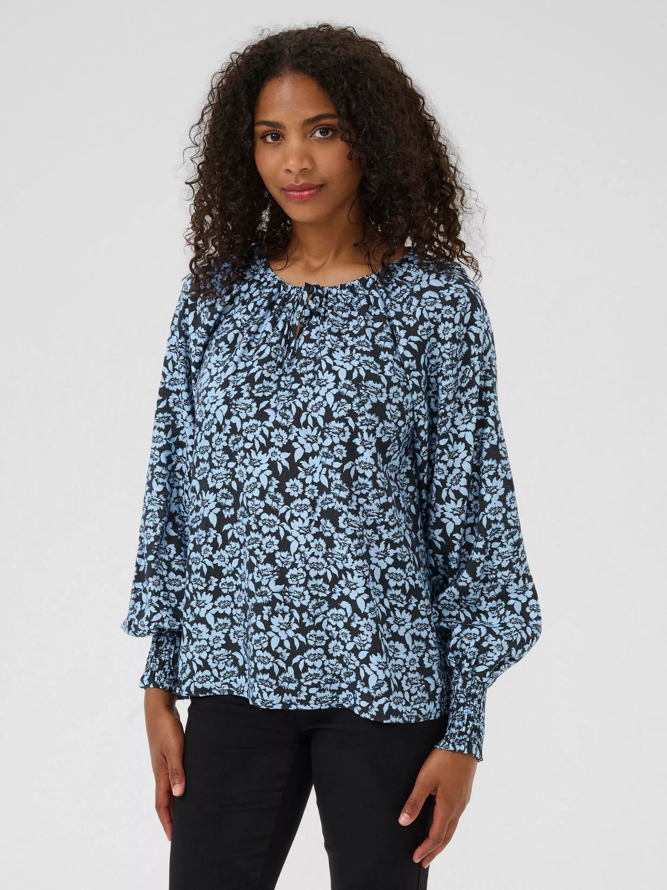 This KAFFE blouse combines floral print with a round neck and long sleeves, giving you comfort and ease for your day. Its soft viscose blend suits work or weekend plans.
