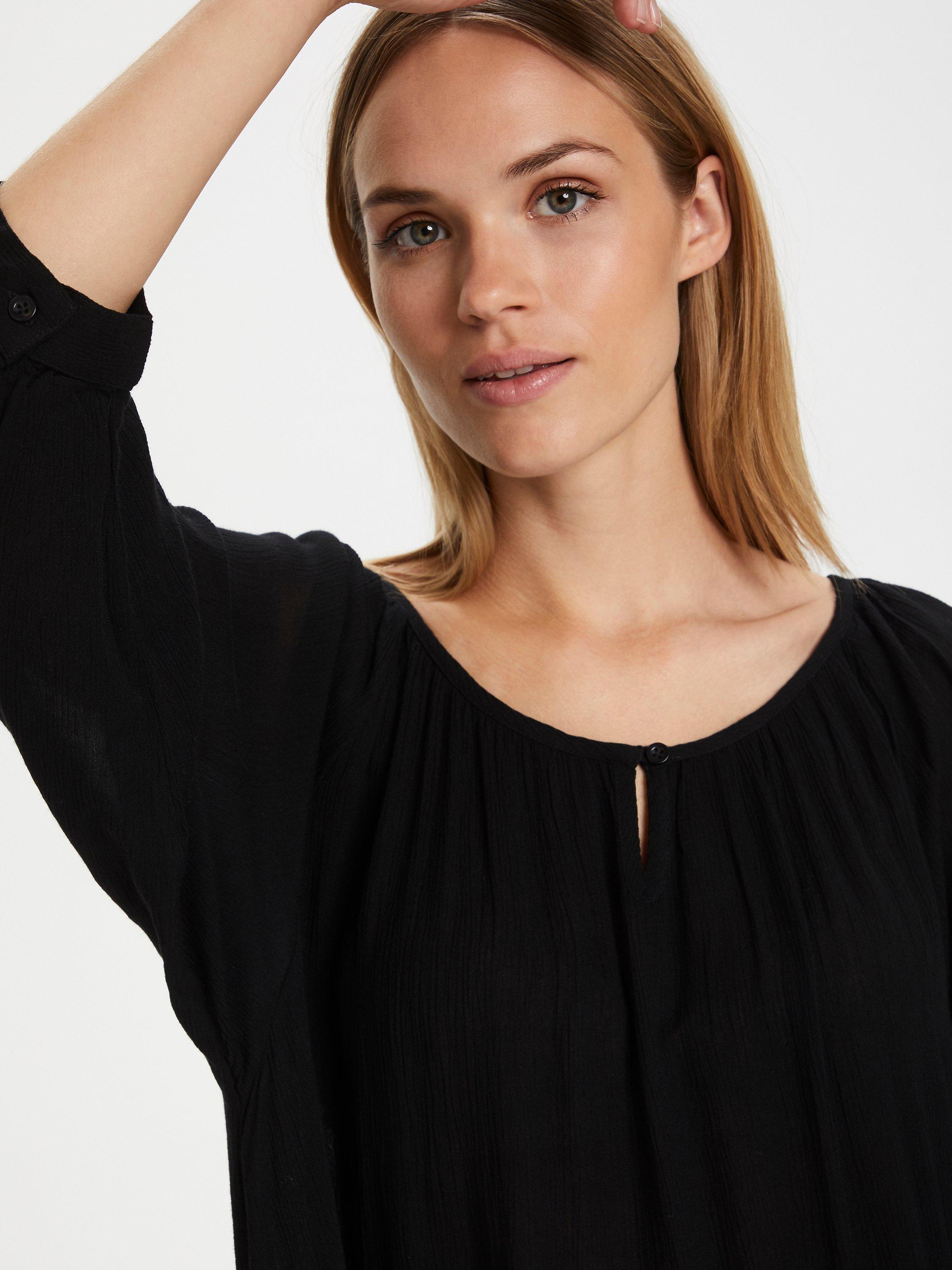Cut with a softly rounded neckline and three-quarter length sleeves, it is made from soft fabric that withstands creasing and is an everyday wardrobe essential.