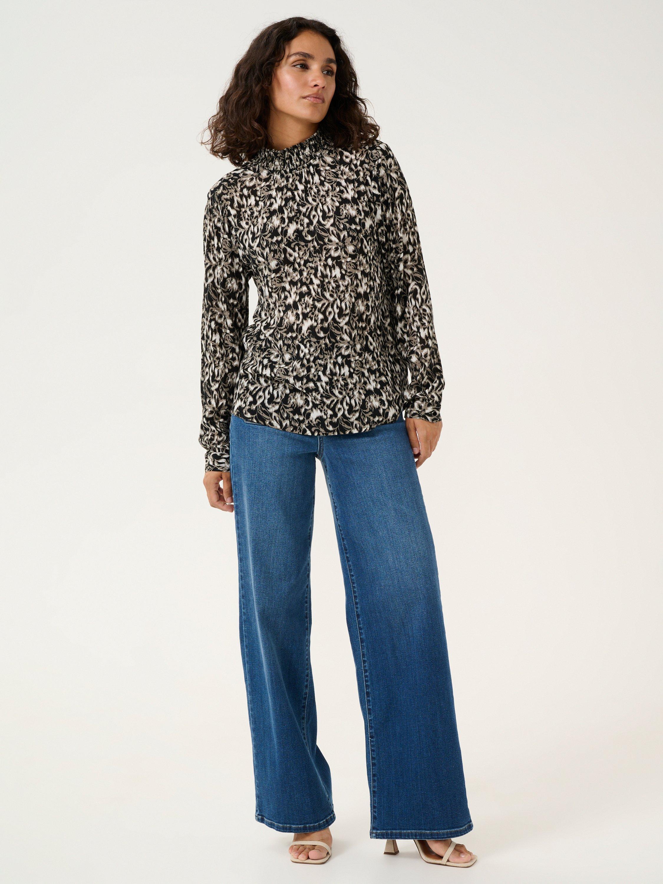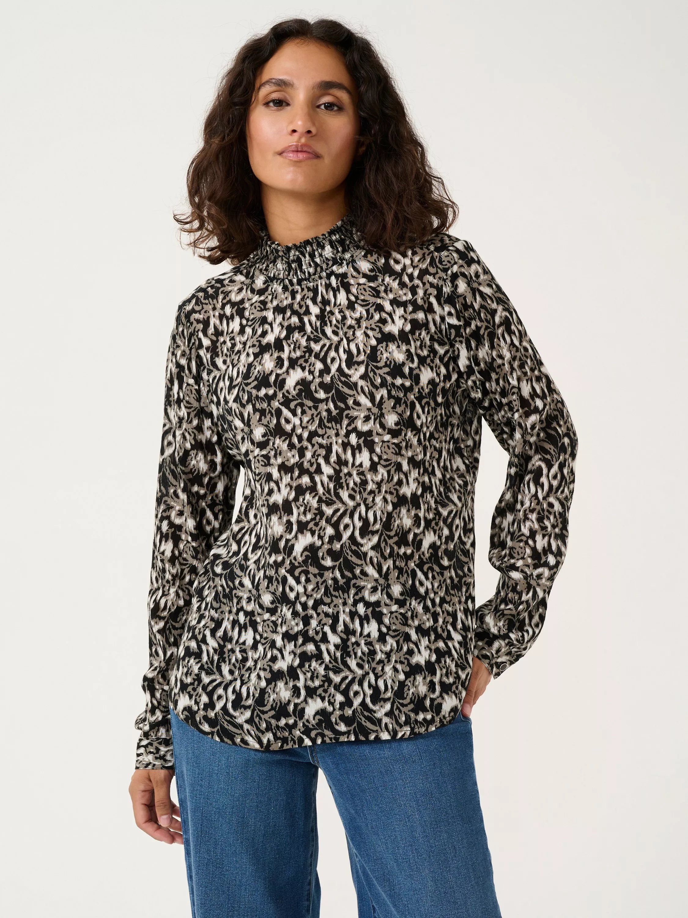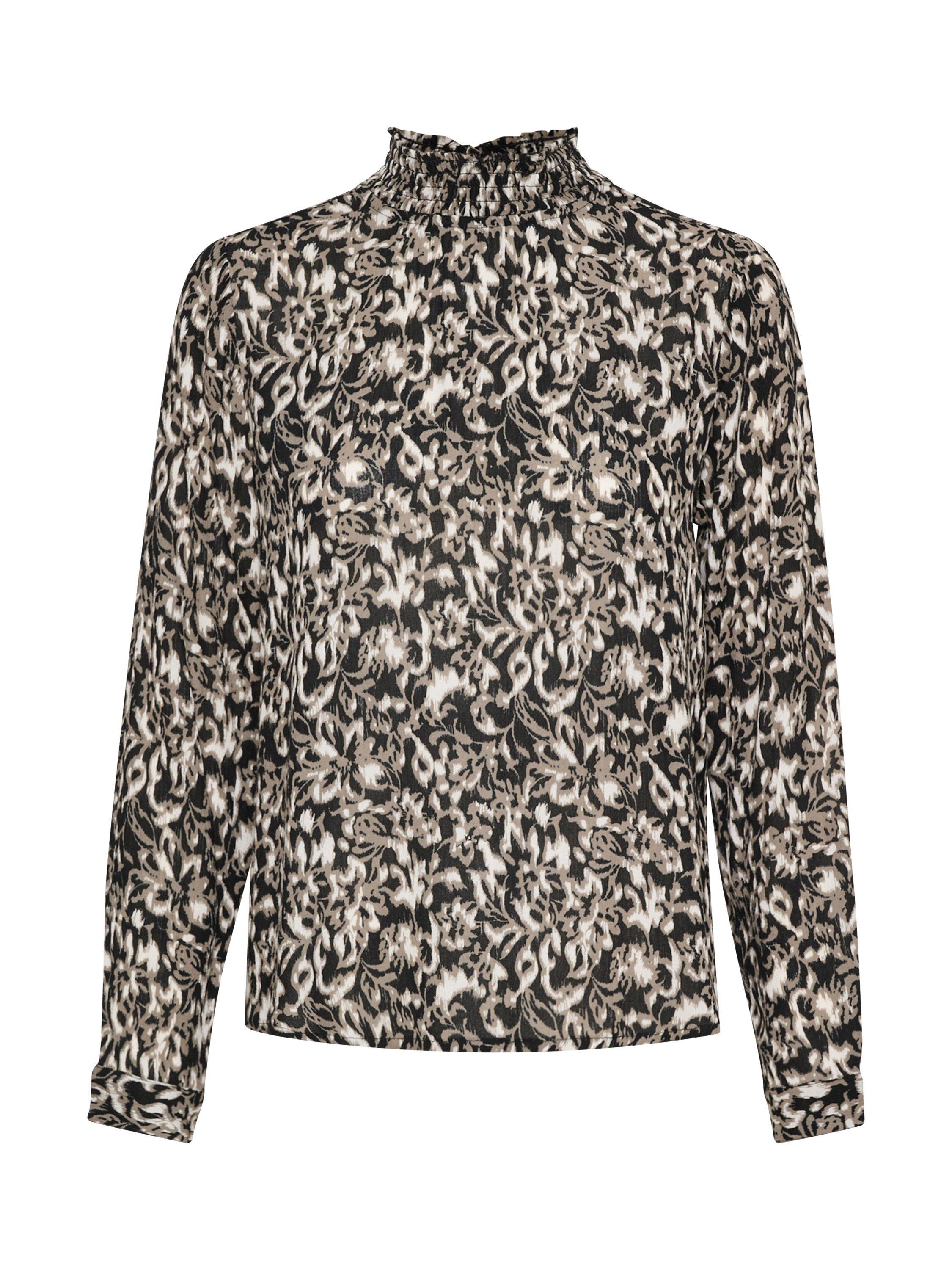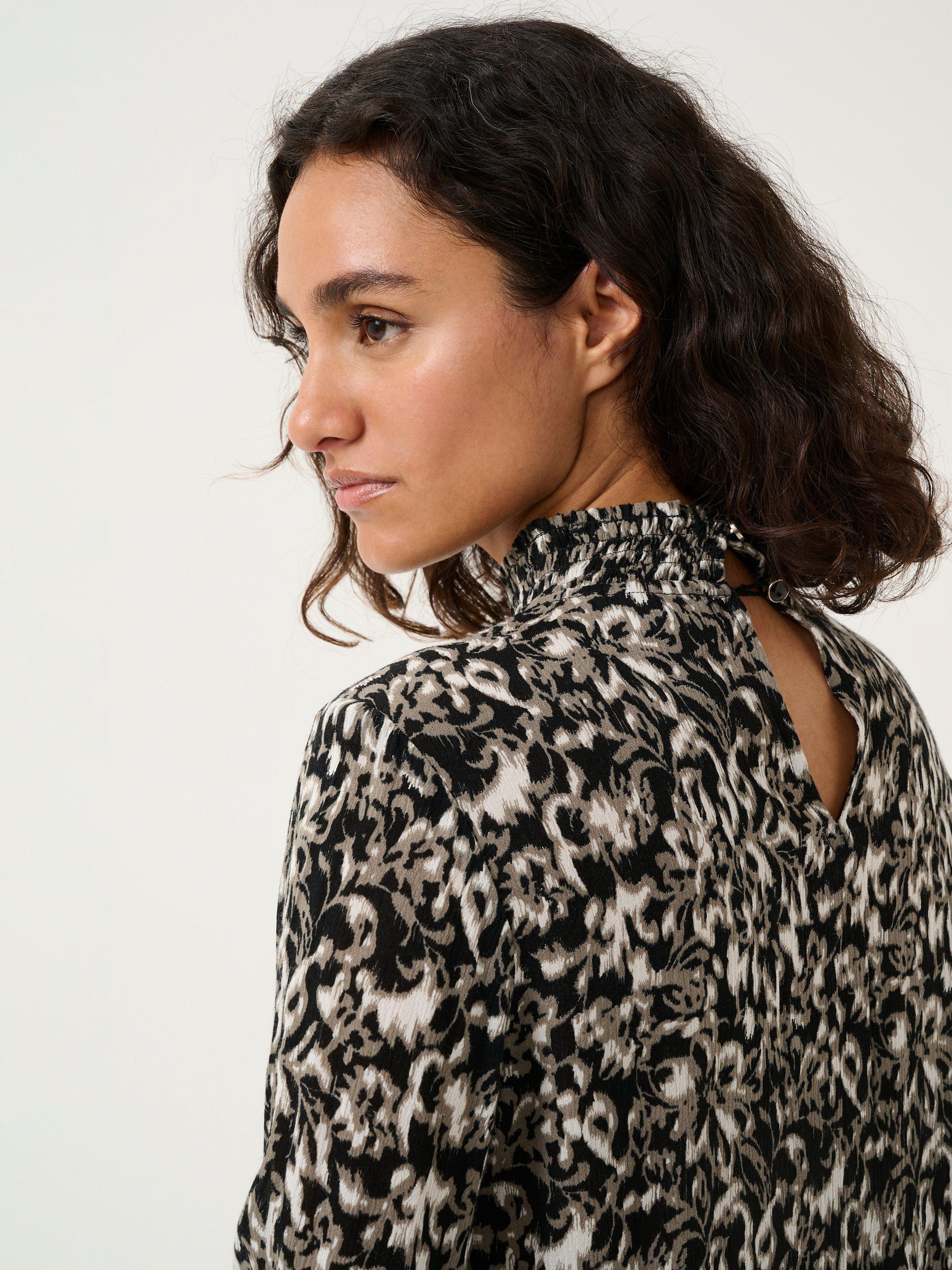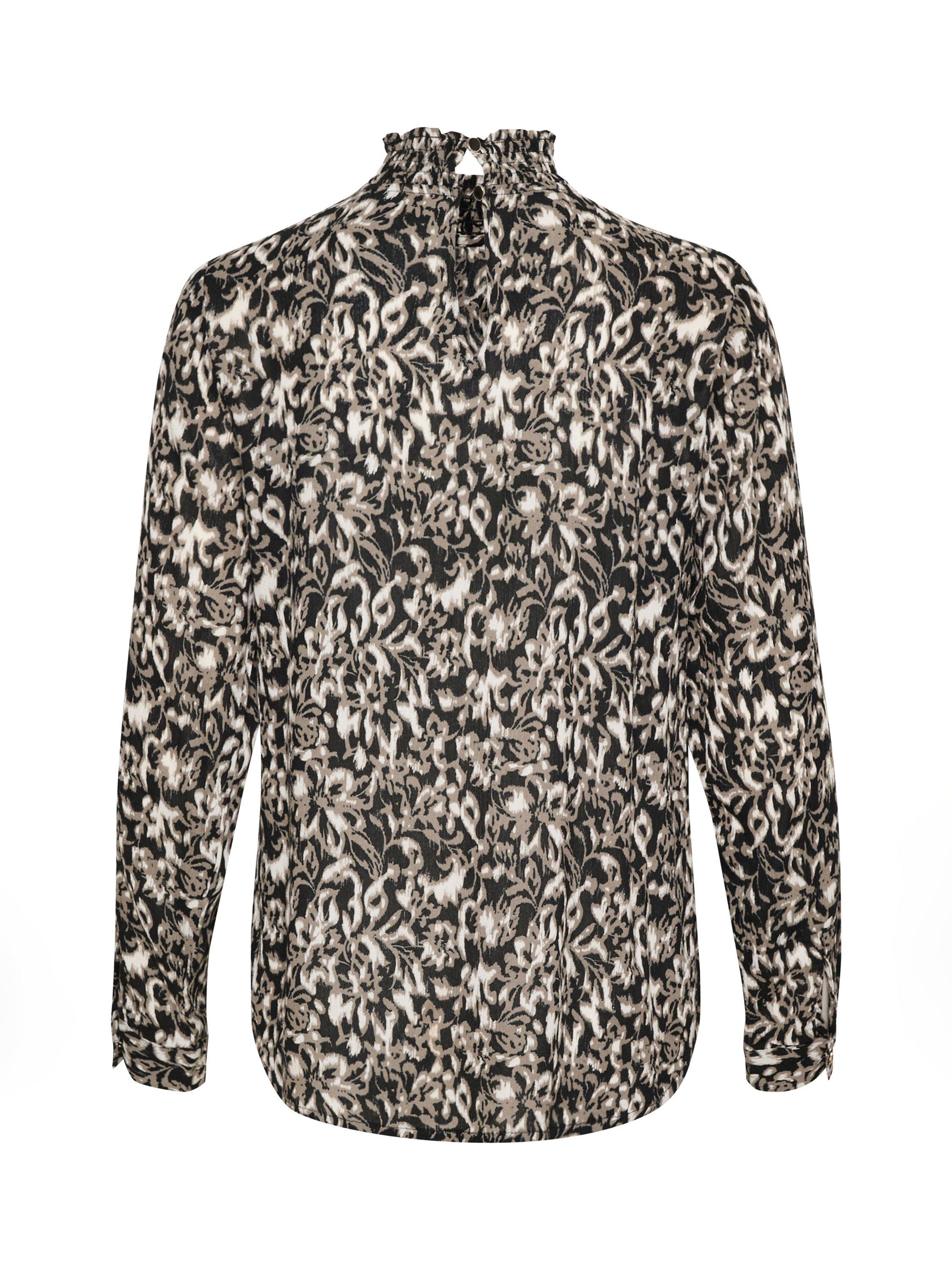 The amber blouse is a printed top with a high smock neck. The neck has two buttons for fastening at the back and a keyhole detail underneath. The sleeves are long and loose, and they are gathered in a buttoned cuff. The blouse has a regular fit and can be worn on any occasion.