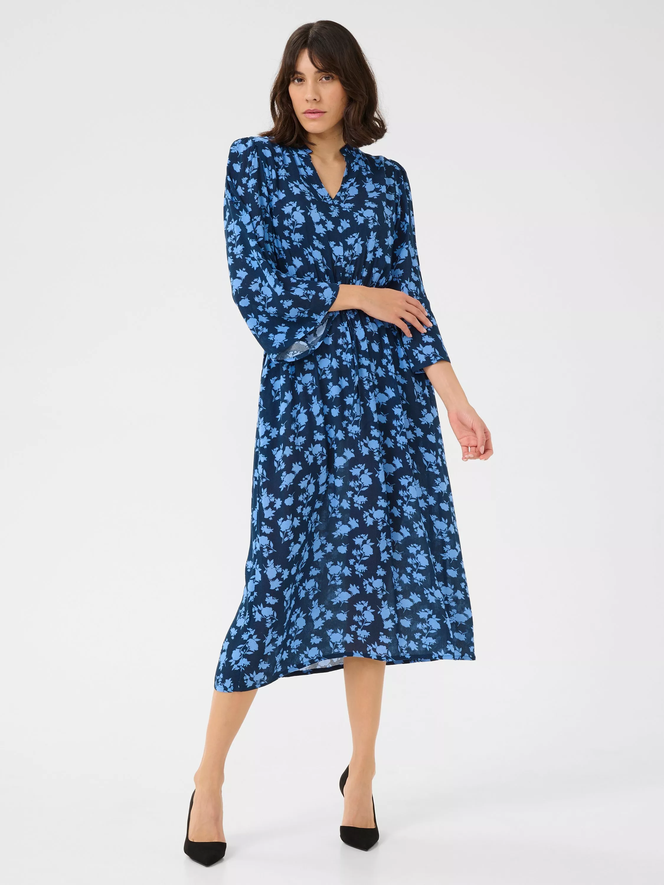 The amber midi dress is a casual style and the perfect addition to your everyday wardrobe this season. It has a V-notch neck with a frilled collar, and it has a regular fit with a drawstring waist. The sleeves are 3/4 length with a straight fit, and the dress is cut at the midcalves.