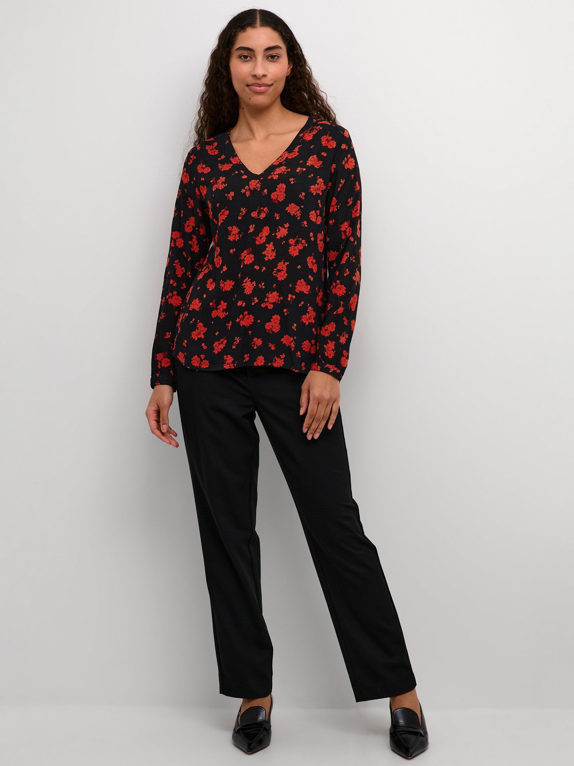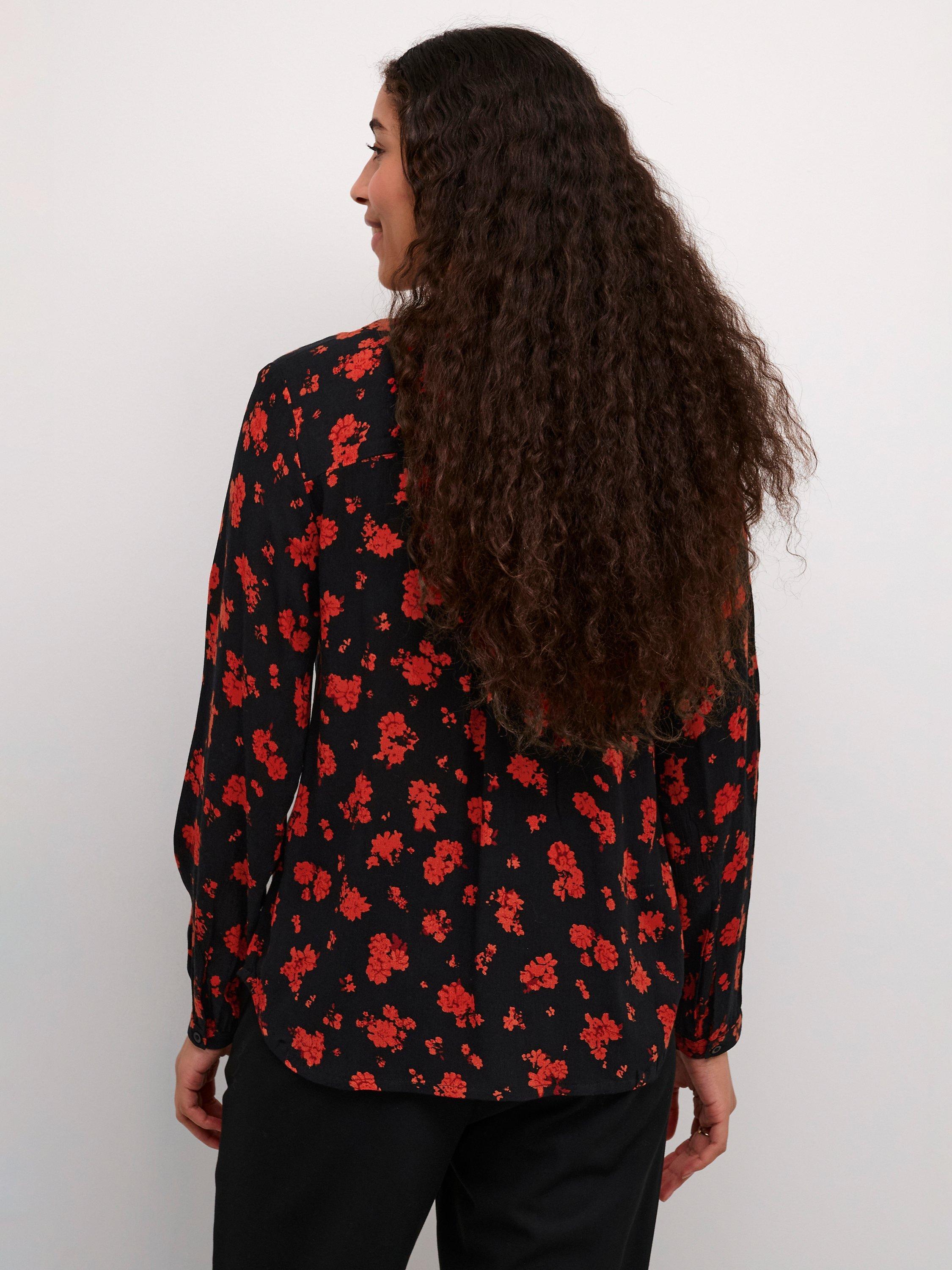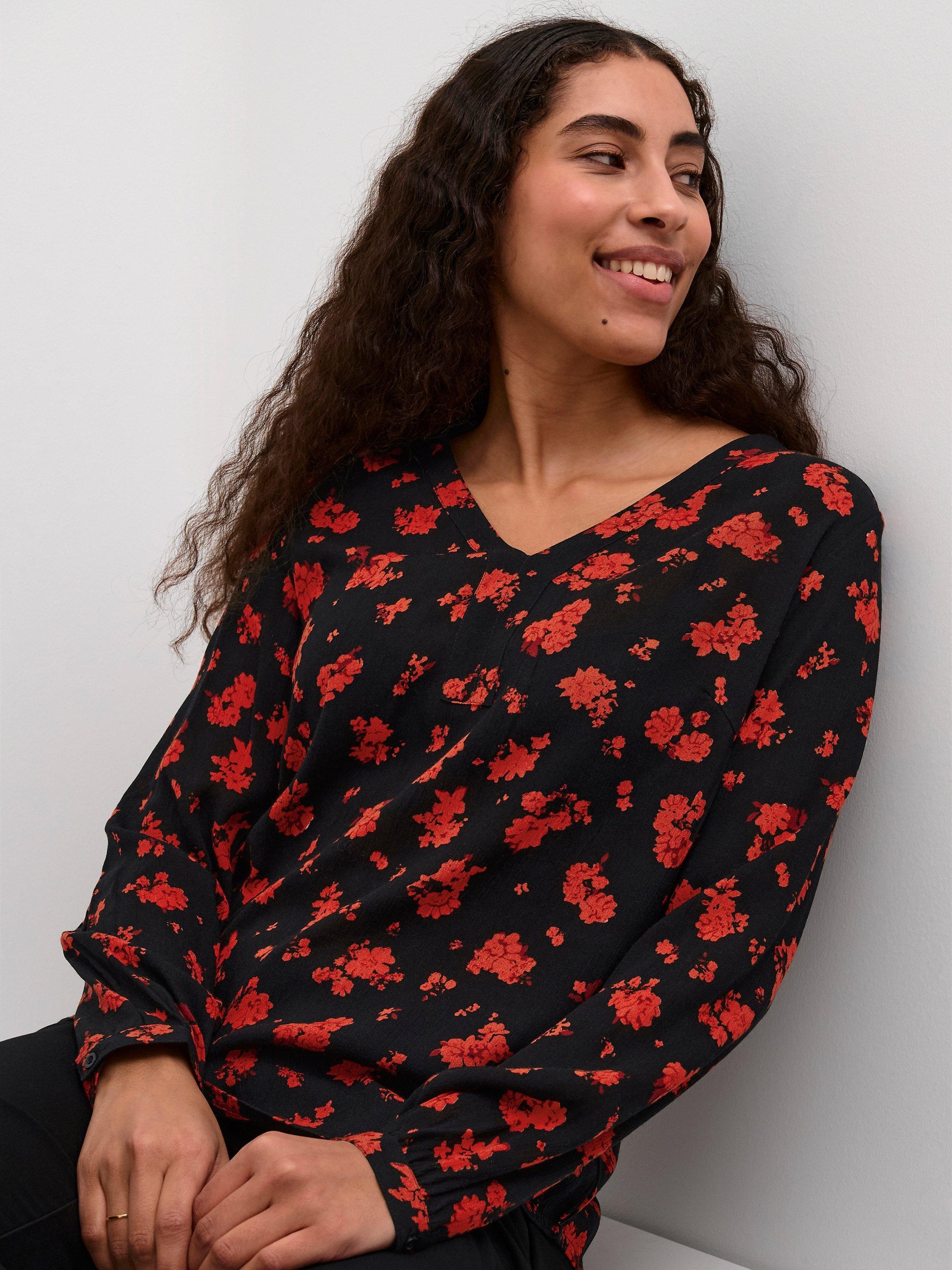 The amber blouse is a versatile style in a great print. It has a V-neck with a kaftan placket and it has a casual fit with wide shoulders. The sleeves are long and has a buttoned cuff. The blouse has a yoke on the back and it is cut at the hips.