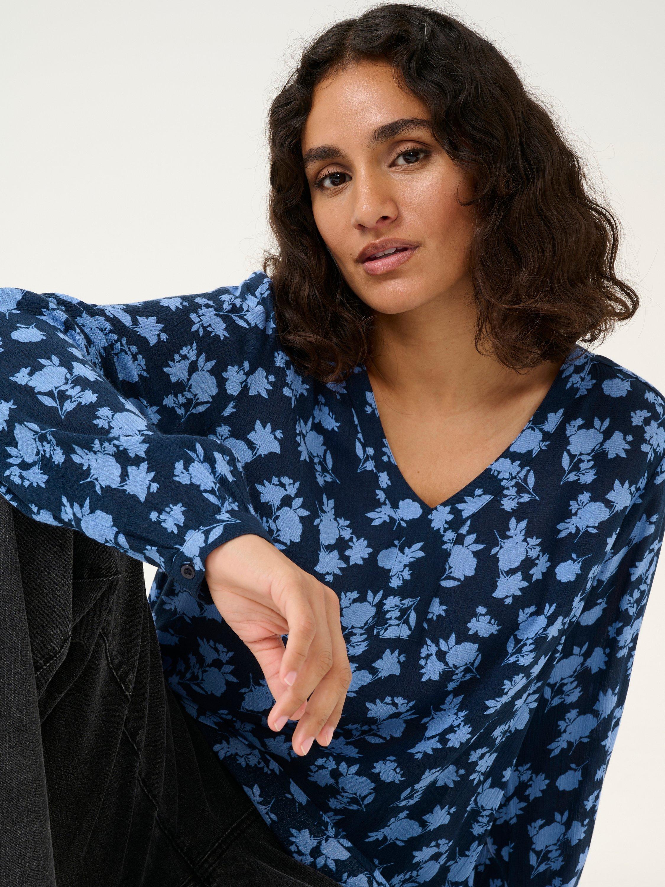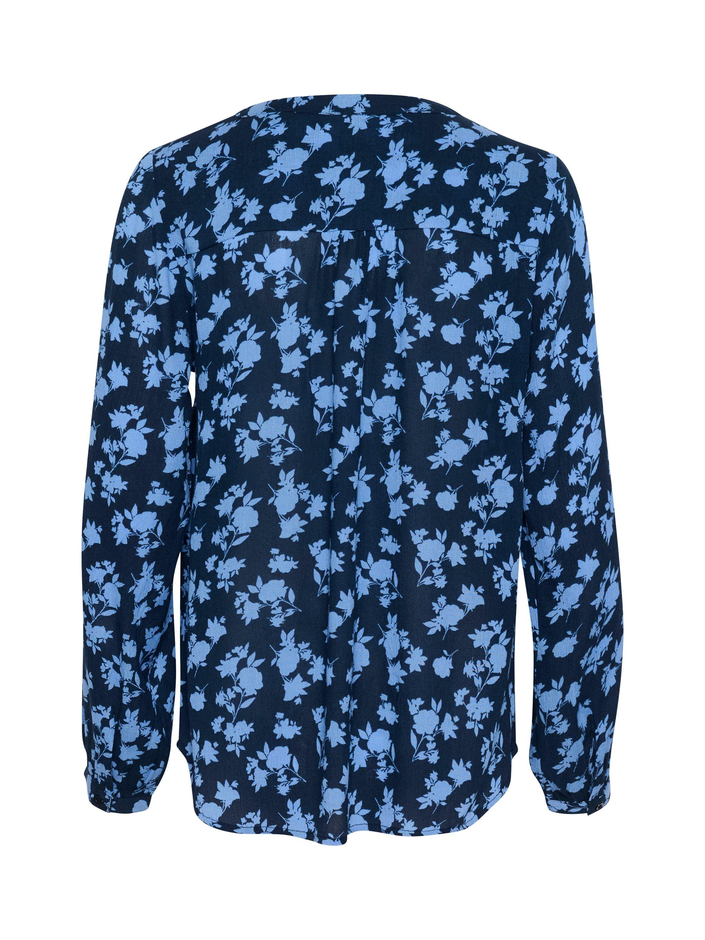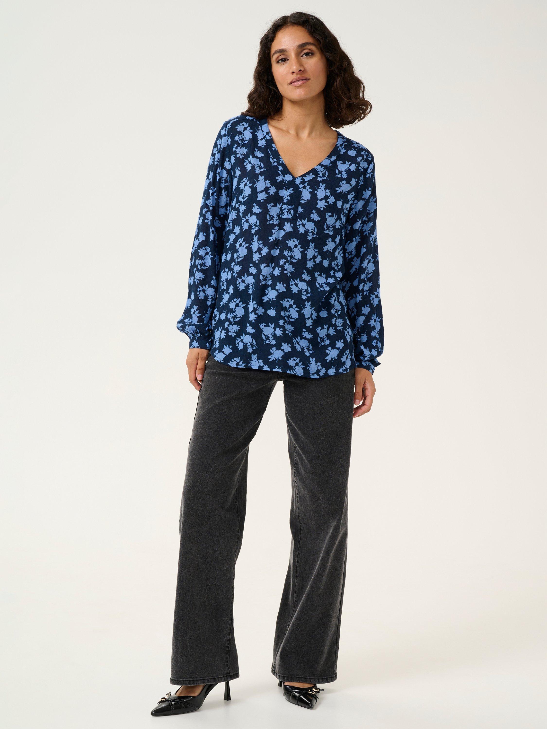 The amber blouse is a versatile style in a great print. It has a V-neck with a kaftan placket and it has a casual fit with wide shoulders. The sleeves are long and has a buttoned cuff. The blouse has a yoke on the back and it is cut at the hips.