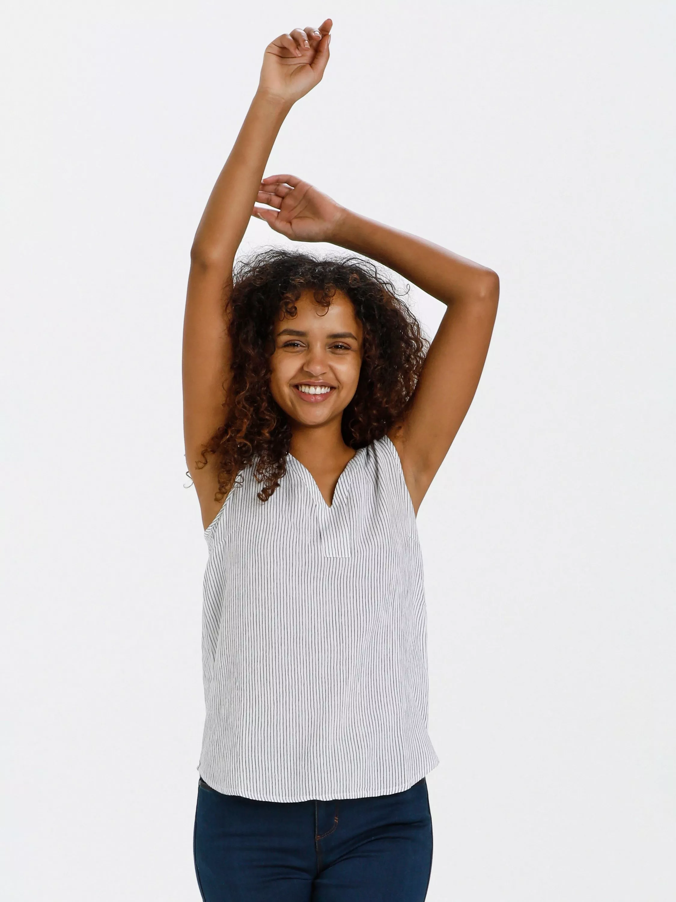 Framed with a classic v-neckline and a sleeveless design, it offers a soft feel thanks to its cotton-viscose blend and is ideal for relaxed daytime wear.
