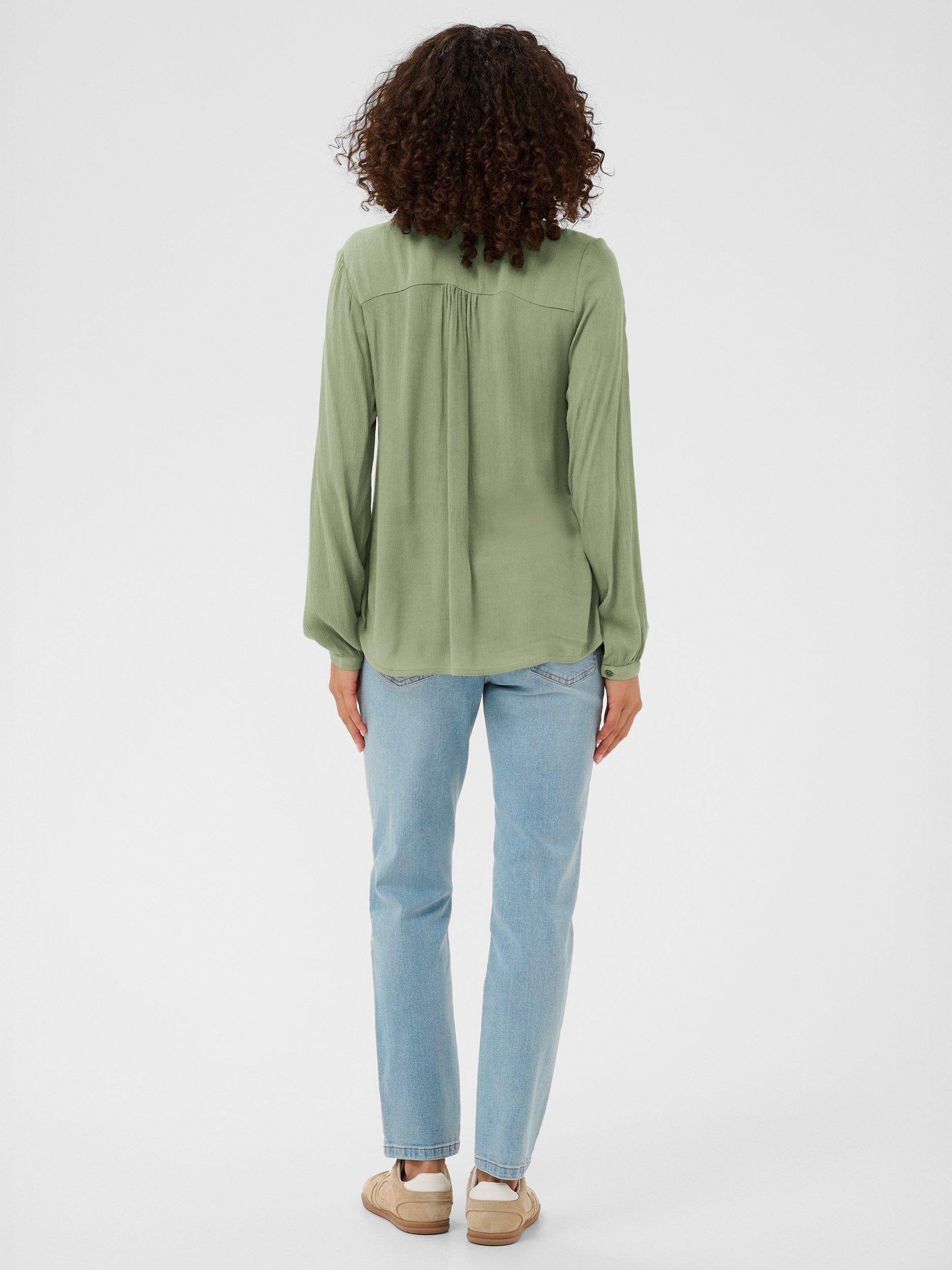 The amber blouse has a regular and relaxed fit with long sleeves. The sleeves are gathered in a cuff with a small button at the back. The V-neck is embellished with a kaftan placket. At the back the blouse has small gatherings beneath the yoke, which makes it flow elegantly down the back.