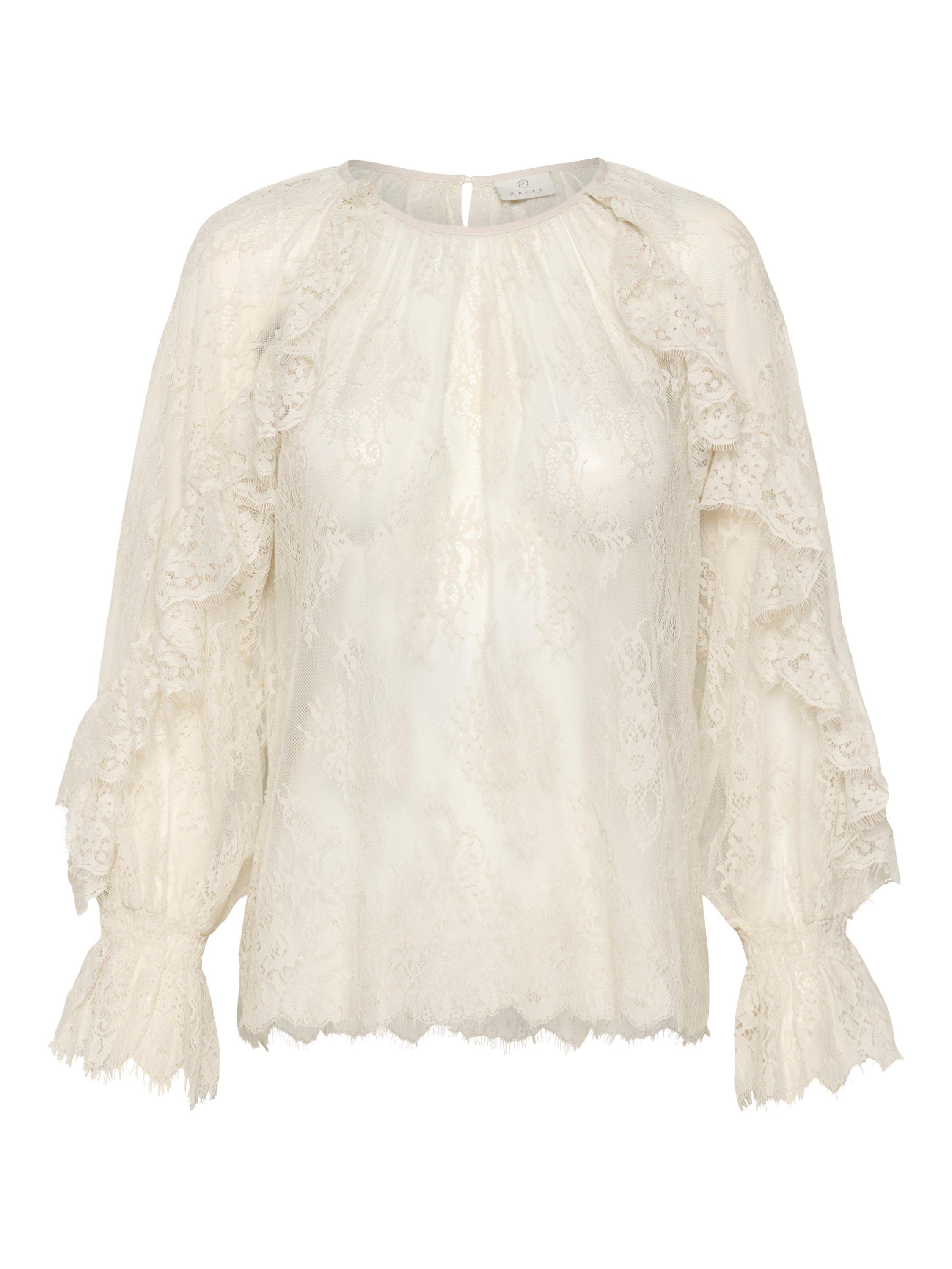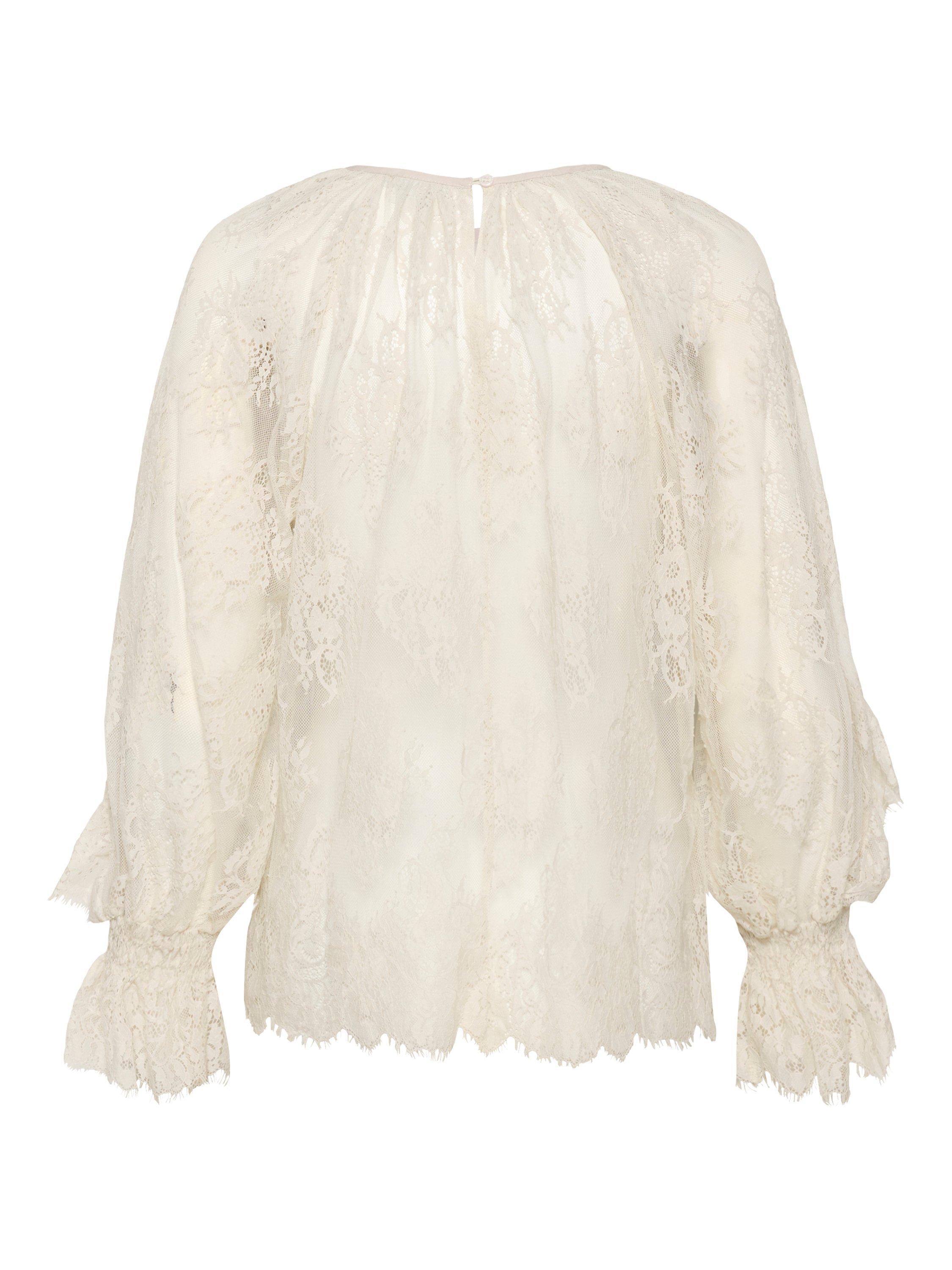 A romantic lace blouse featuring airy sheer panels and sculpted ruffle sleeves, offering graceful drape and feminine allure for weekend dates or dinner gatherings.