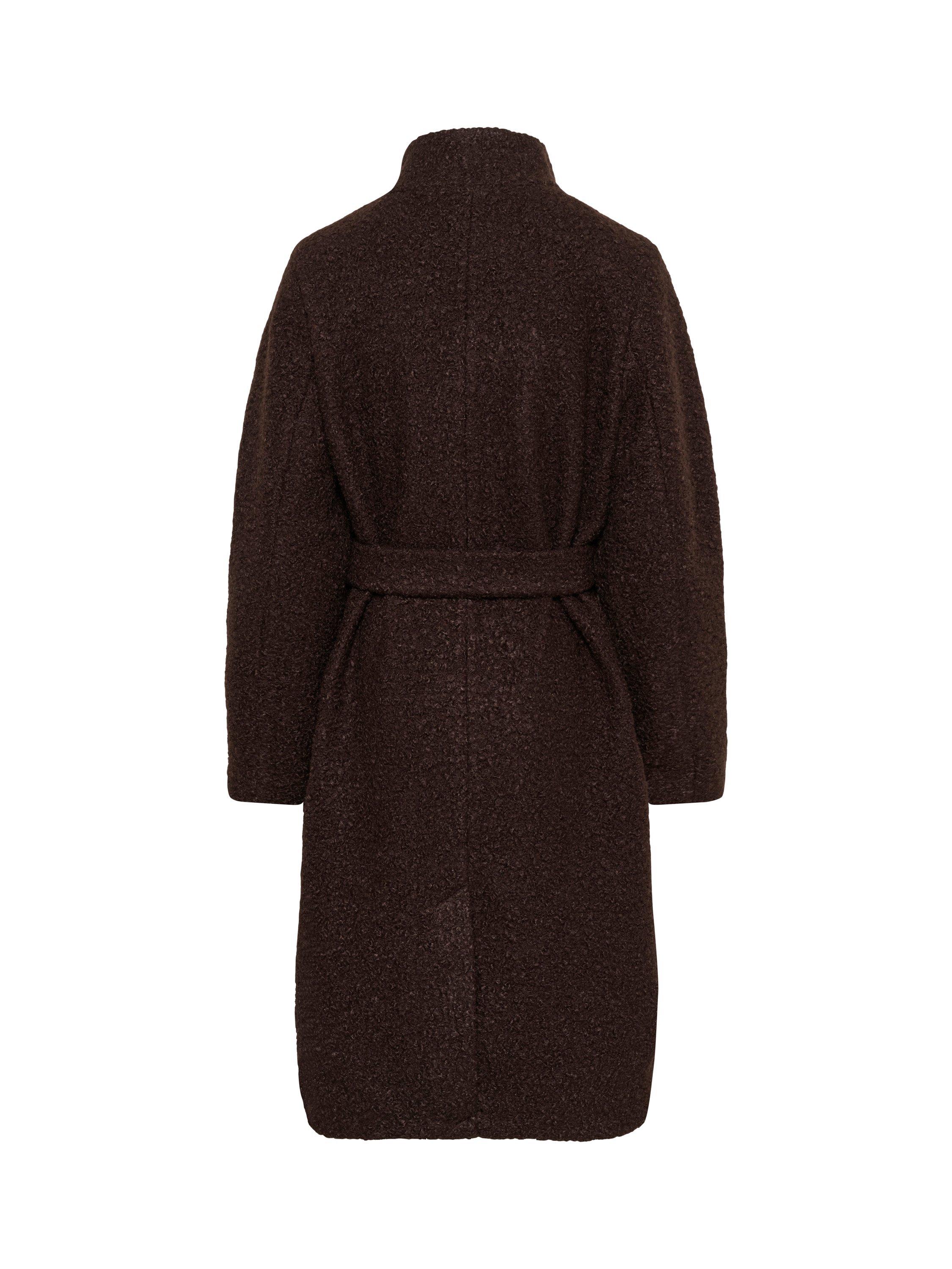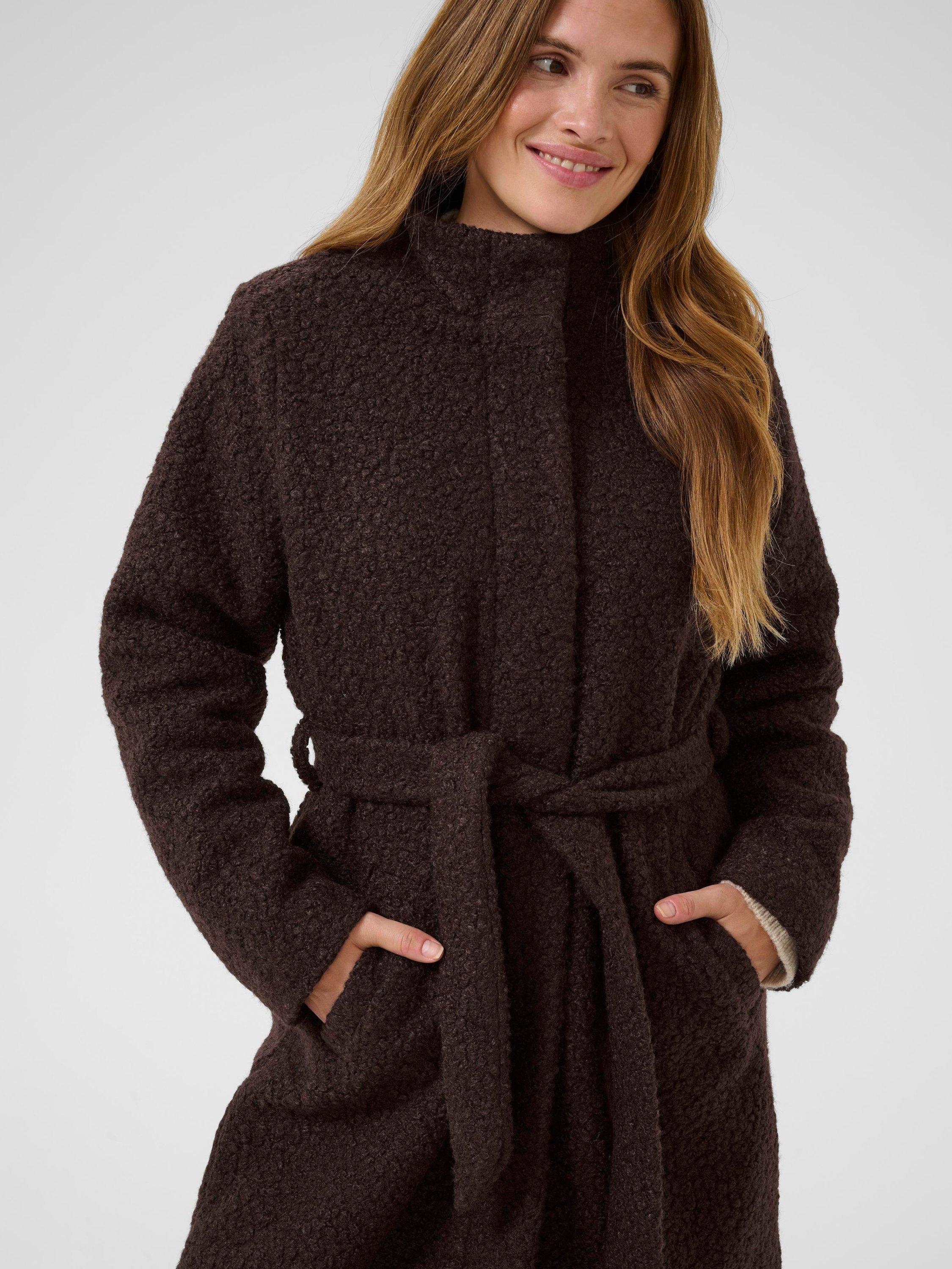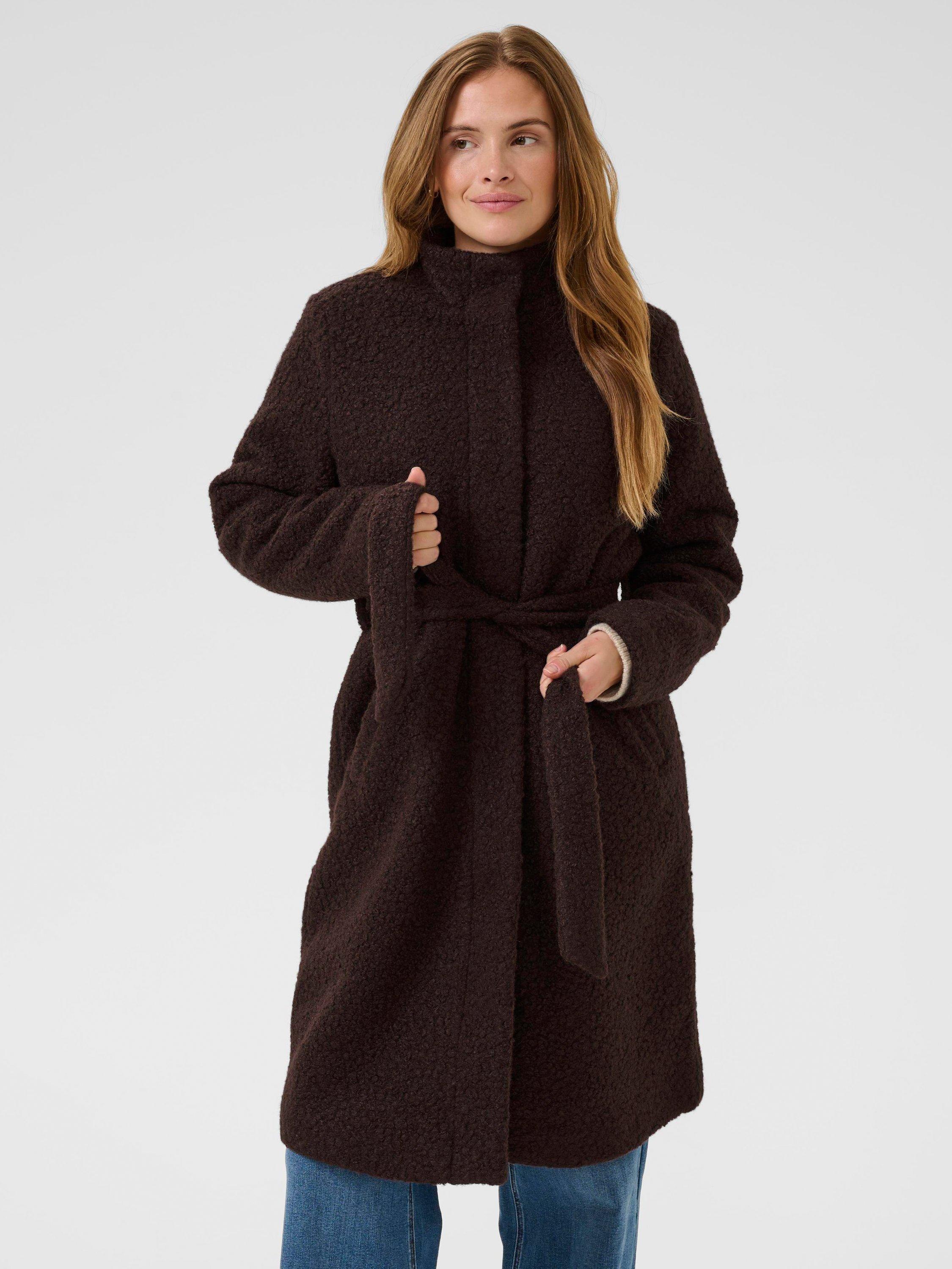 A KAFFE belted overcoat, designed to keep you comfortable and prepared. Its high neck and longline fit offer warmth and coverage, making your day easier in unpredictable weather.