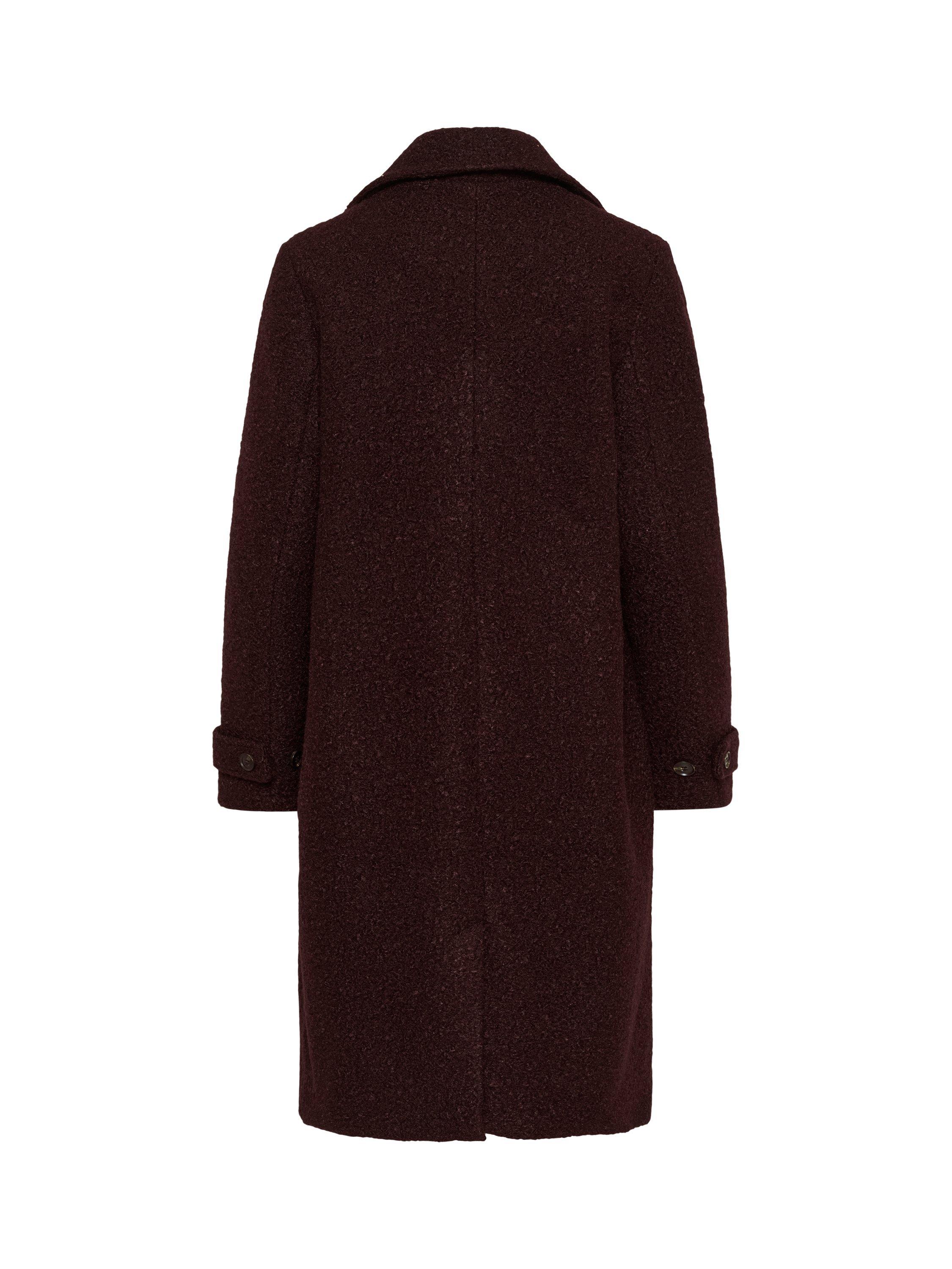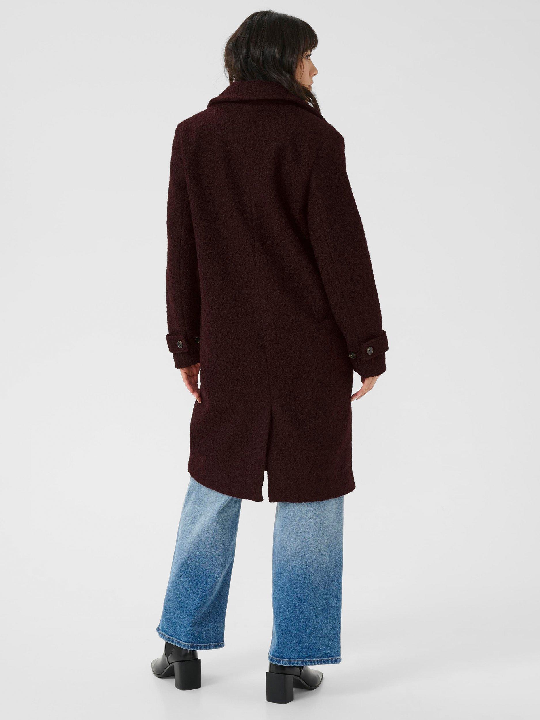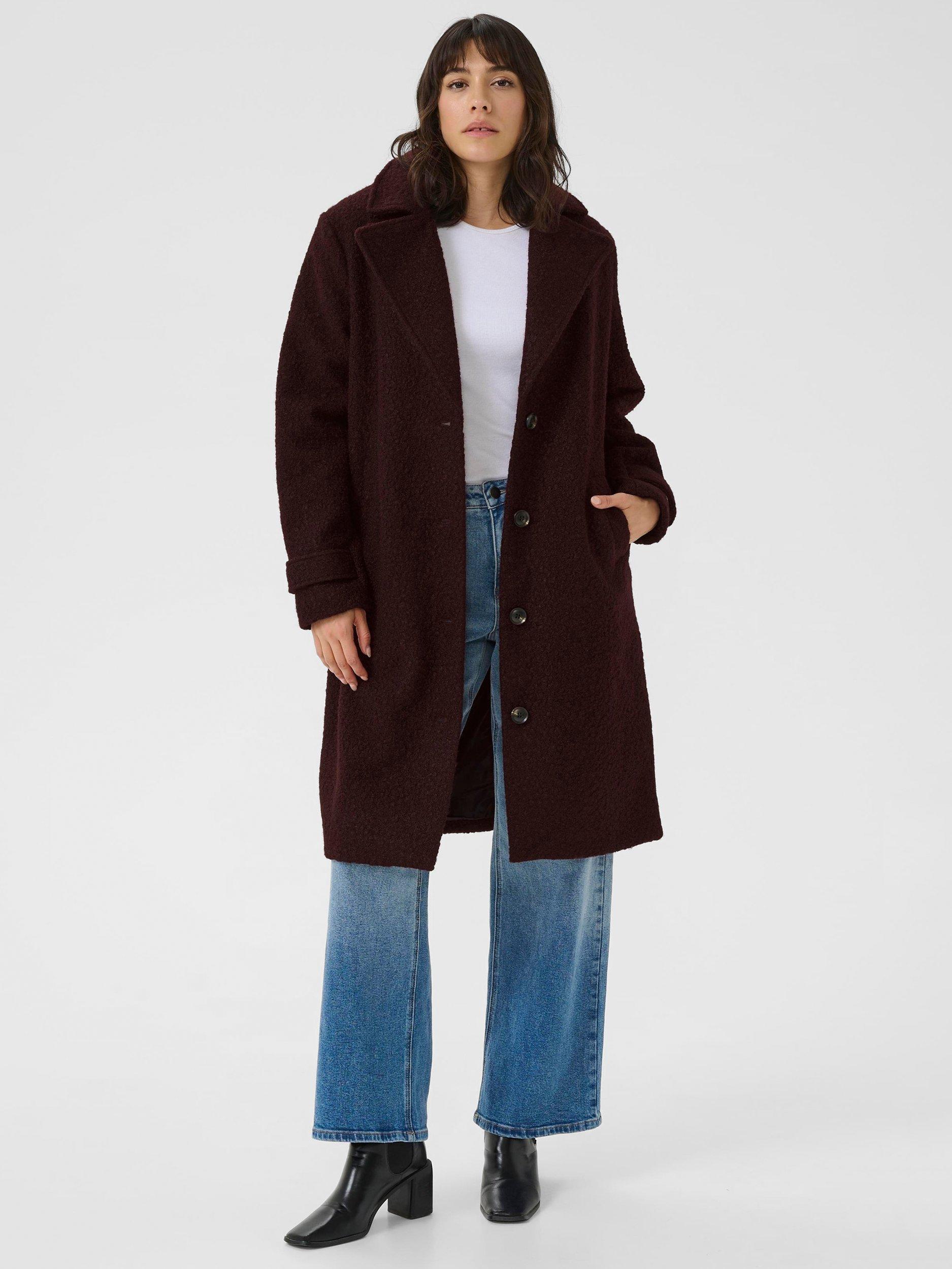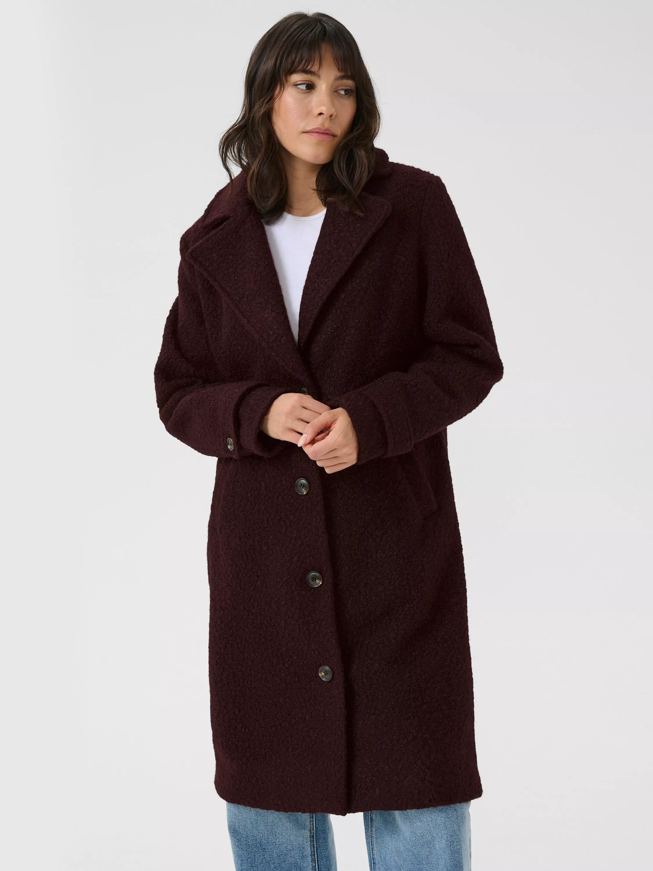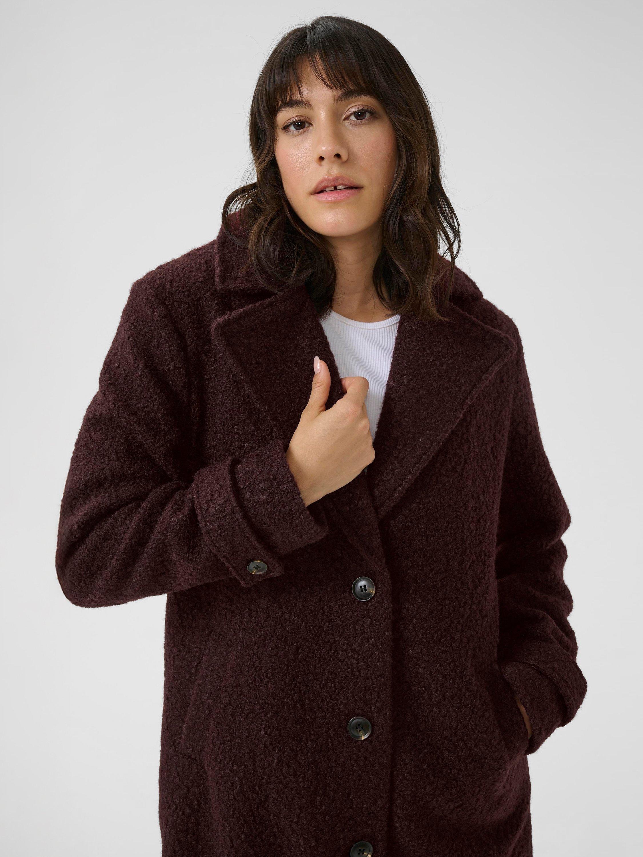 The anne coat is a classic coat in a soft and fluffy teddy fabric. It is cut right below the knees and it has a wide notch lapel. It is a single breasted coat that is fastened with four buttons, and it has oblique front pockets. The sleeves have a buttoned tab, and at the back the coat has a vent at the hem.