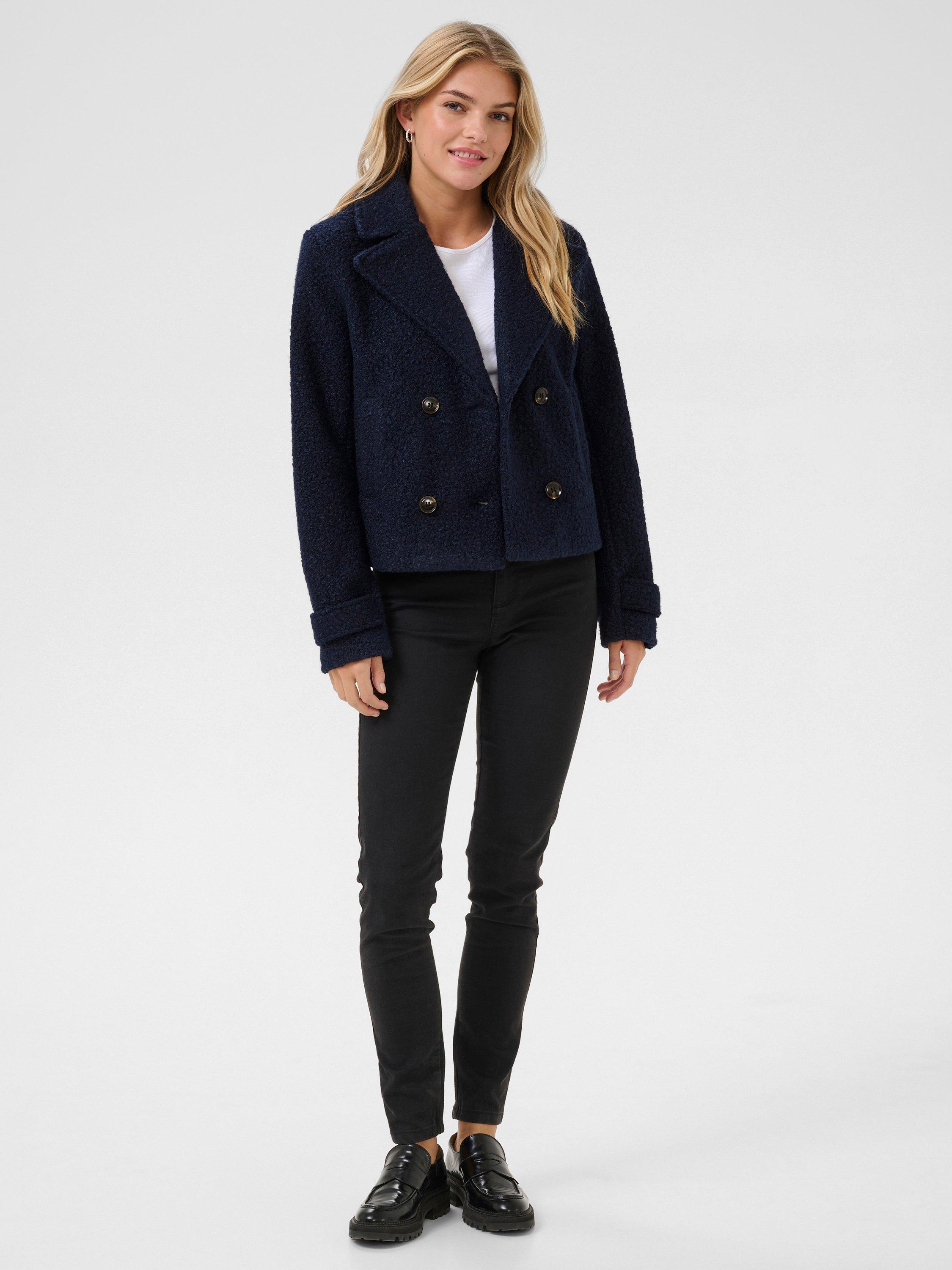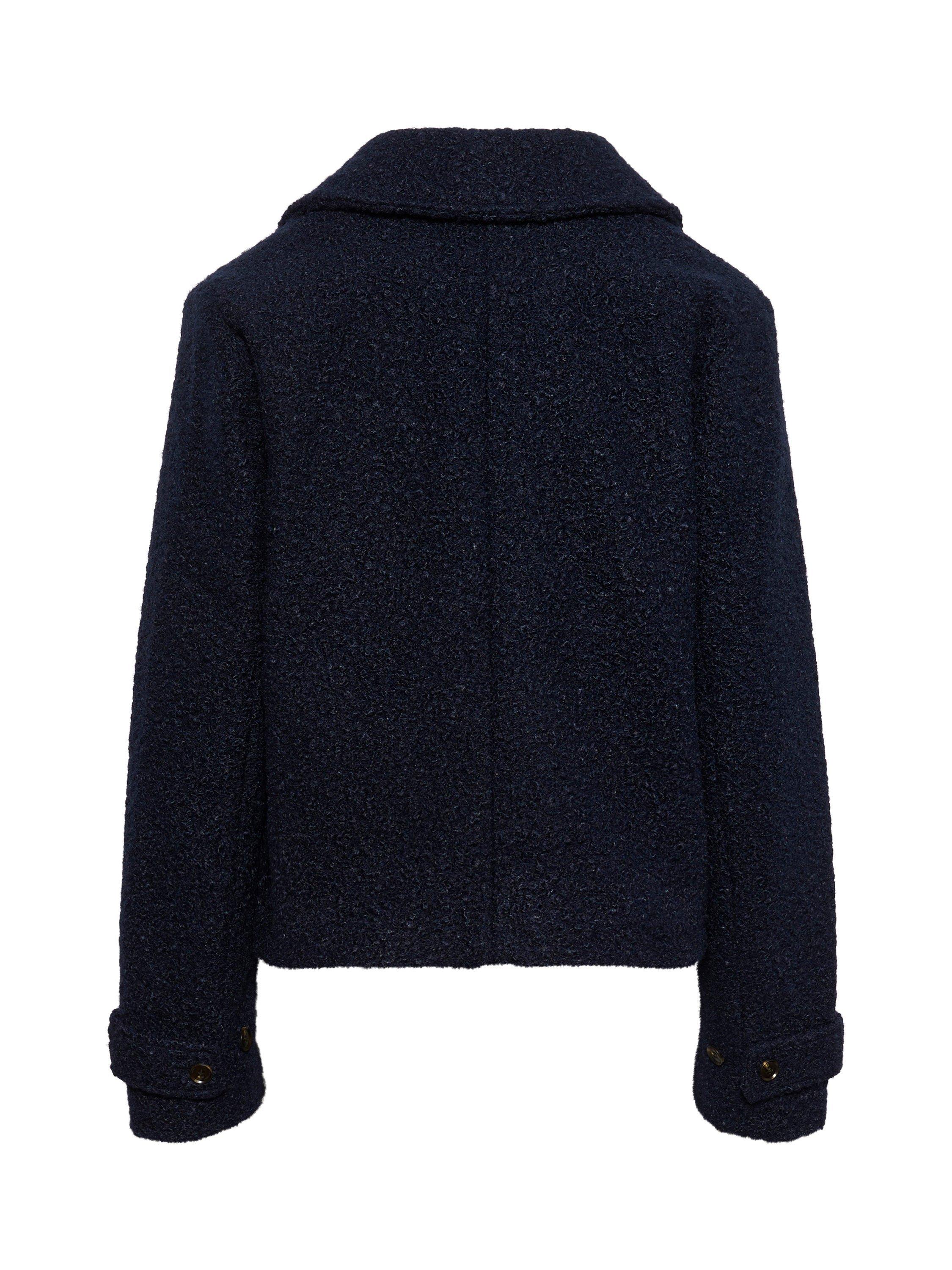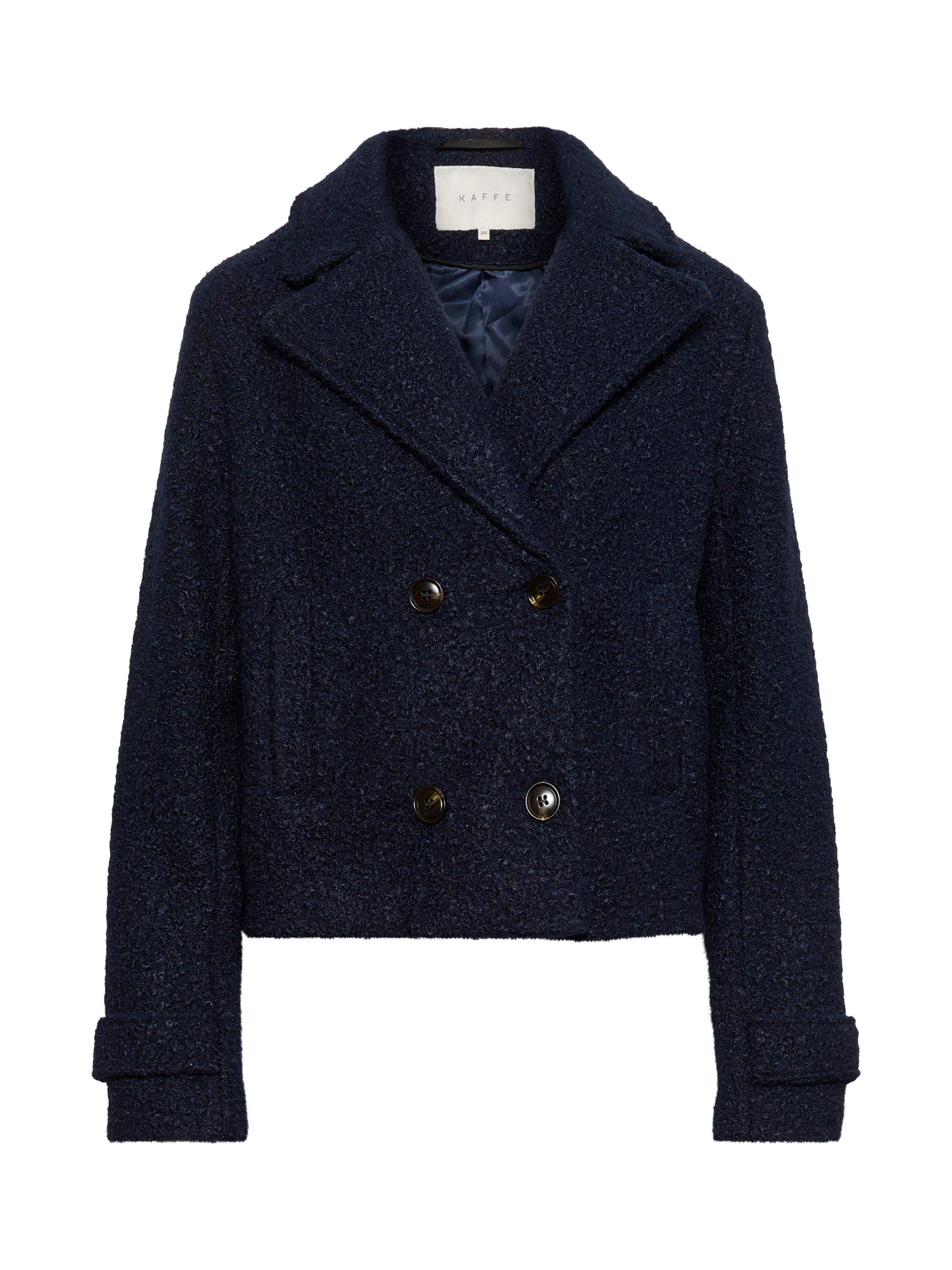 The anne jacket is the softest piece of outerwear this season. It is double-breasted with a notch lapel and it is made in a fluffy teddy fabric. The sleeves are long with buttoned sleeve tabs, and the jacket is cut at the hips and has slanted front pockets.