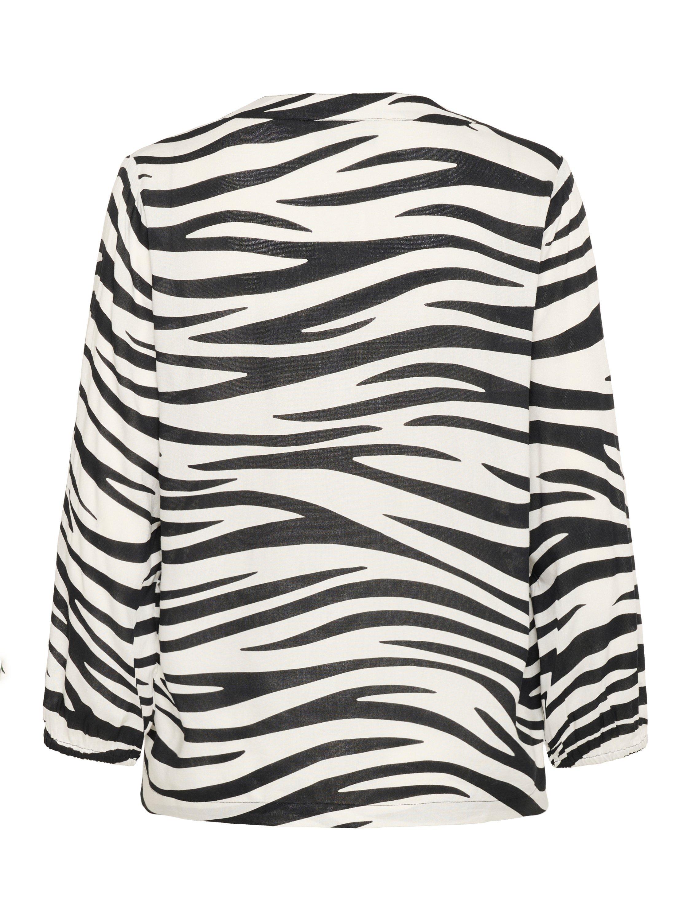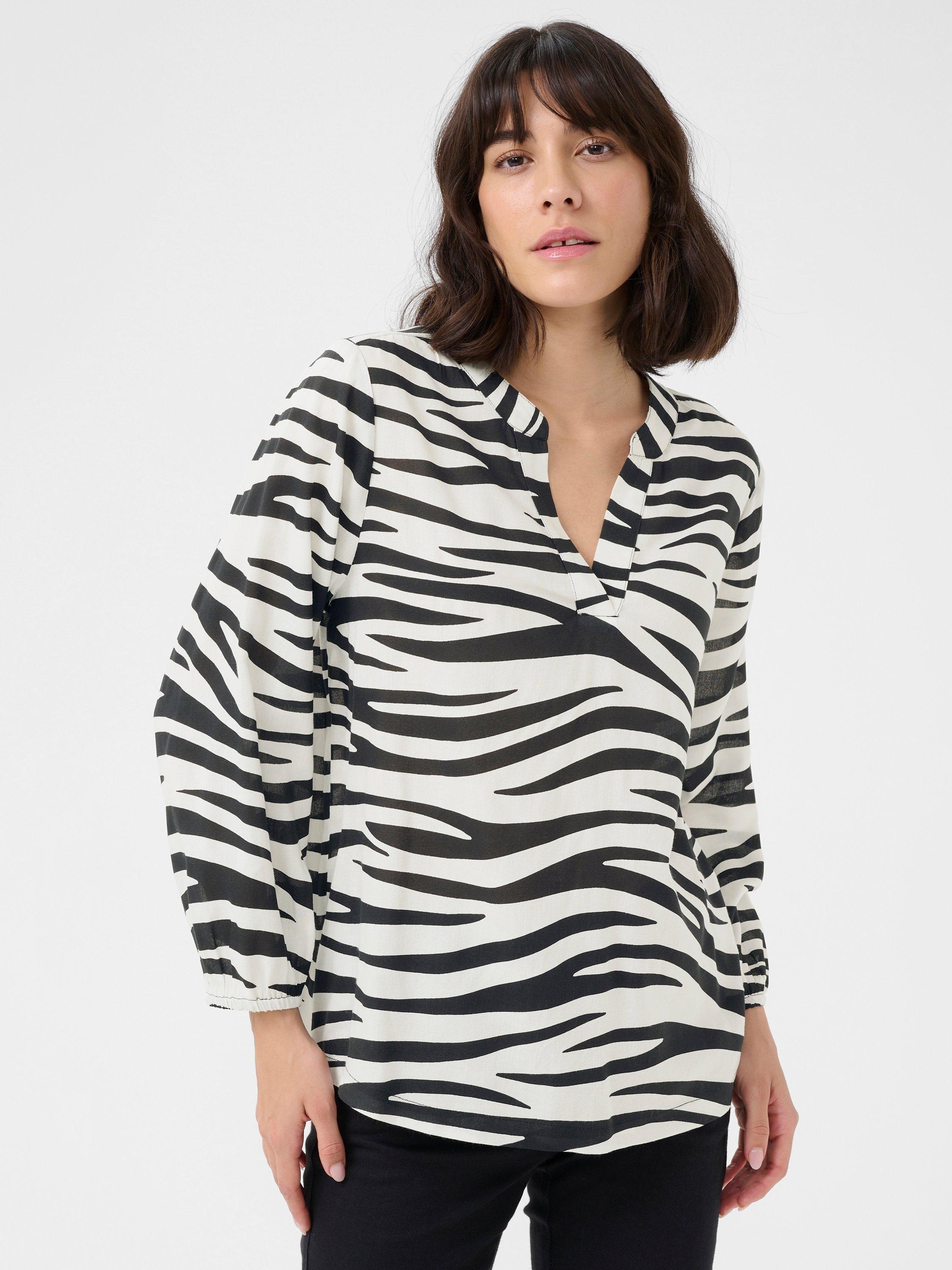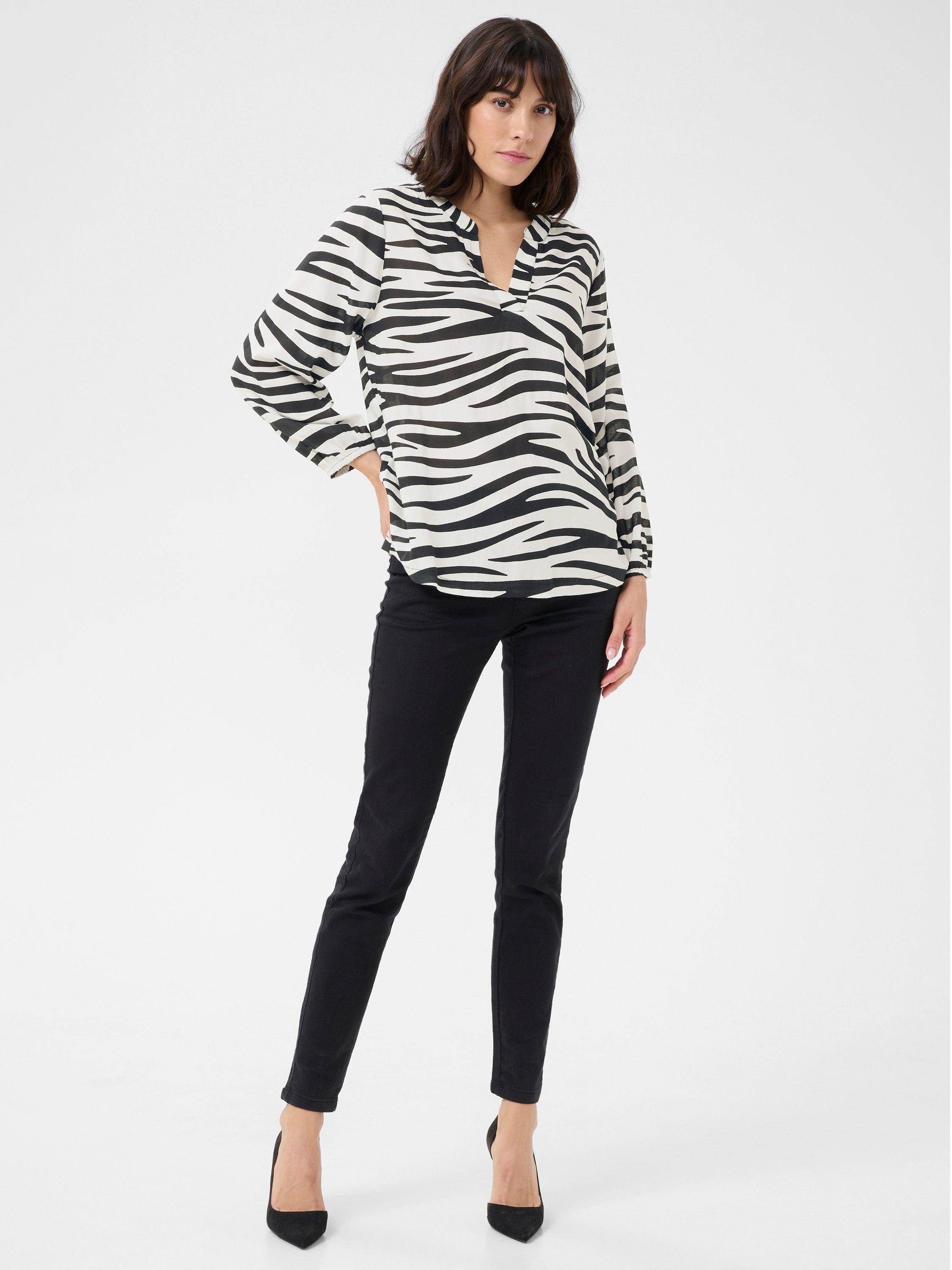 A simple top that will look great with anything. A regular fit that falls at the hip, it has a V-notch neck with a band collar. The sleeves are three-quarter-length bishop sleeves with an elastic edge.
