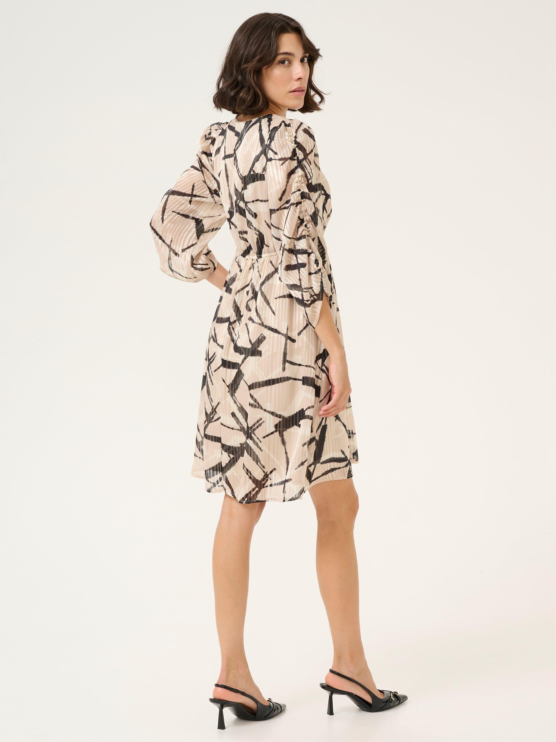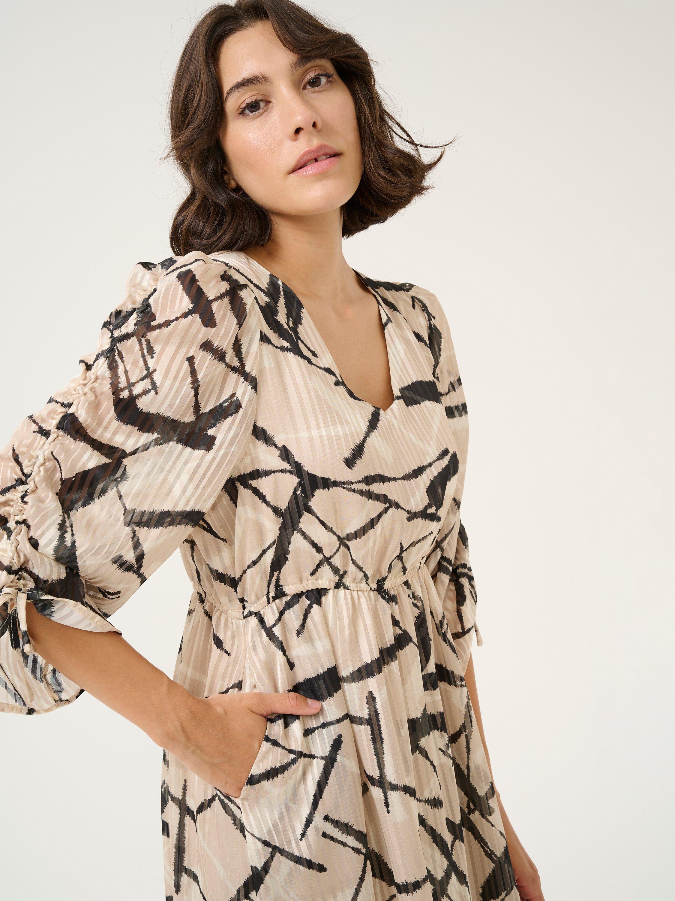 Offered in a universally flattering fit and flare shape, this knee length dress from KAFFE comes in a fabric that's built to last. Effortlessly flattering thanks to a fuss-free v-neckline and three quarter length sleeves, it intrigues with an abstract print.