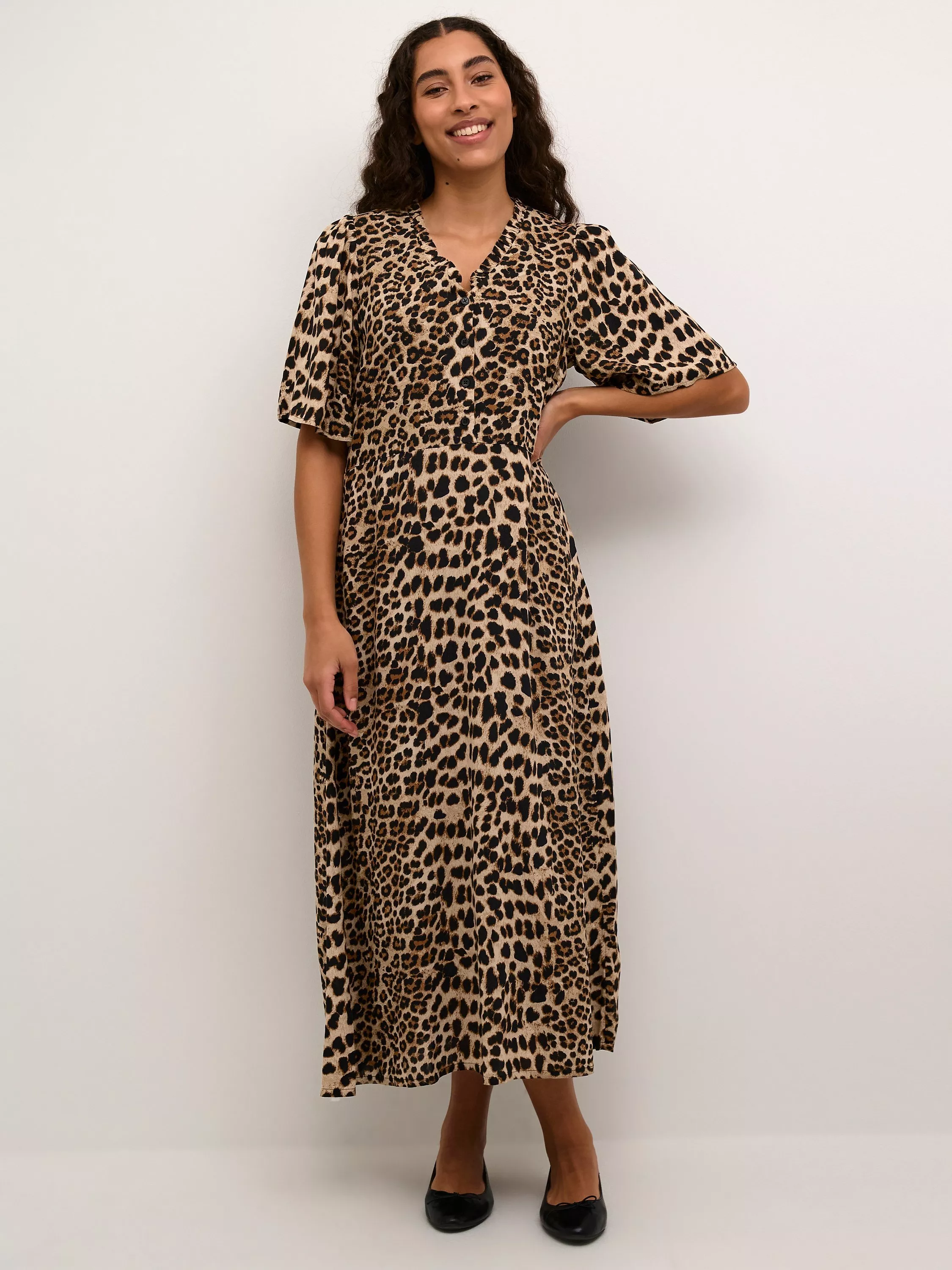 The arina maxi dress is an elegant everyday style in a great print. It has a V-neck and buttons down to the waistline, where it has a narrow tying belt. The sleeves are half length flutter sleeves, and the dress has a regular fit. The skirt is flared and comes down to the ankles.