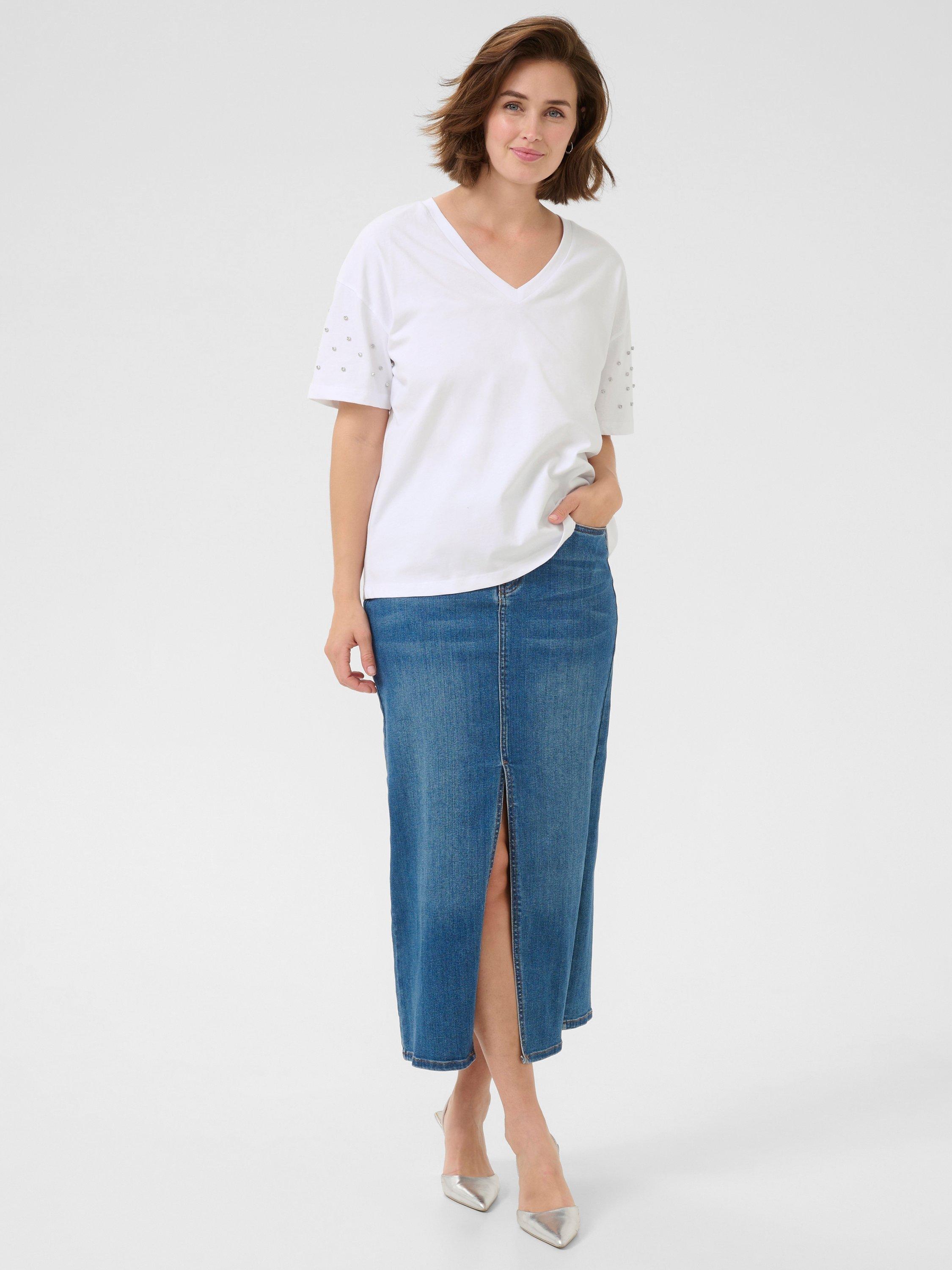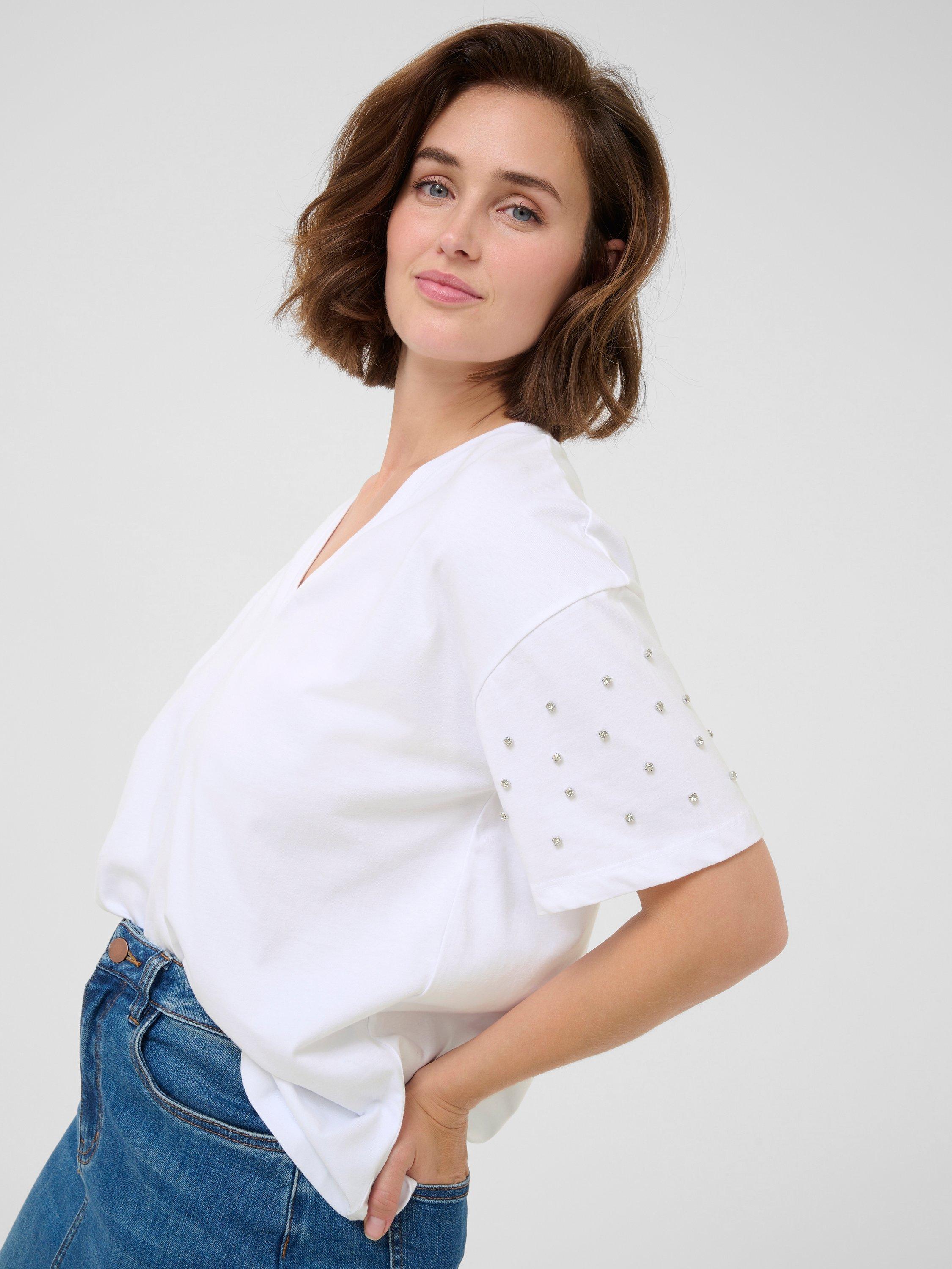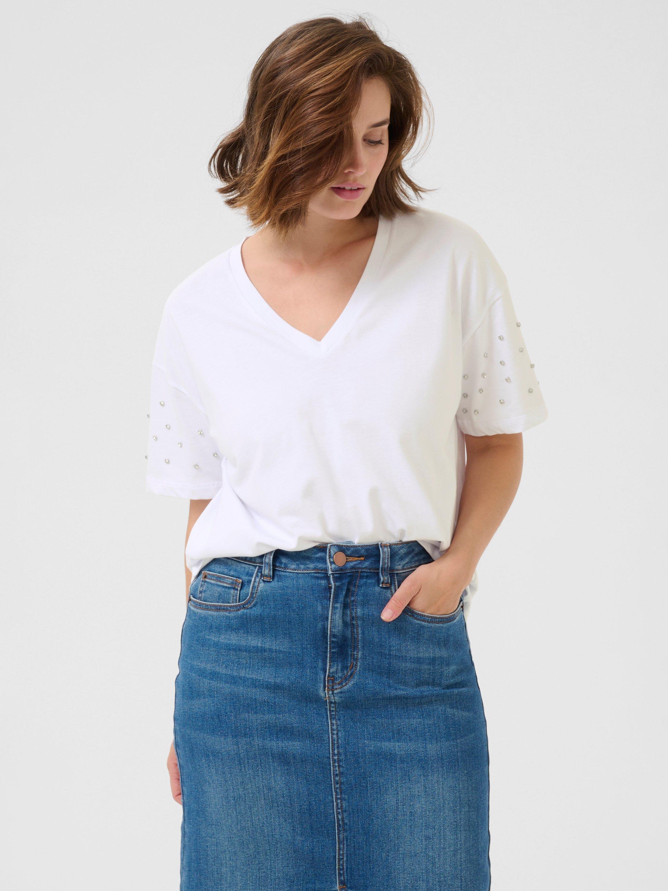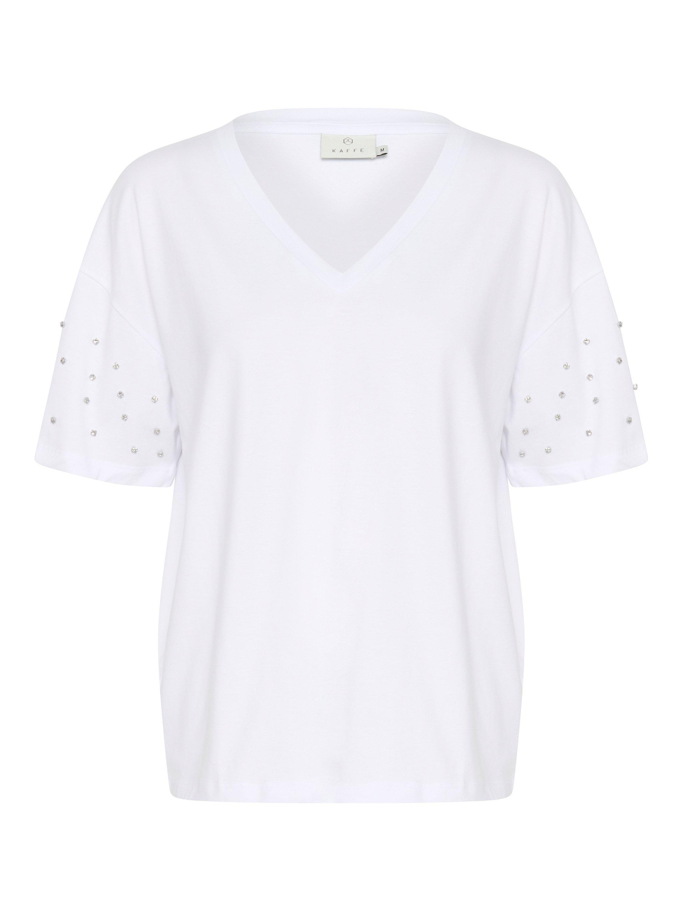 Bolstering your daytime collection, this t-shirt by KAFFE is crafted from 100% cotton for comfort and features a chic V-neck design with embellished sleeves.