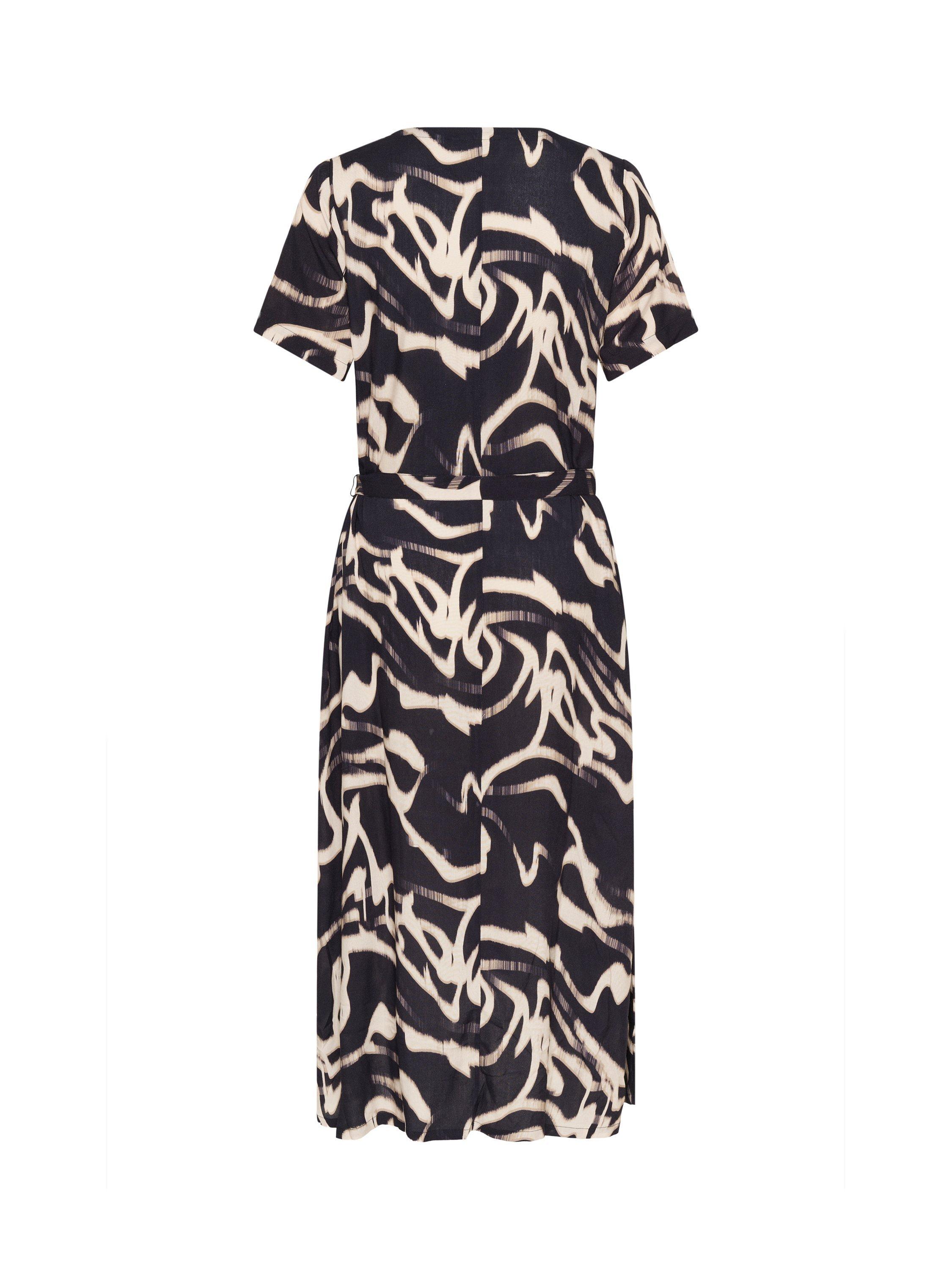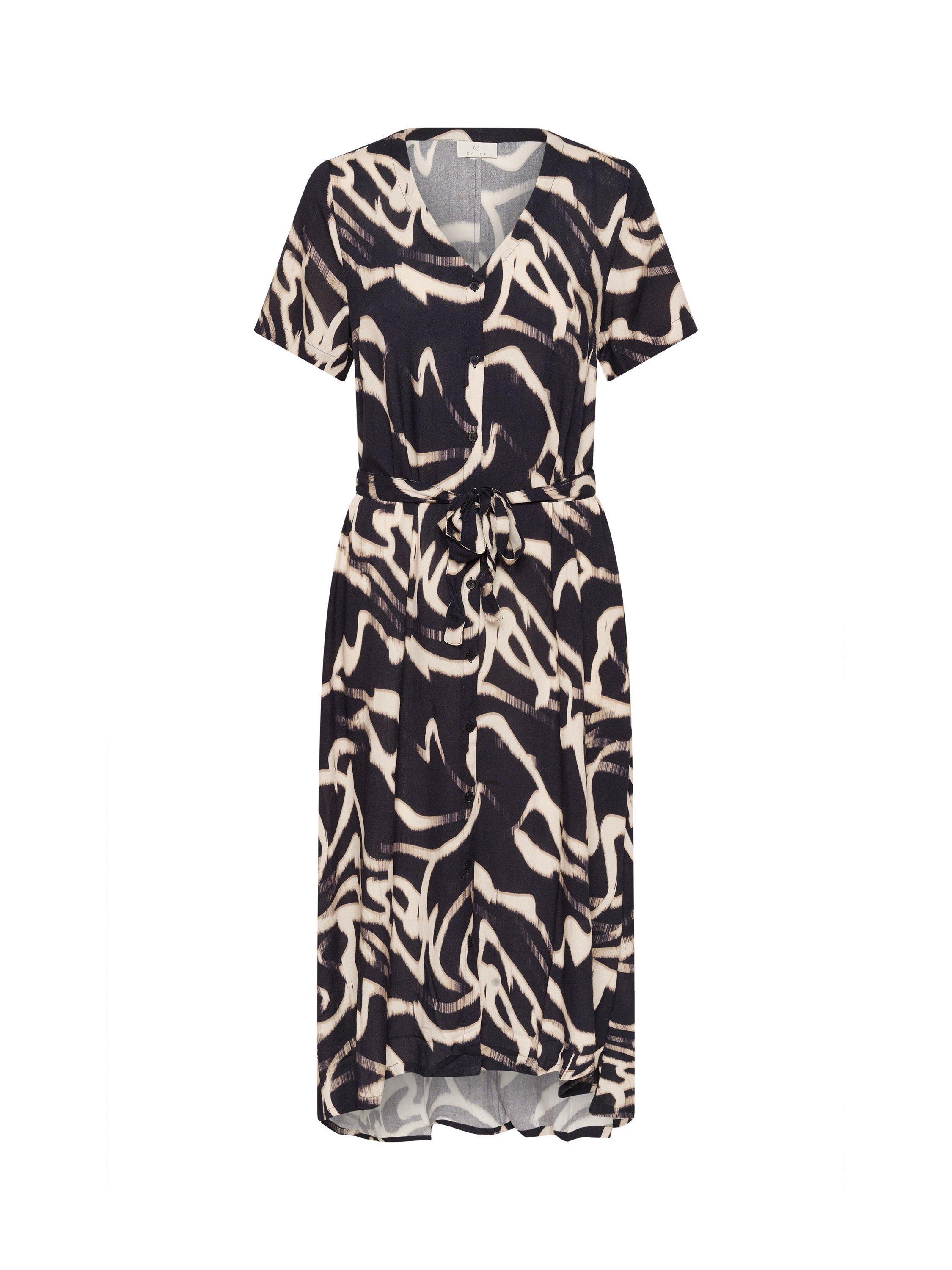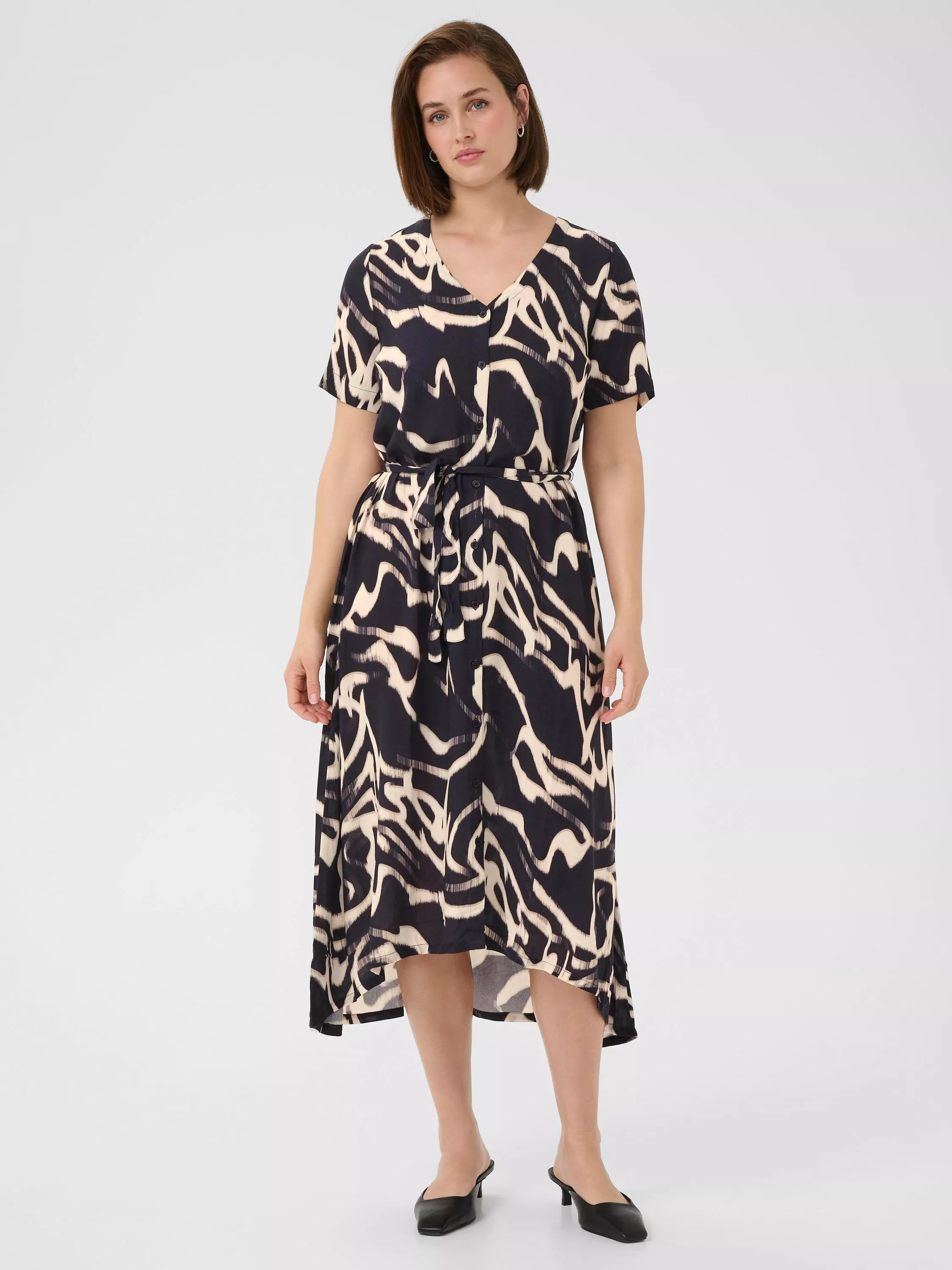 KAFFE's midi A-line dress reimagines daywear with striking floral prints and a thoughtfully crafted V-neck. Soft viscose drapes with ease, an instant favourite for those who seek personality and comfort in every detail.