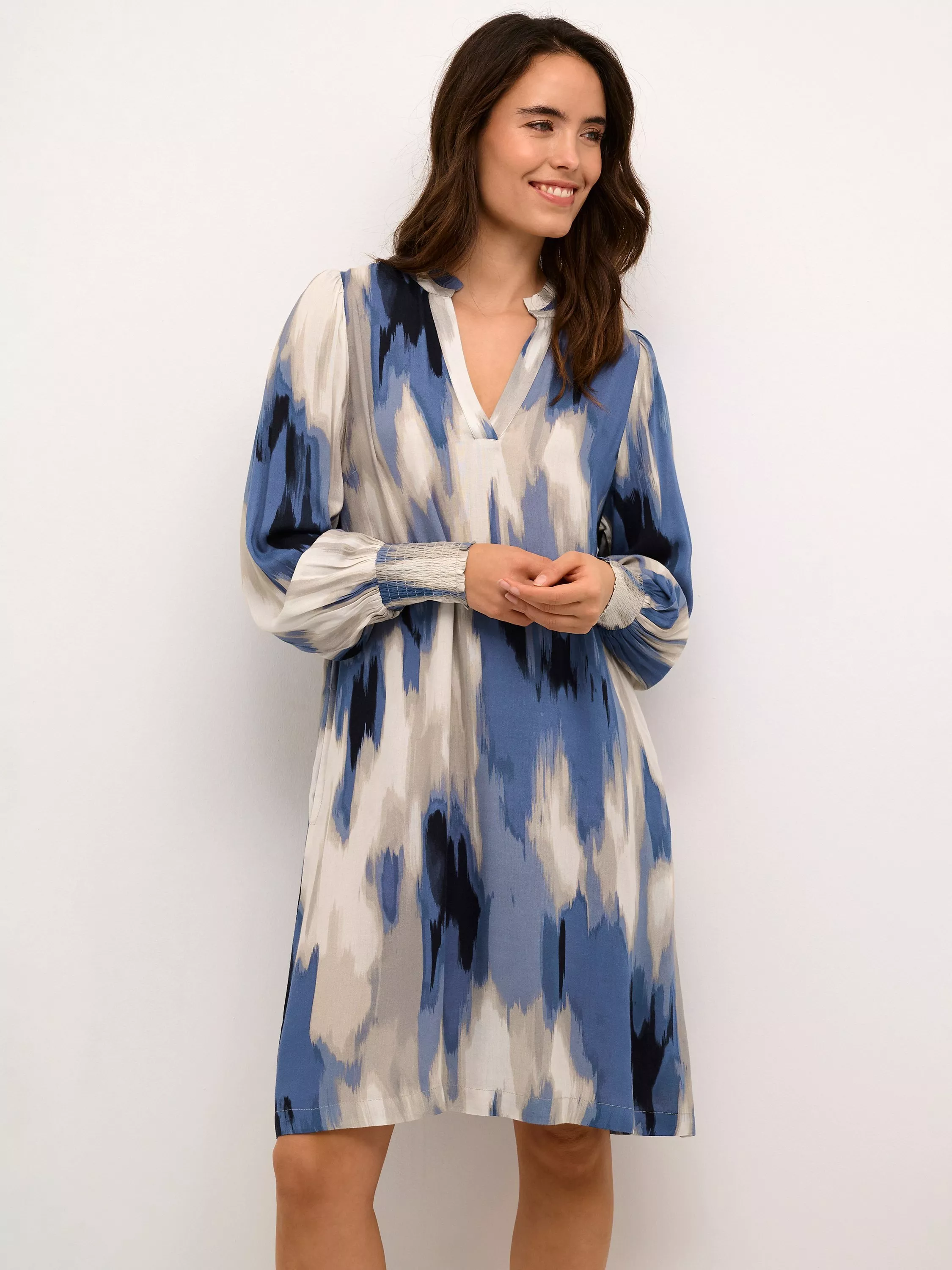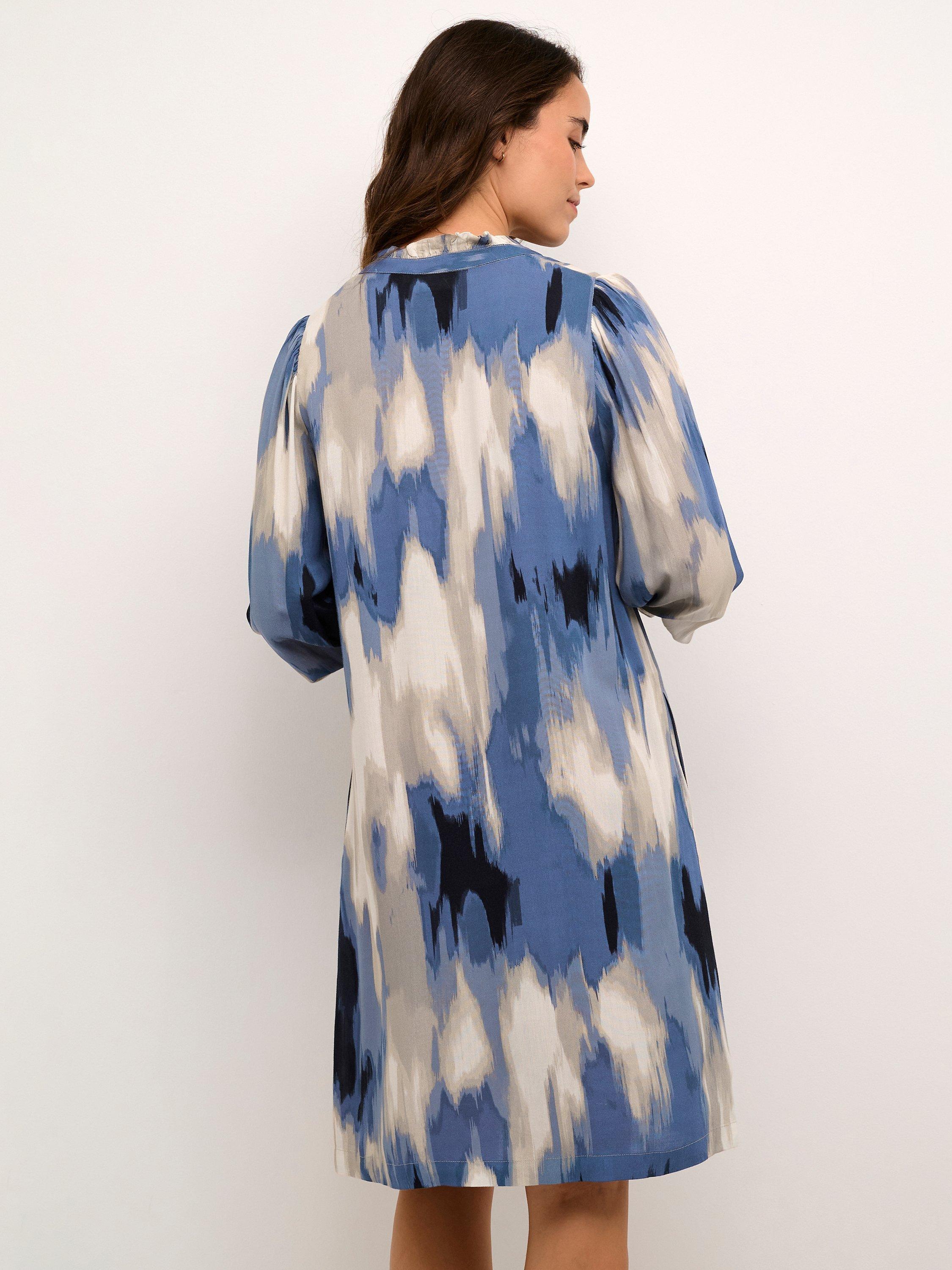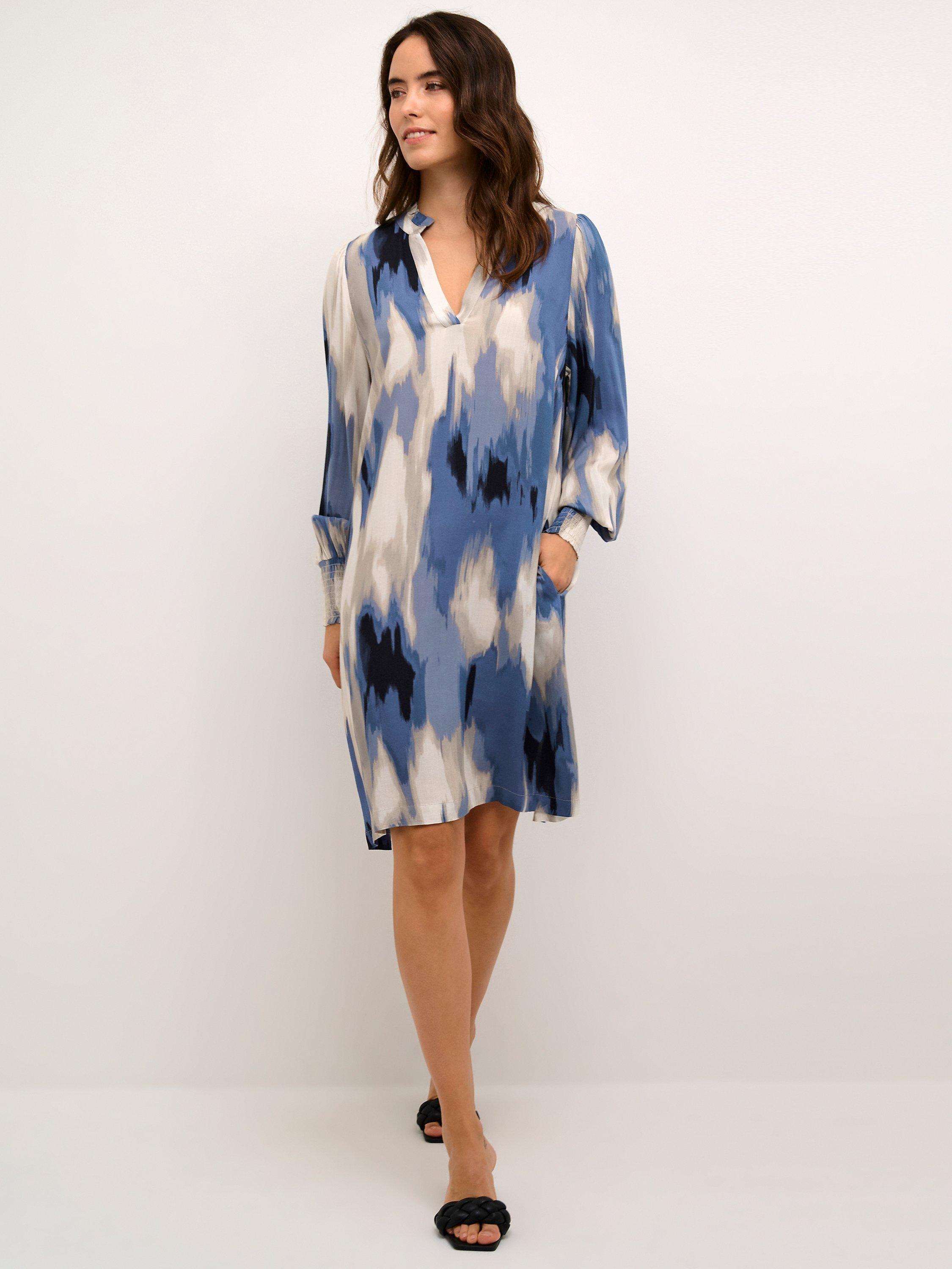 The Beathe dress is cool and cute and can be used anywhere. It has a V-notch neck with a frilled collar, and it has a casual fit with an A-line silhouette, The sleeves are long and loose, and they are gathered in a wide, smock cuff. The dress is cut above the knees and has seamed side pockets.
