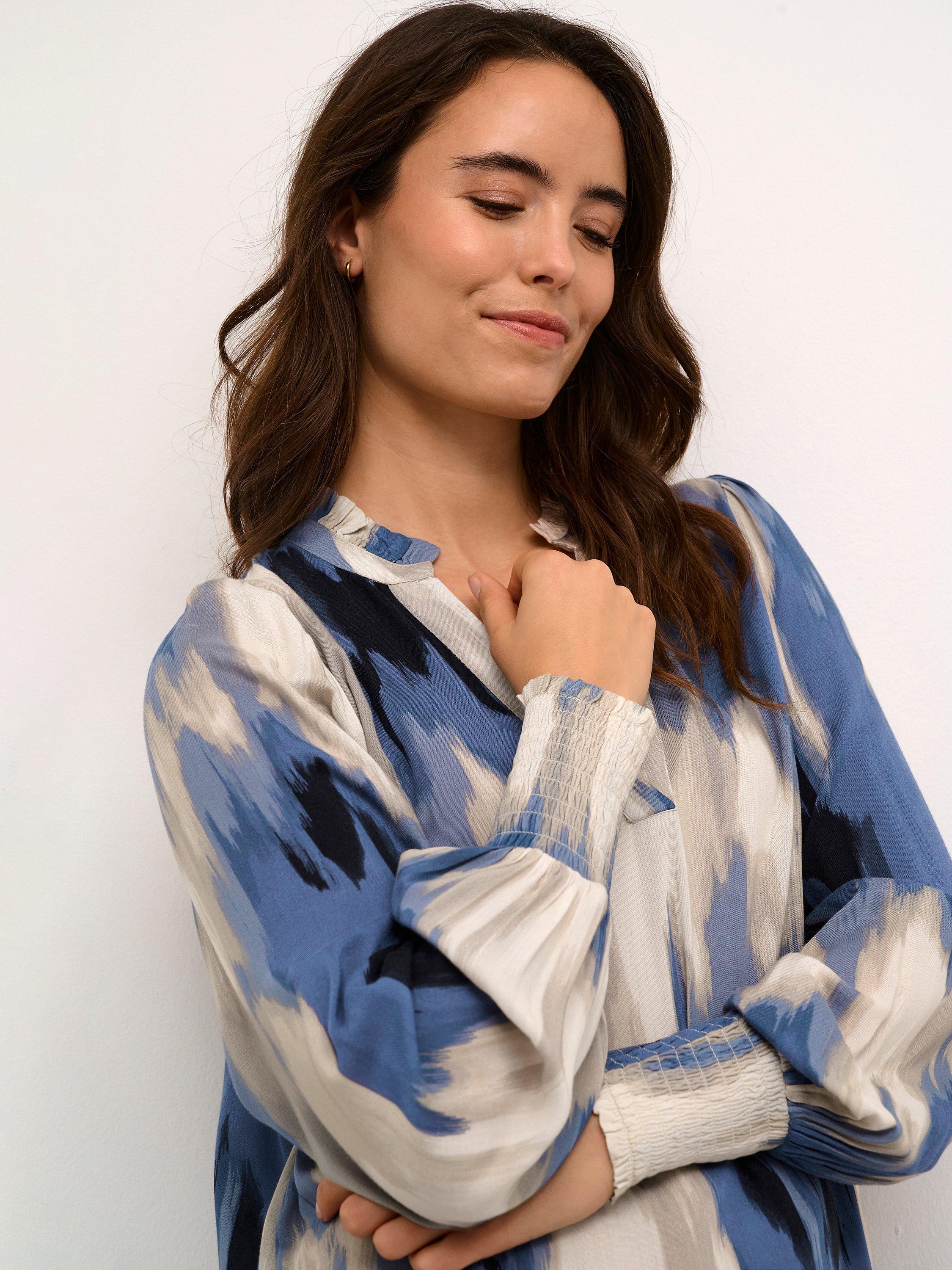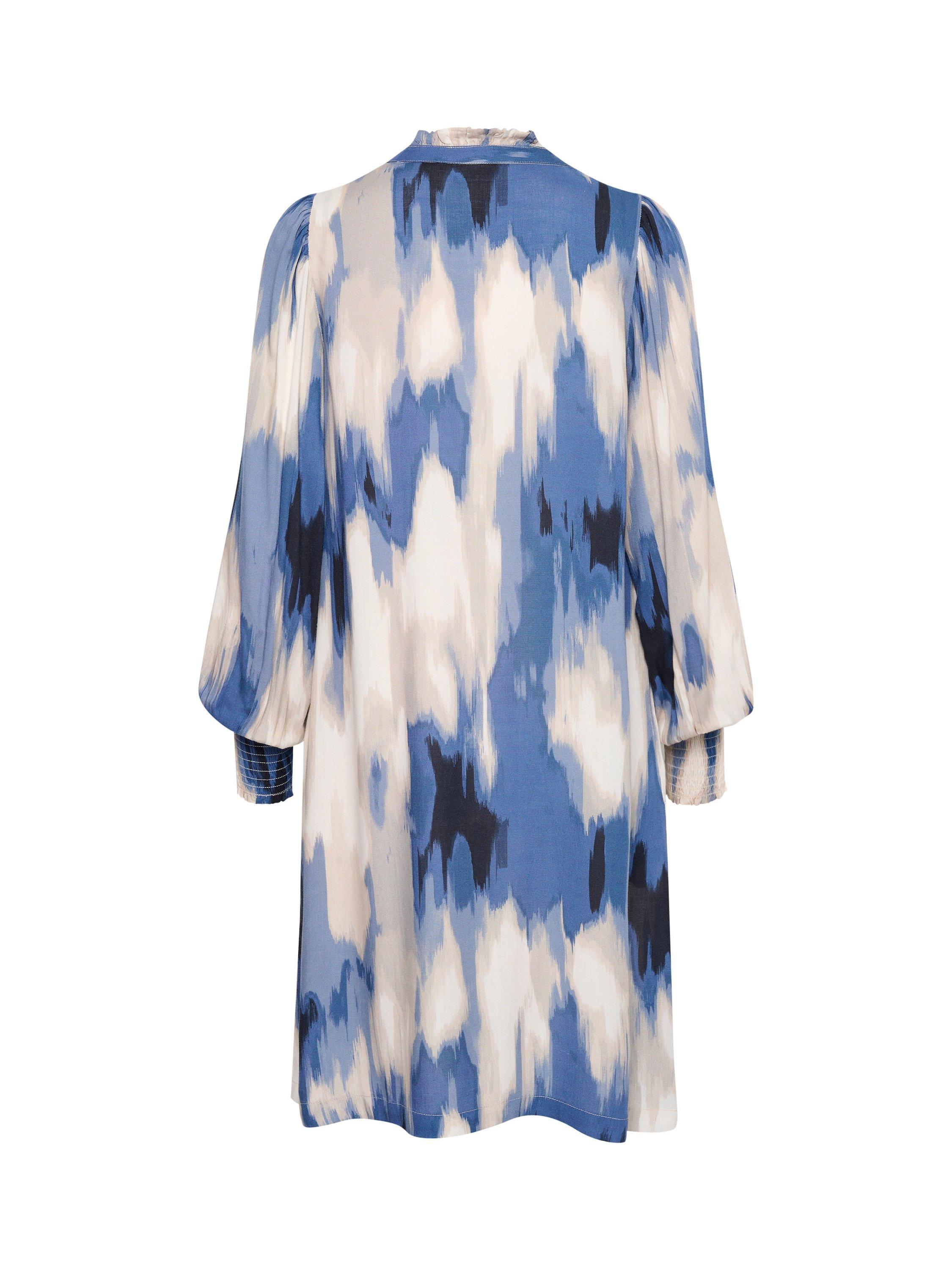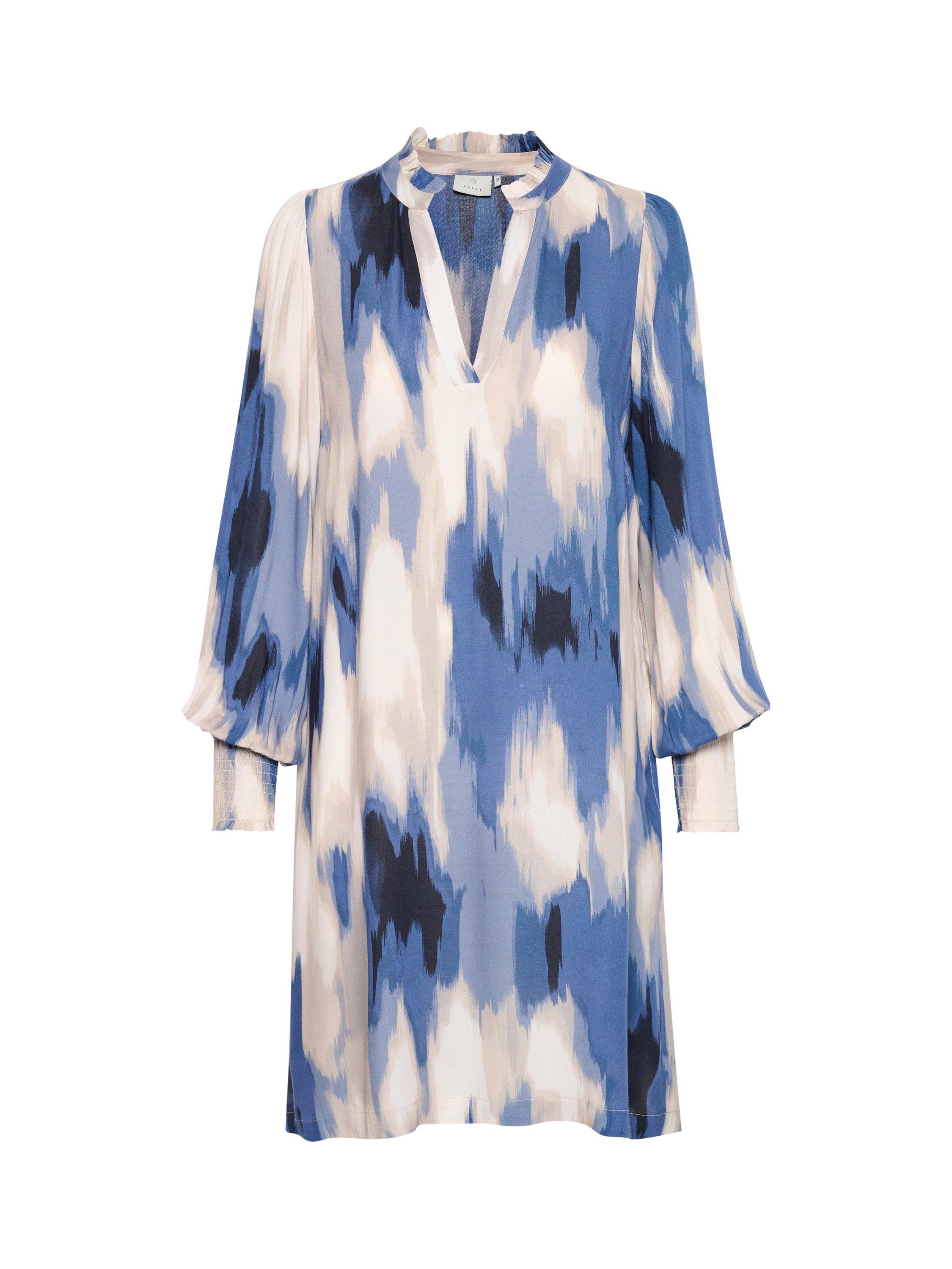 The Beathe dress is cool and cute and can be used anywhere. It has a V-notch neck with a frilled collar, and it has a casual fit with an A-line silhouette, The sleeves are long and loose, and they are gathered in a wide, smock cuff. The dress is cut above the knees and has seamed side pockets.