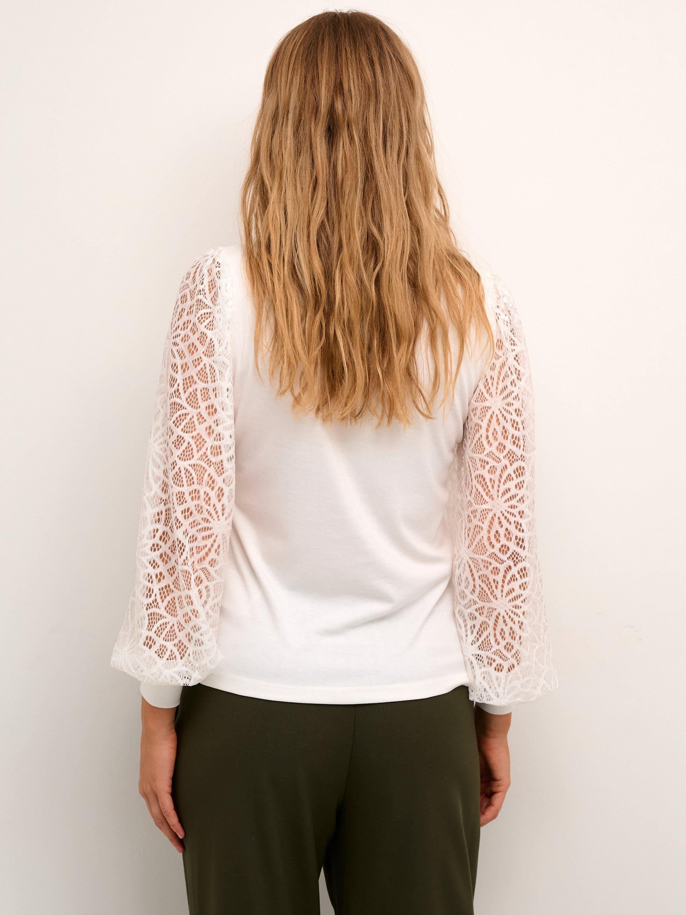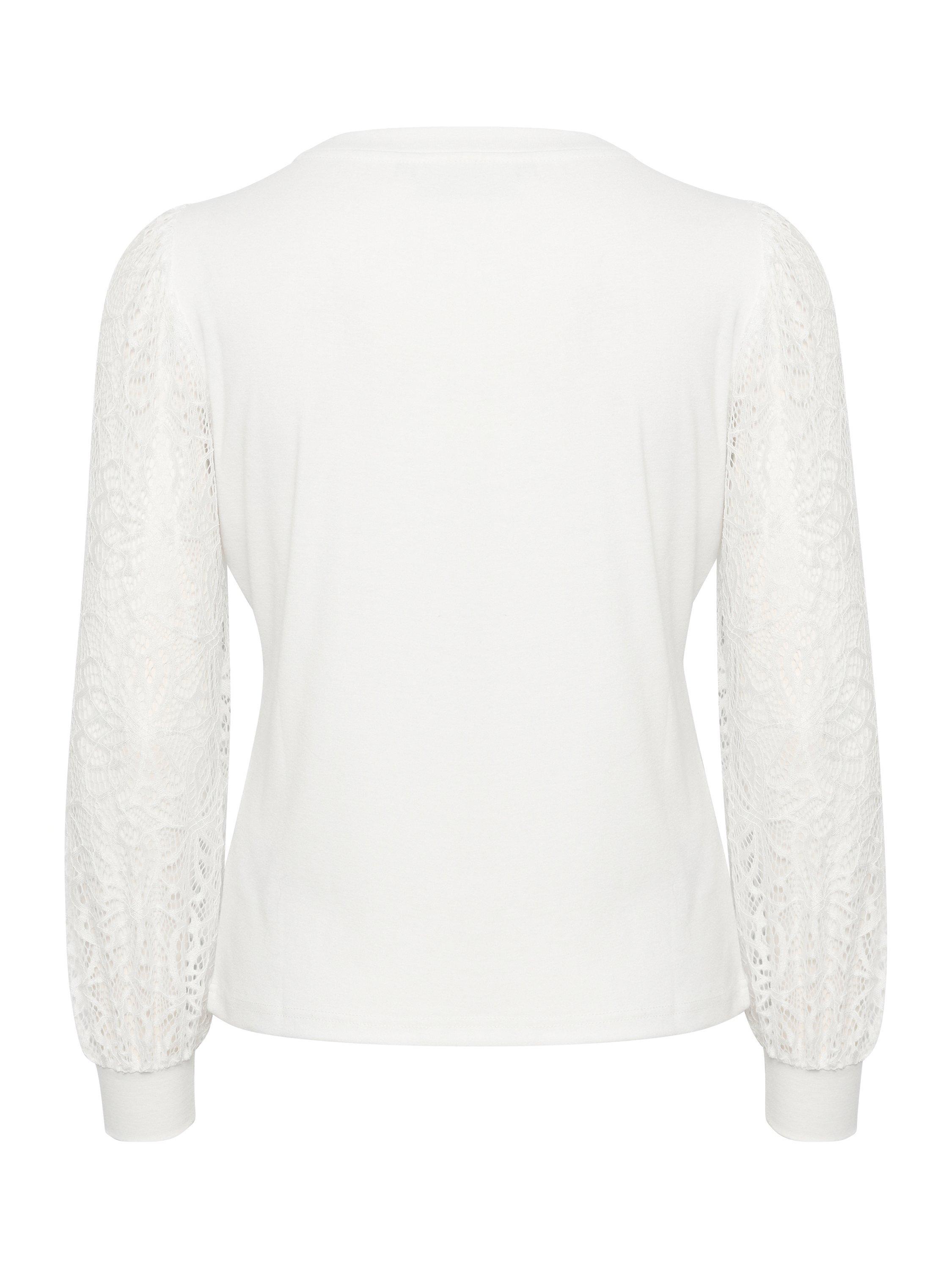 The becca blouse is a simple and elegant jersey top, that you can wear with any outfit for a feminine look. The sleeves are made in a sheer and floral lace fabric, and they are gathered in a jersey cuff. The blouse has a crew neckline, a regular fit and it is cut at the hips.