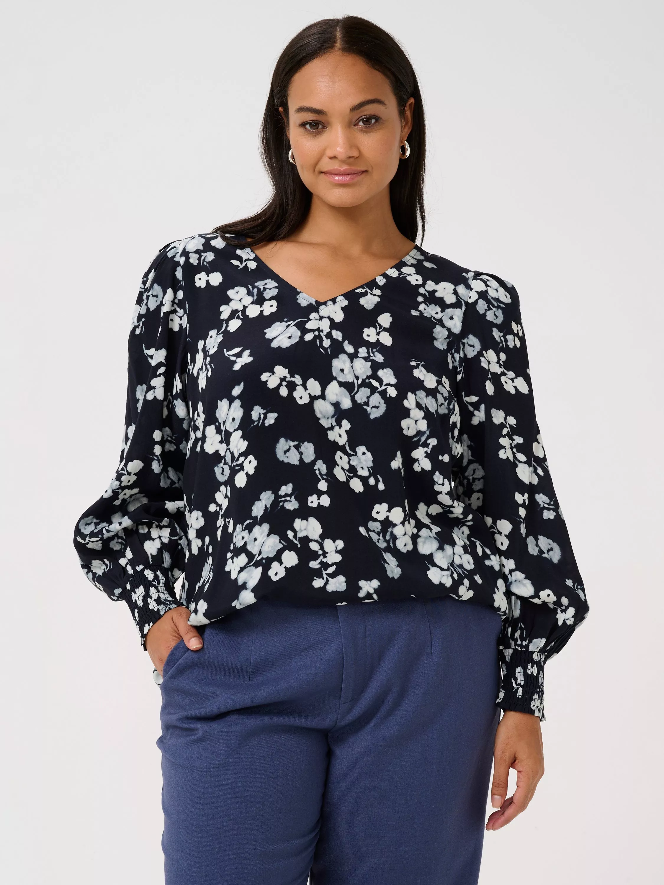 An effortless choice, this blouse from KAFFE Curve is doused in florals. With a flattering v-neckline and long sleeves, it is made with light yet robust fabric for longevity of wear and will slot seamlessly into your everyday staples.