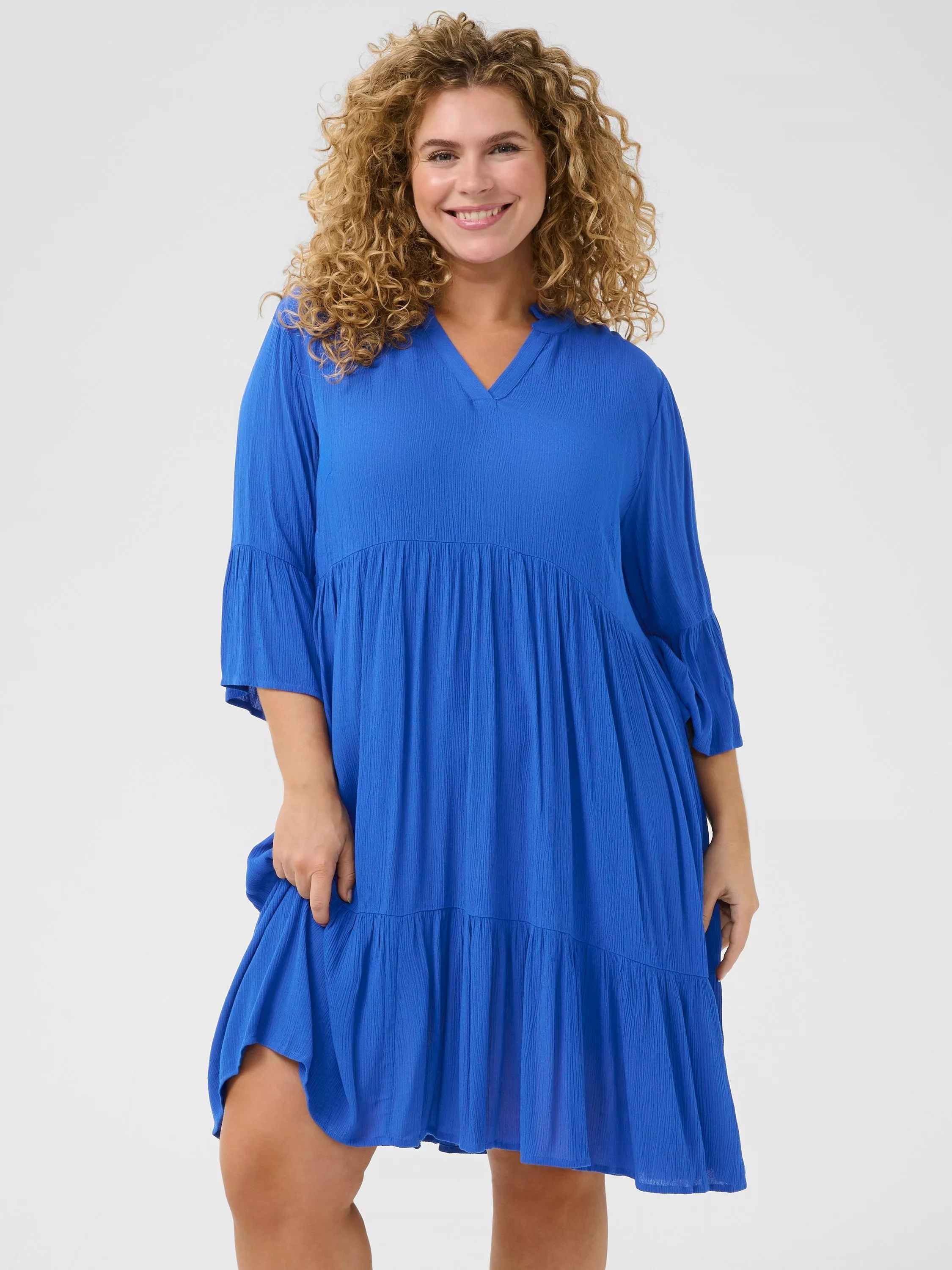 Cut to drop into a tiered silhouette, this knee length dress from KAFFE Curve is made from liquid-like viscose. With a fuss-free but smart v-neckline and three quarter length sleeves, this style comes without pattern or print so you can set your imagination and creativity free when it comes to accessorising.