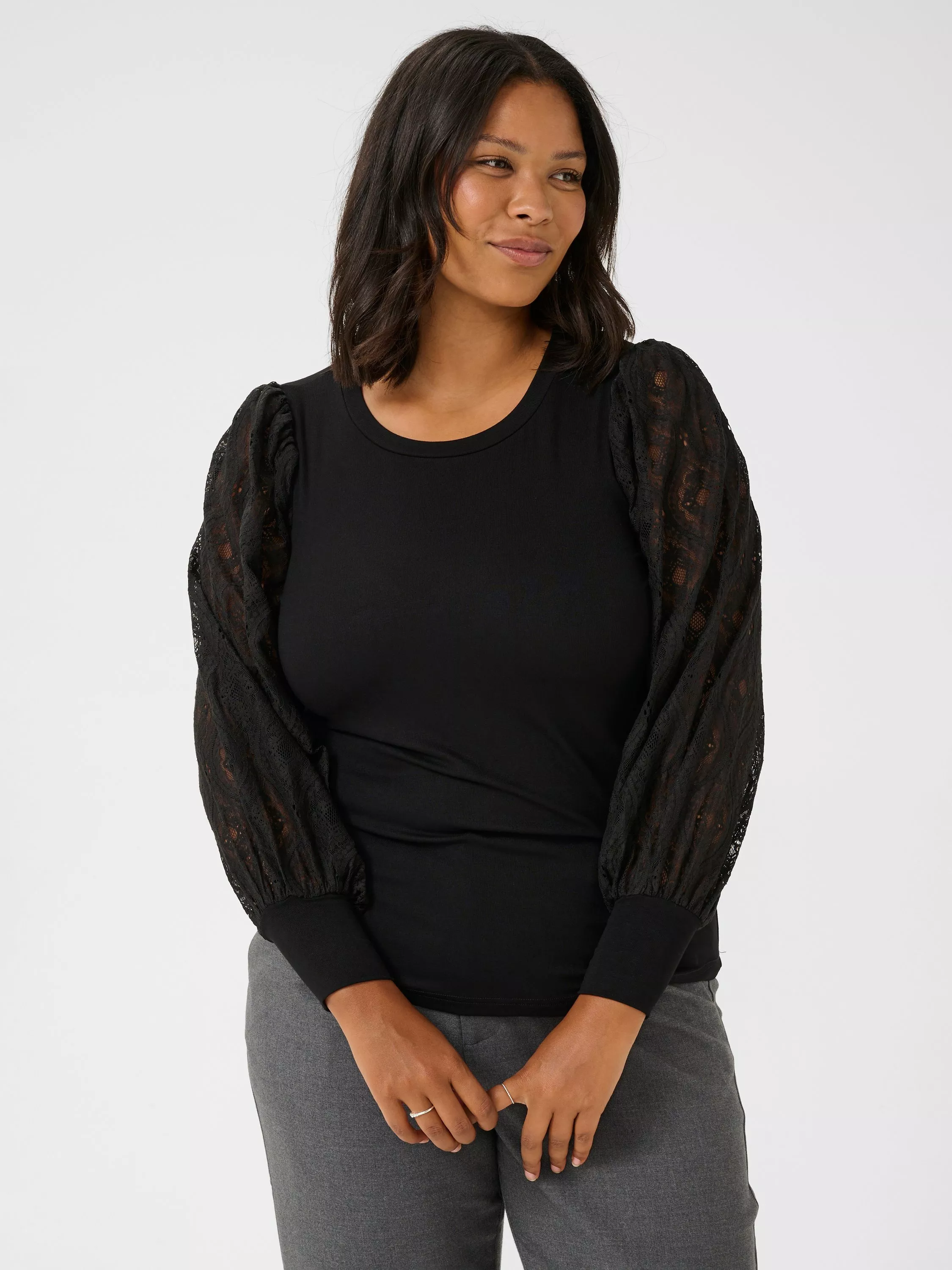 This stylish top combines simplicity with sophistication, featuring a fitted silhouette and striking lace puff sleeves. The intricate lace detail adds a feminine touch, while the stretchy fabric ensures all-day comfort. Perfect for pairing with jeans or trousers, it transitions effortlessly from casual outings to evening events.