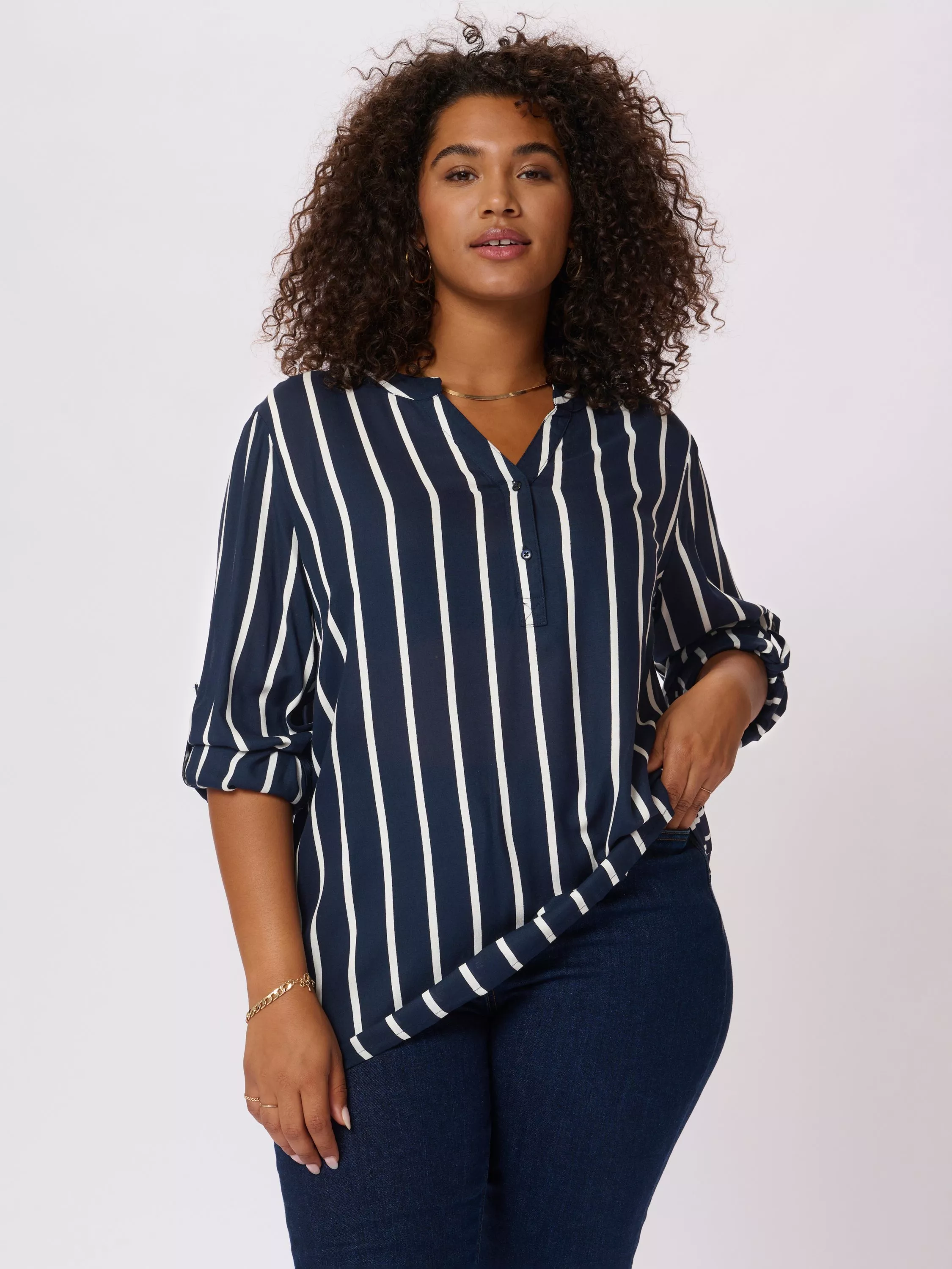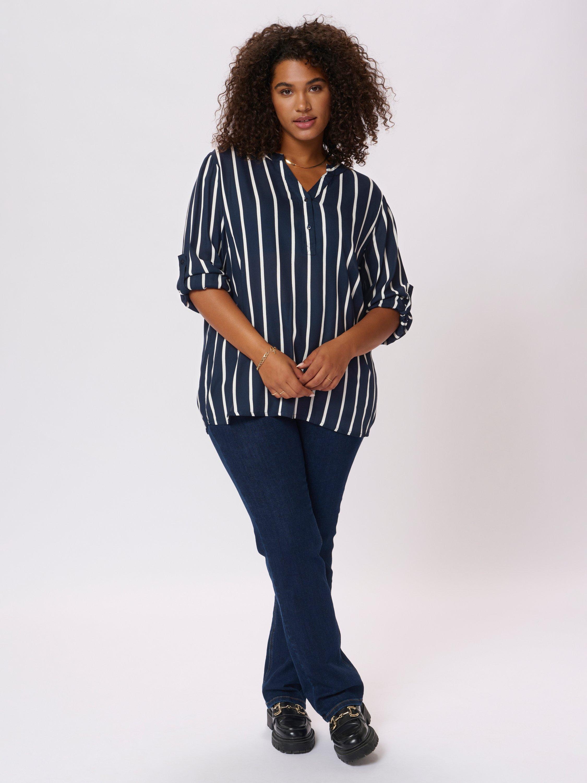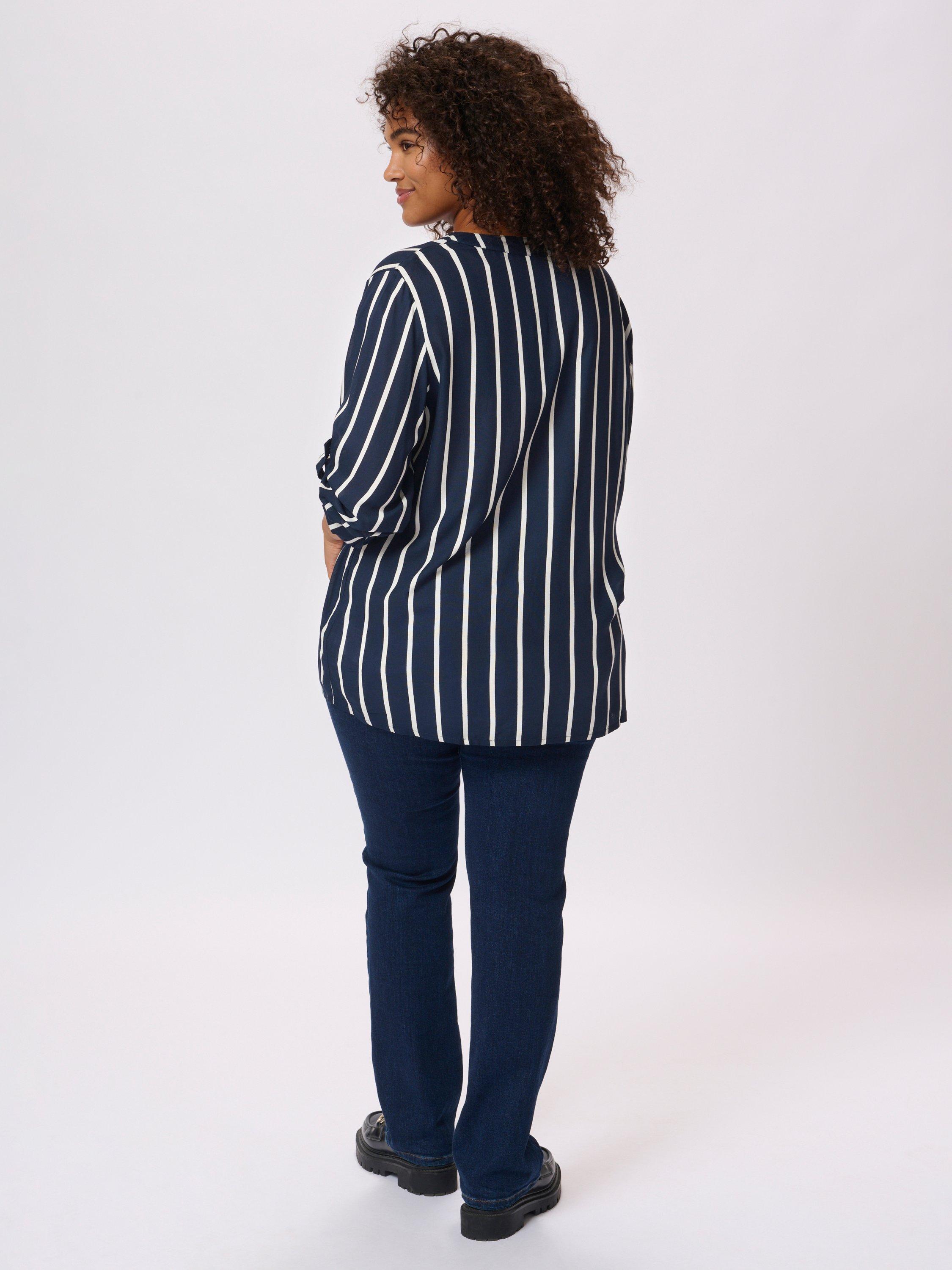 An effortless choice, this blouse from KAFFE Curve is cut with a v-neck, three-quarter length sleeves and boasts classic stripes.